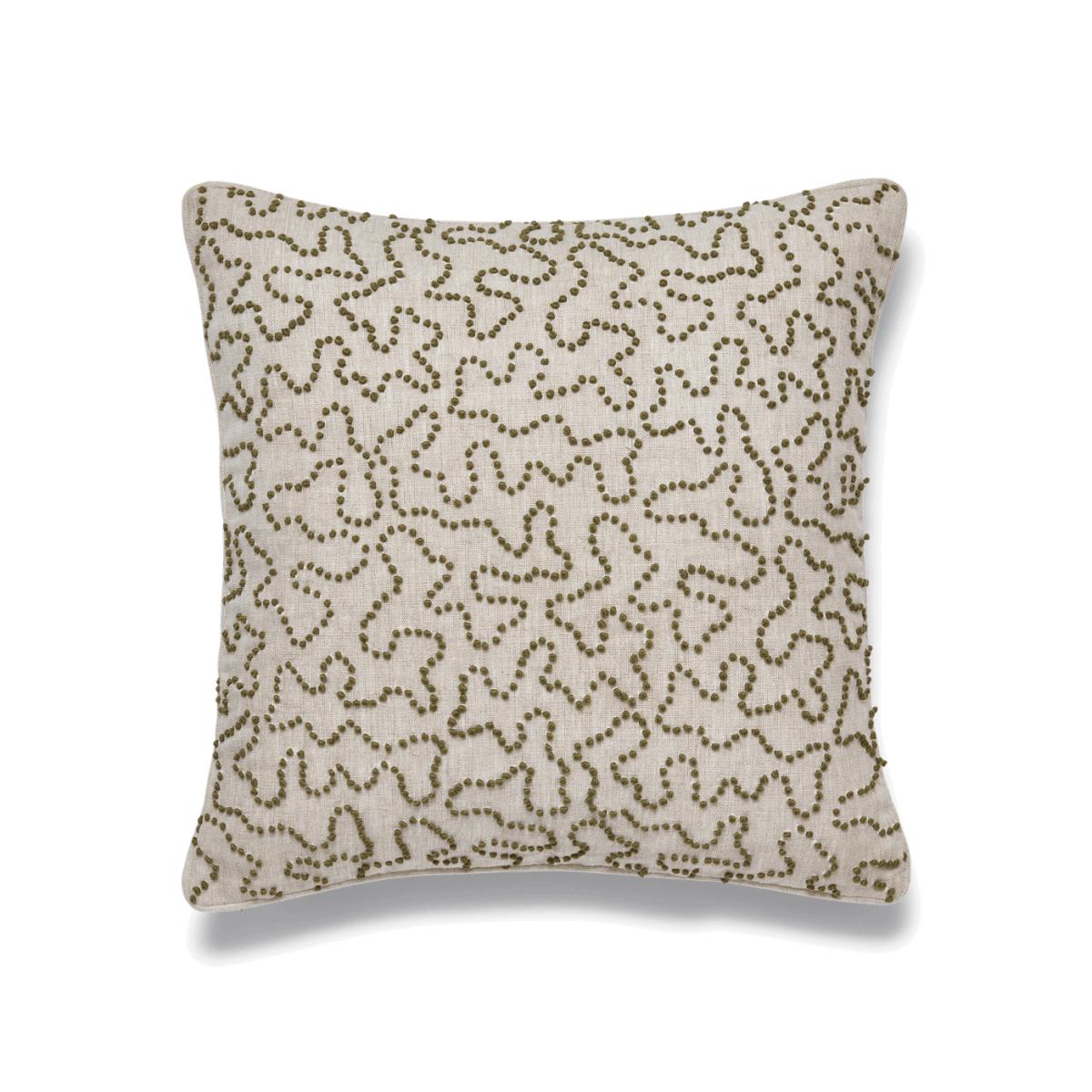 Originally designed by our Co-Founder, Lucinda Waterhouse, the Leptoria design takes inspiration from the abstract patterns found in nature and the ornamental endpapers you would expect to see in antique novels, encyclopaedias and history books. Our latest version is embellished with hand-embroidered French knots giving it a textured finish. All of the embroidery shades chosen for this range evoke those of the natural world; this version is a deep Spruce green. The designs, made from 100% linen, are offset with bold cotton trims.