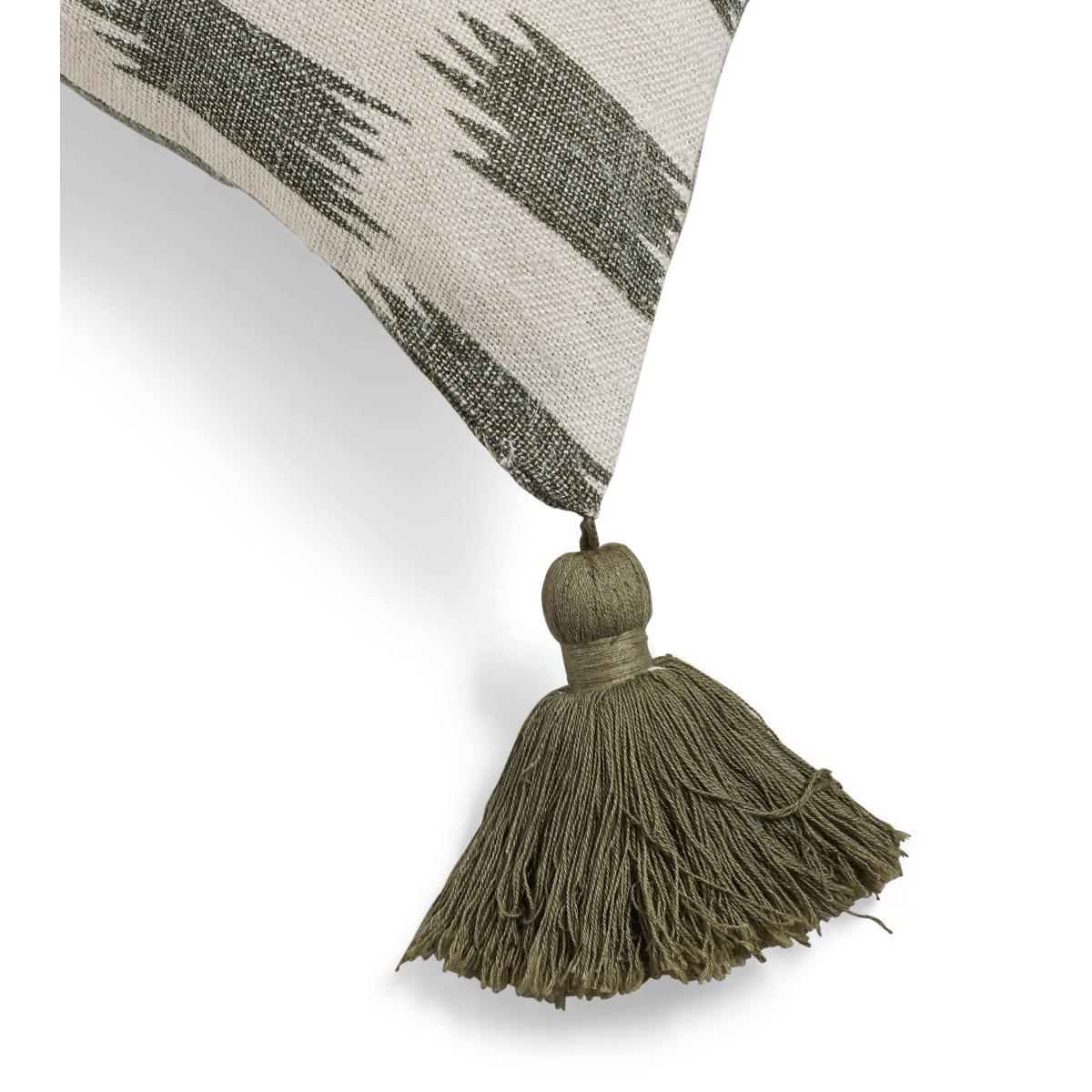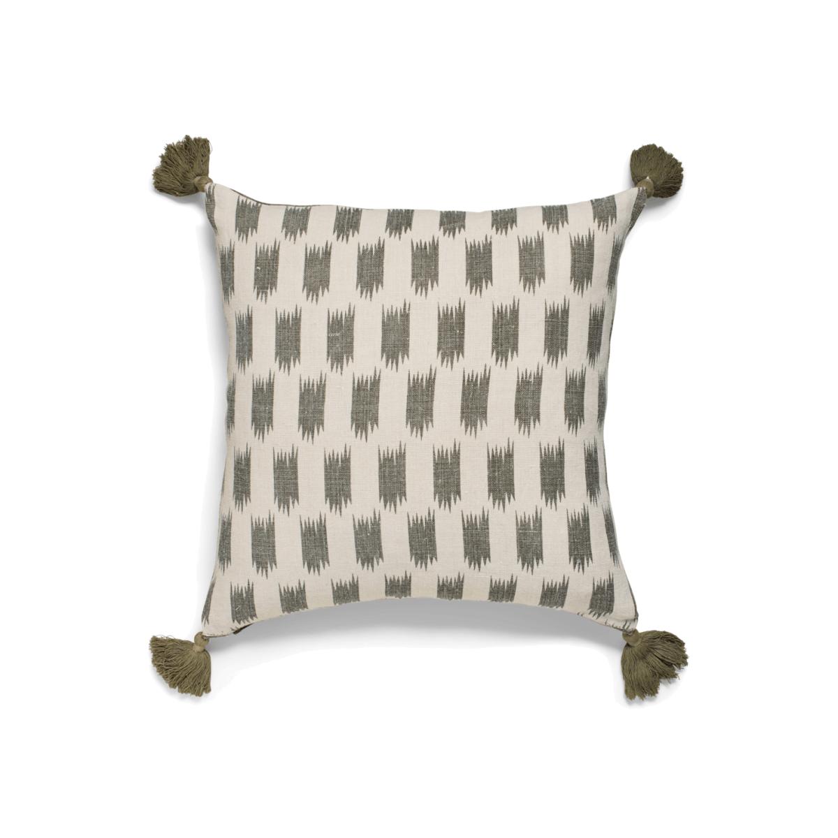 The brushstroke pattern of the Lisbon Cushion Cover is great to add to larger collections. Its simple repeat design in a natural grey-green colourway melds well with many other tones and patterns. Tassled corners add a sense of fun. Each cushion will be unique due to the screen printing and stone washing technique used by the artisan crafters.