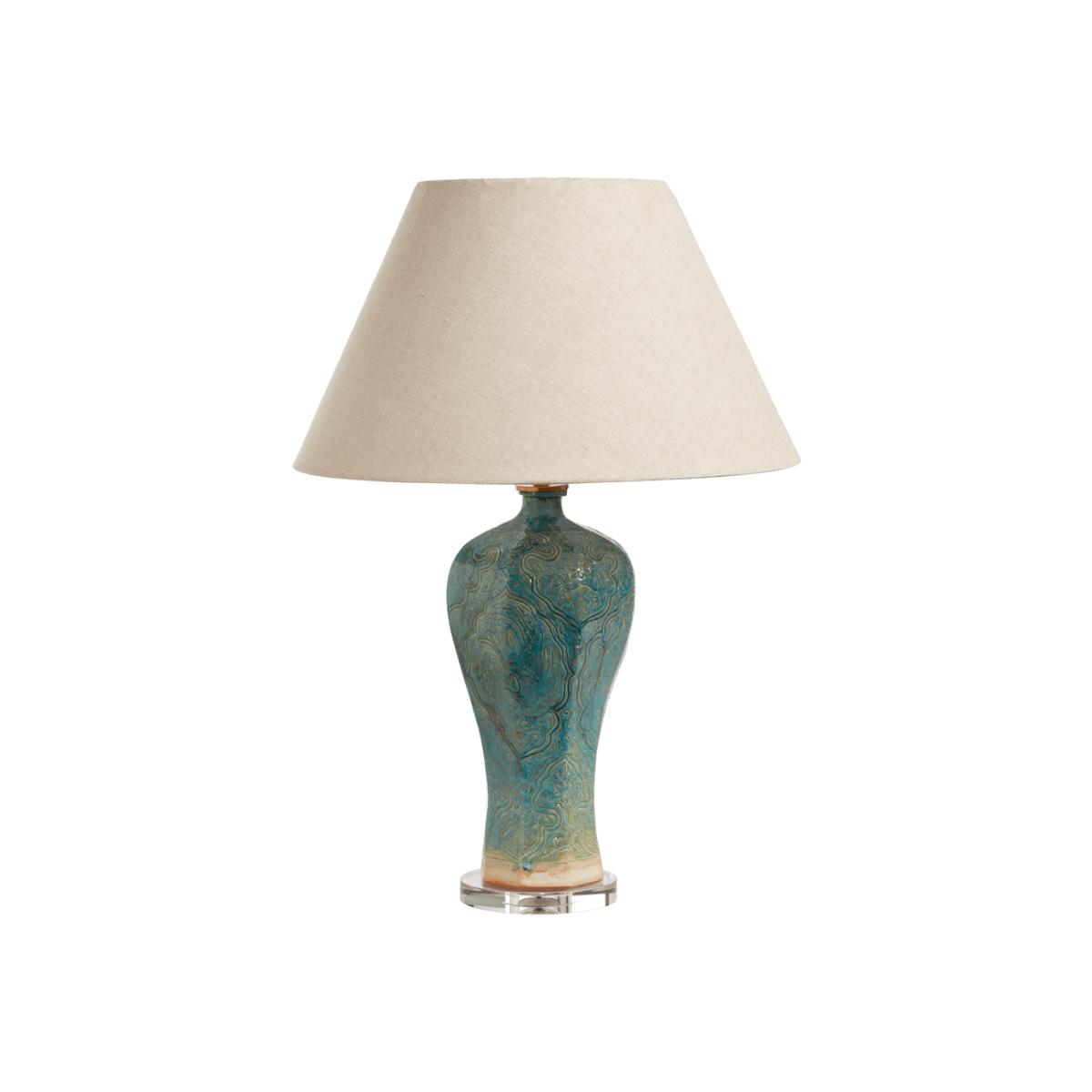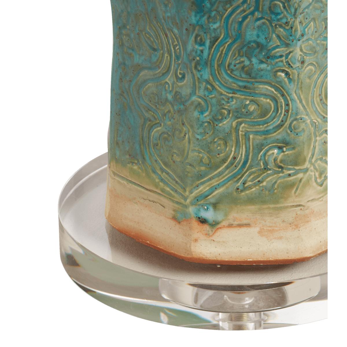 Intricate etchings on the surface of this table lamp work to accentuate the design's green and blue tones; whether you find the patterns evoke a swirling sea or leafy vines, this gently curving lamp certainly has a calming effect.