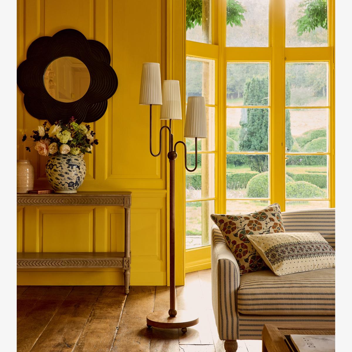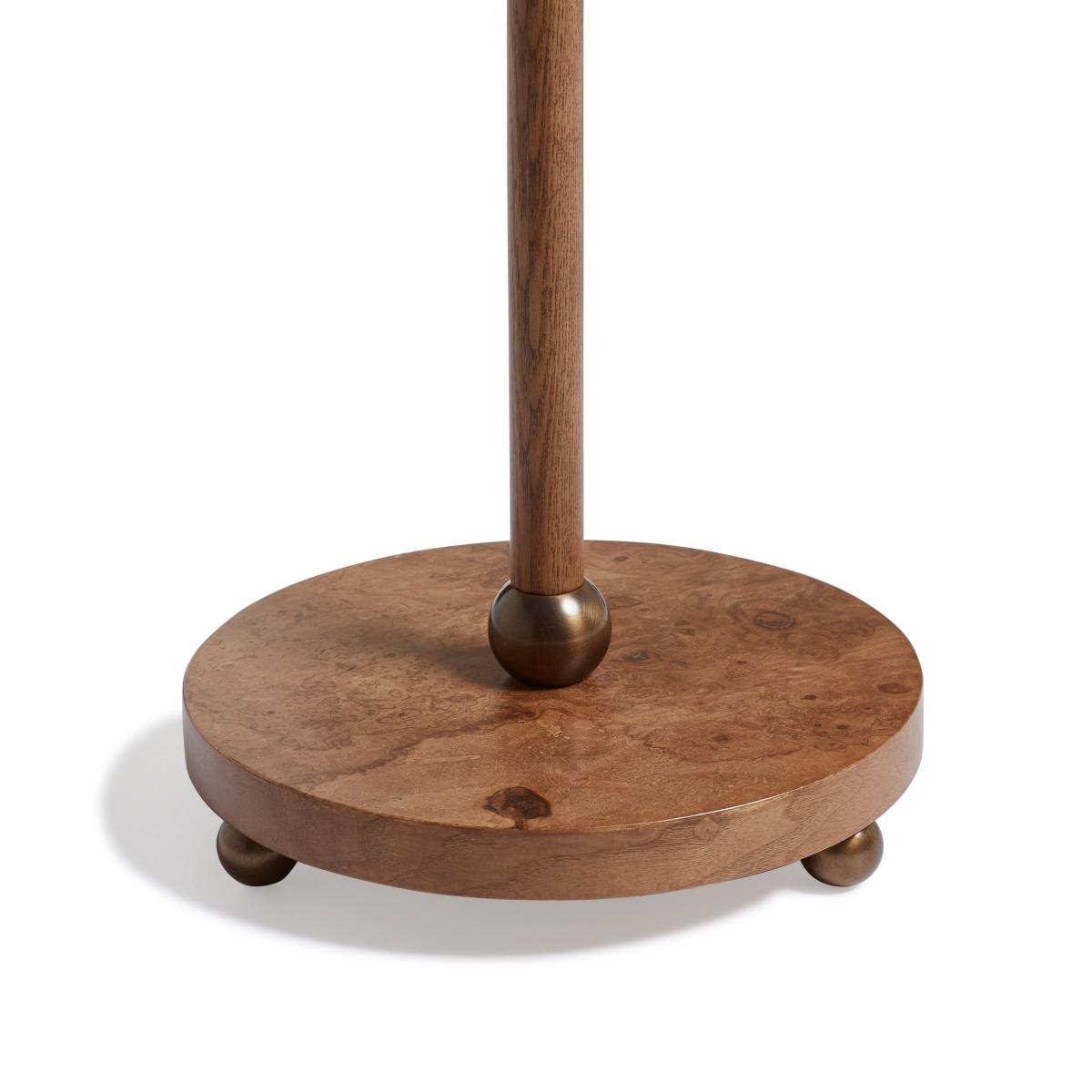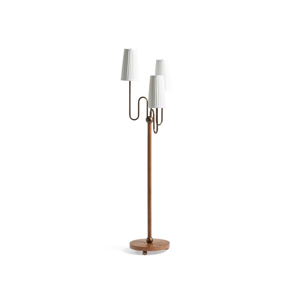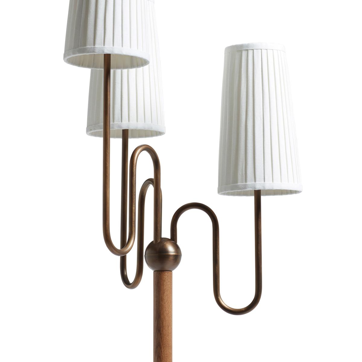 Inspired by an antique found by our Design Director, the playful form of the Lucas Floor Lamp is also incredibly elegant. Narrow hand-pleated off-white linen lampshades sit on a trio of precisely formed antique-brass curving arms that extend upwards to hold the bulbs. These are arranged at staggered heights to encourage the light to climb around the room. The burl wood base sits upon three brass ball feet which complement the piece. Burl wood has a beautiful and unusual grain - this is a cross section of the knots that form on trees, and so features a swirling pattern referred to as a 'wild grain', that requires highly skilled craftsmen in order to cut it without splitting the wood.