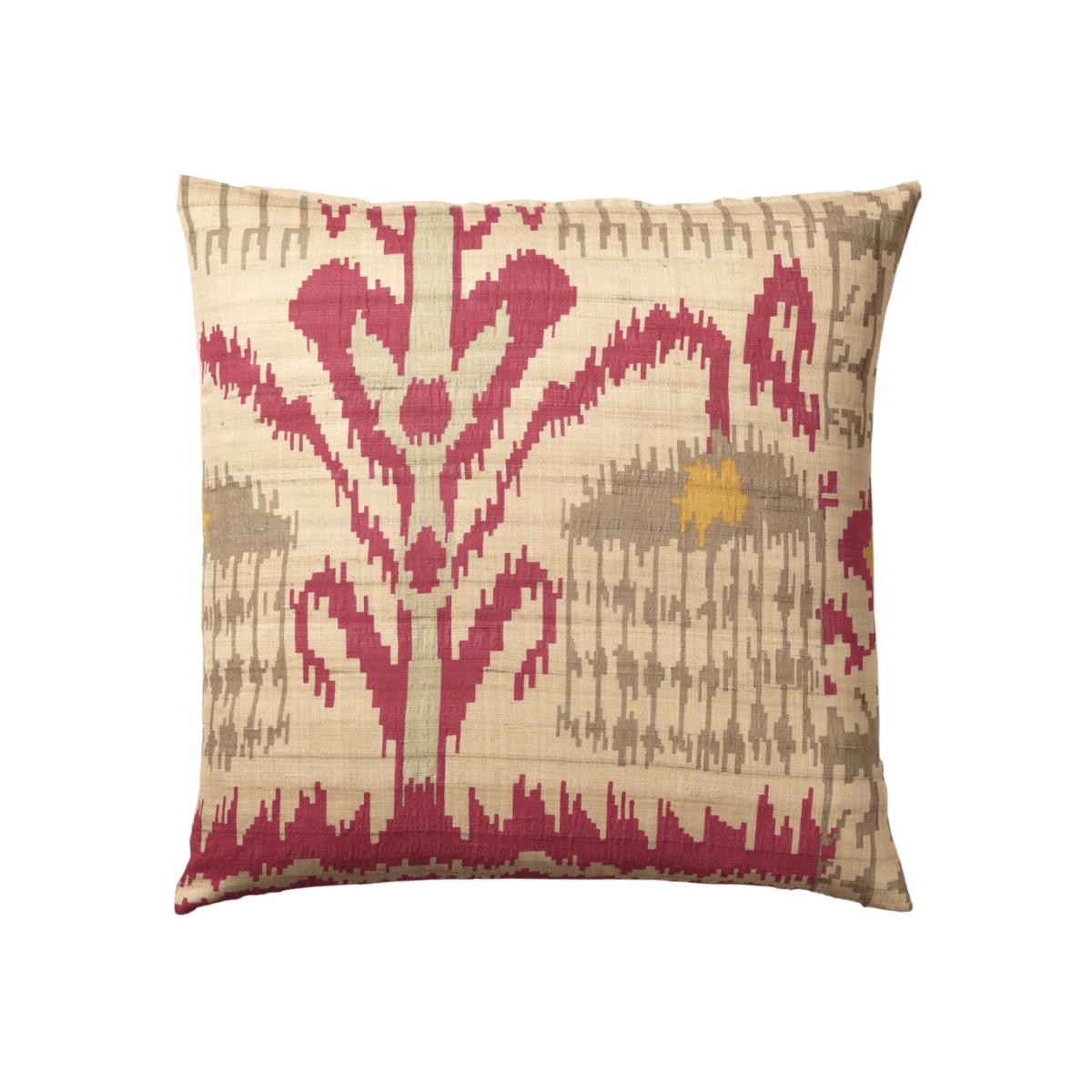 Combining the honey tones of wild tussah silk with the classic deep red, pale green and gold of a traditional Ikat print, our Madura cushions are made using hand-printed fabric, meaning each one is unique. As such, there may be differences in shading and occasional pattern skew which is part of the charm of a handmade product and is not considered a flaw. Please note that slubs, inclusions and small ladders are characteristic of raw silk and part of its natural beauty.