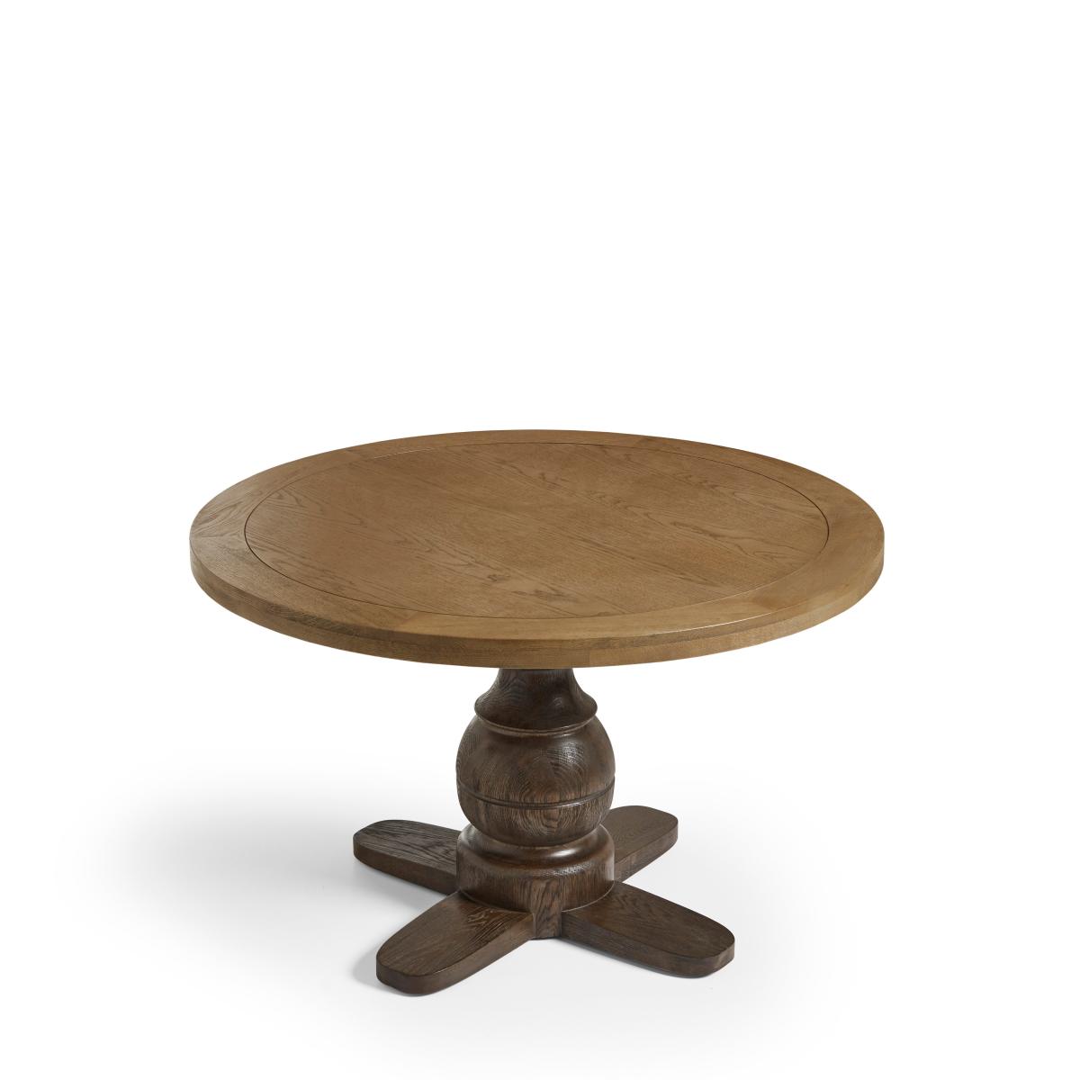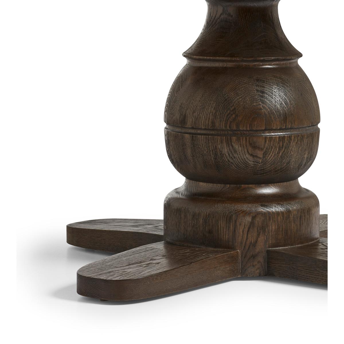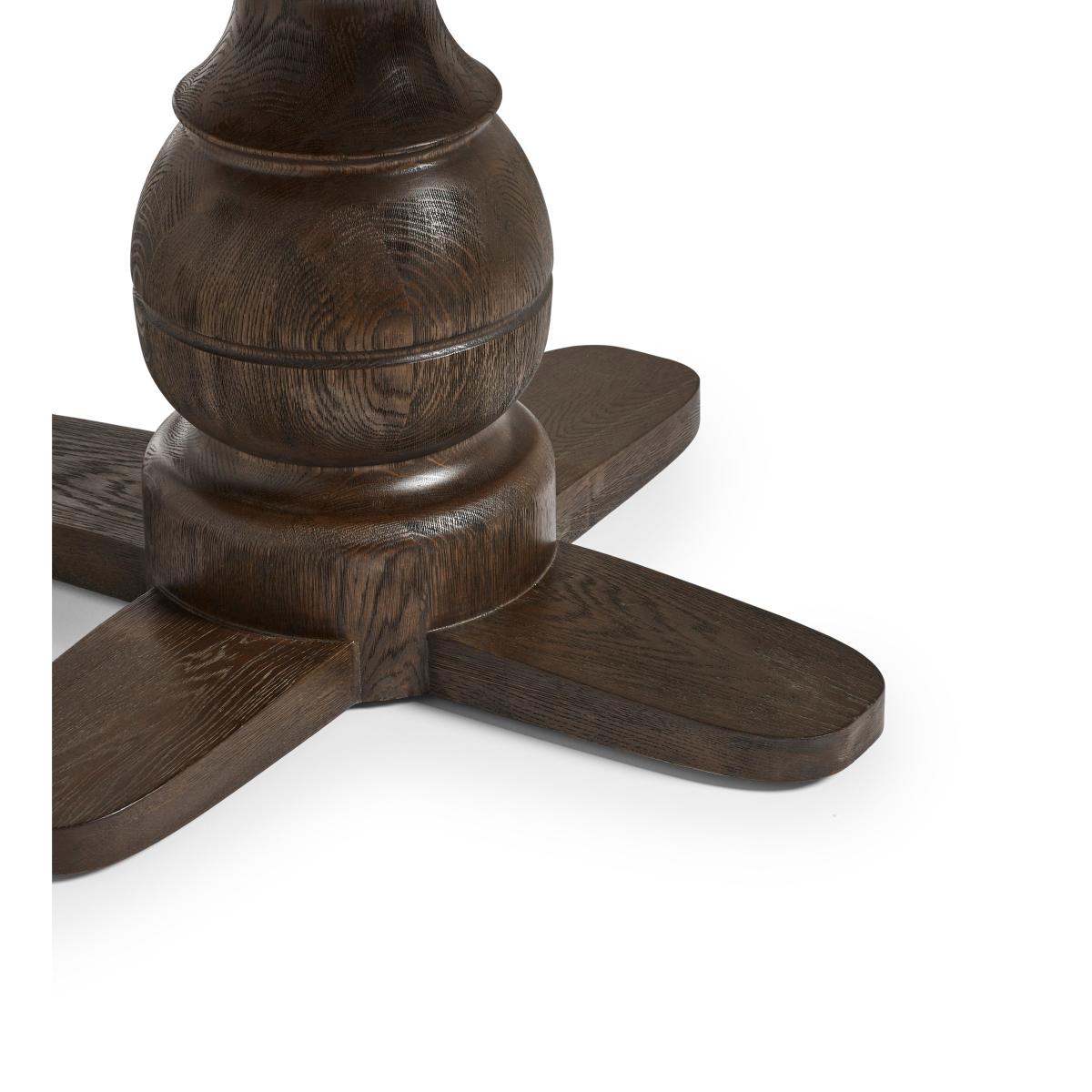 Featuring a solid-oak top in a weathered finish and a contrasting espresso base, the Magnus Dining Table makes for an ice-breaker in any dining room, its circular design enabling up to six people to gather around for lunches, dinners and more. The central pedestal is boldly-turned with a bulbous, rounded form that nods to traditional woodworking techniques. It gives the table a substantial presence while allowing for generous legroom. The contrasting timber finishes help define the base structure and add a two-tone effect to the piece.