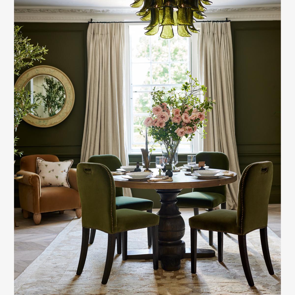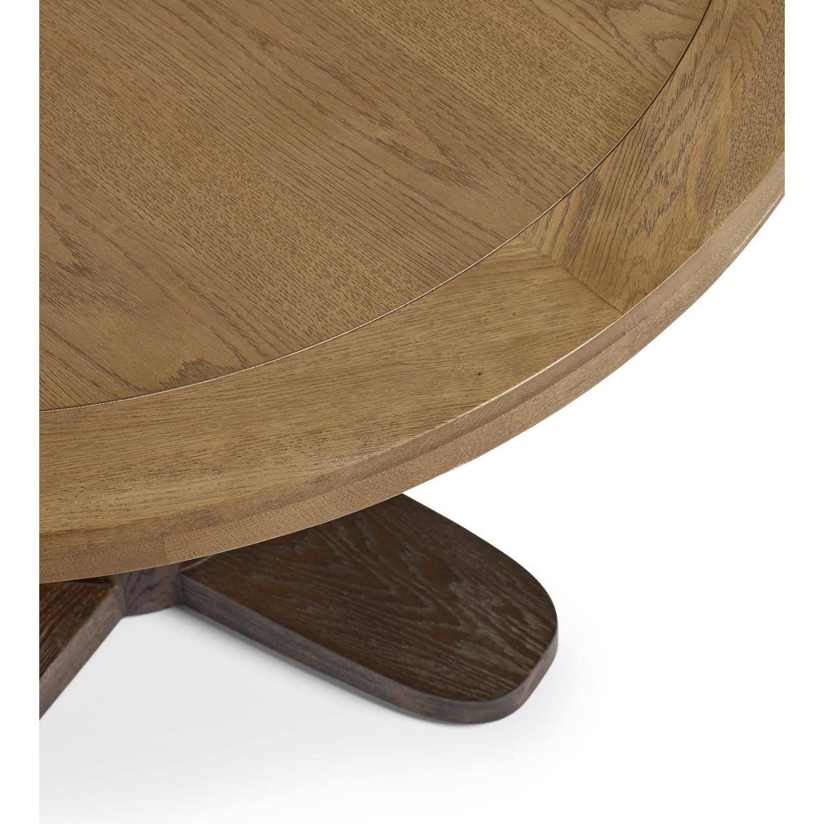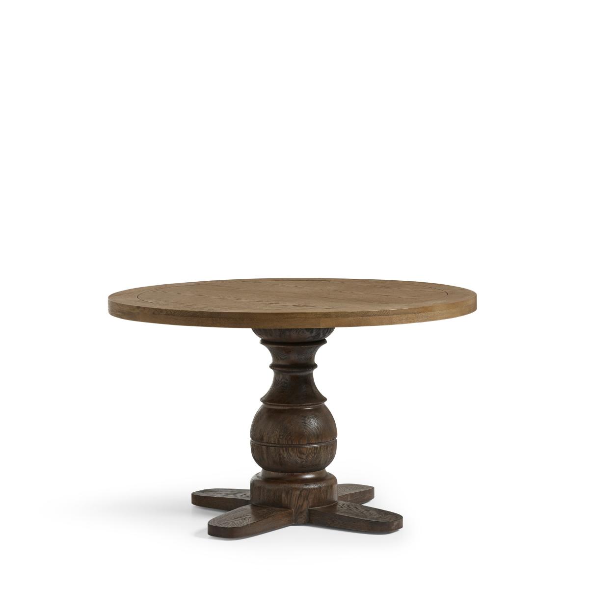 Featuring a solid-oak top in a weathered finish and a contrasting espresso base, the Magnus Dining Table makes for an ice-breaker in any dining room, its circular design enabling up to six people to gather around for lunches, dinners and more. The central pedestal is boldly-turned with a bulbous, rounded form that nods to traditional woodworking techniques. It gives the table a substantial presence while allowing for generous legroom. The contrasting timber finishes help define the base structure and add a two-tone effect to the piece.