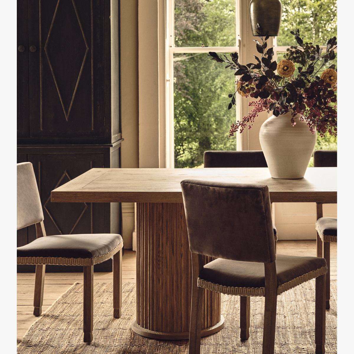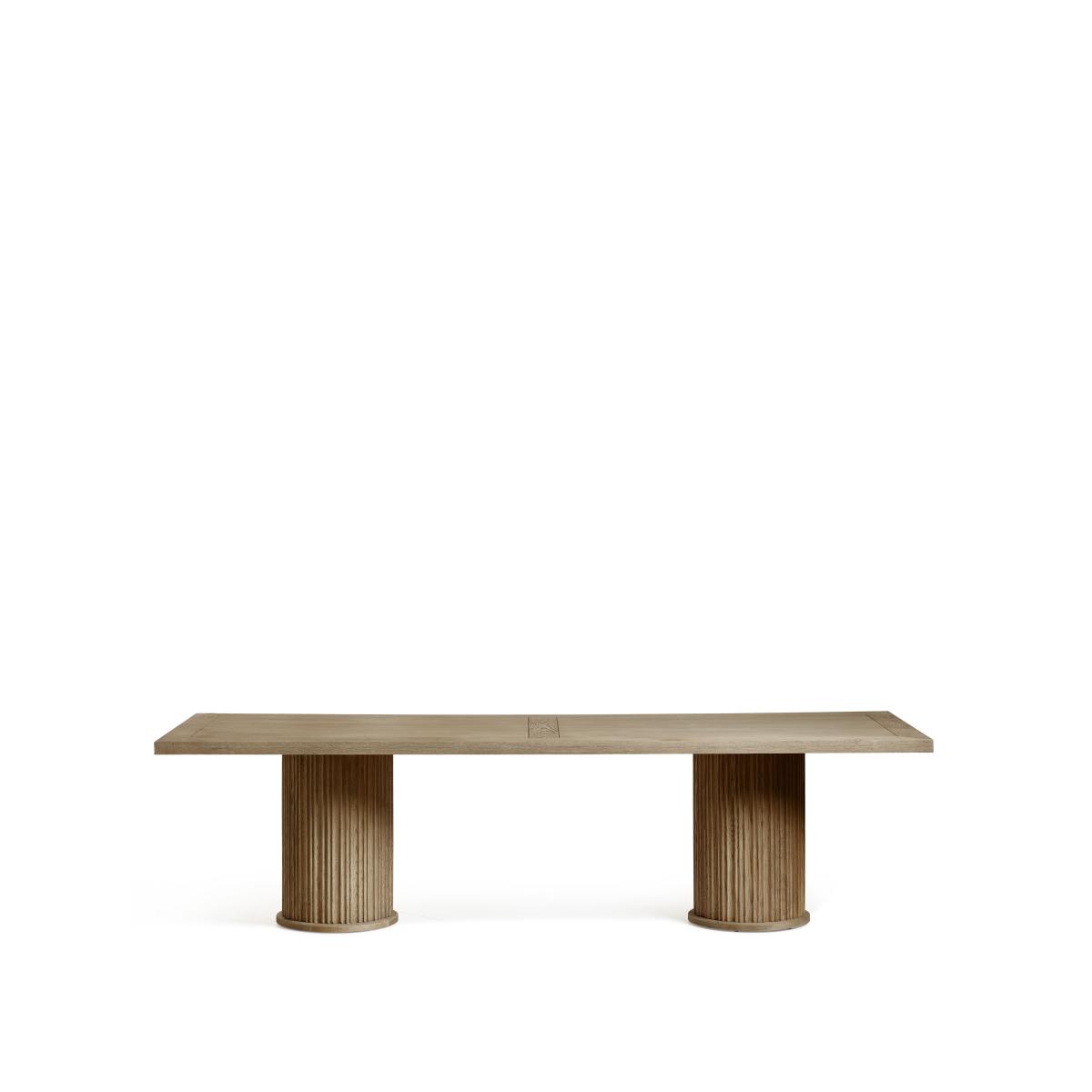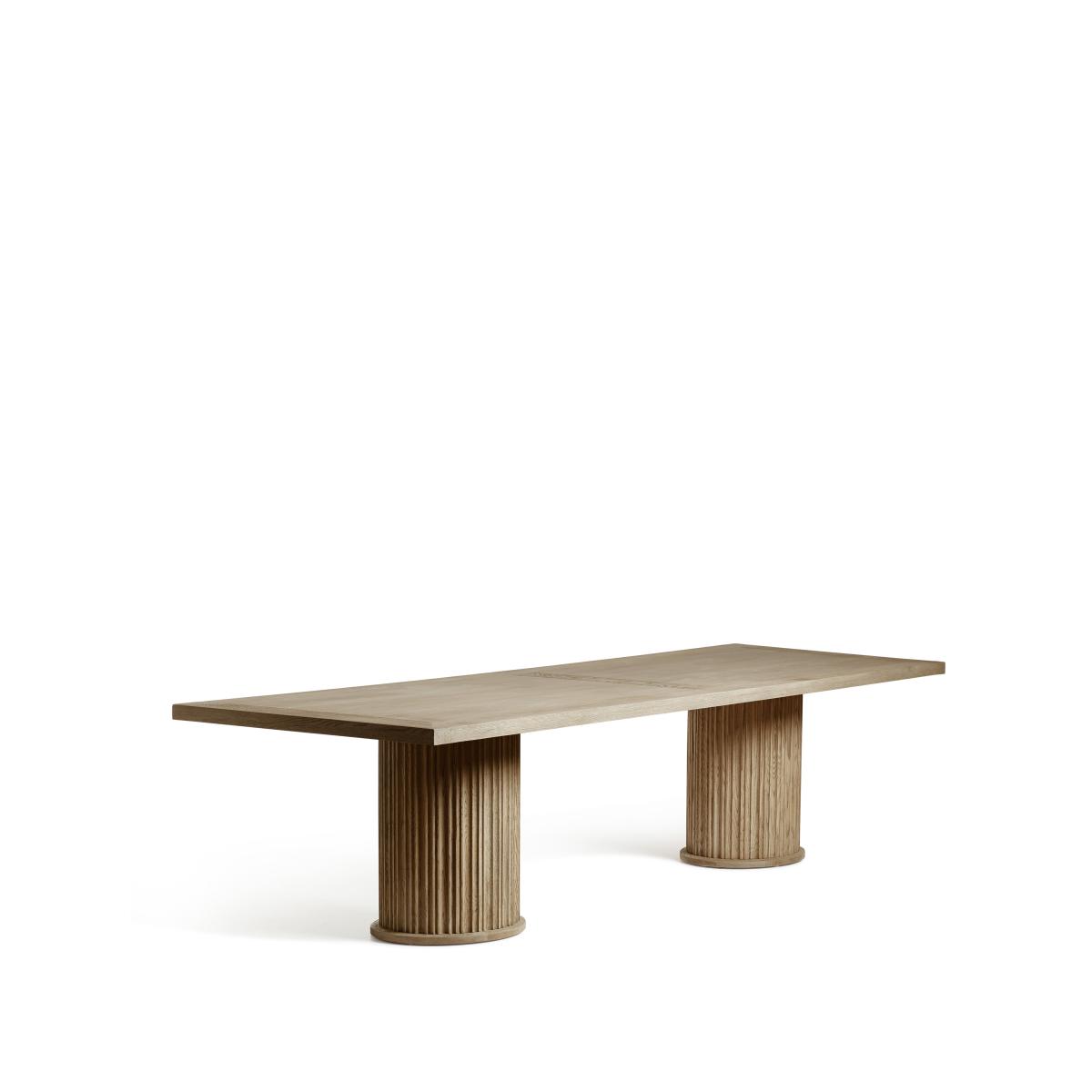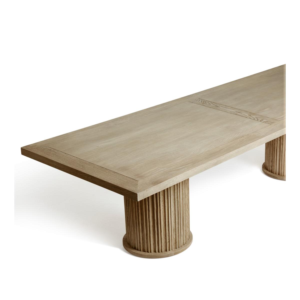 Our Marcus Dining Table features a smart, fluted column base. This is the largest of our three rectangular versions, though it is also available in two round variations. Round tables create a more intimate experience while the linear version is a more traditional choice. All the tops feature an indentation that frames the edge, drawing attention to the character in the textured grain of the oak. This version comes in a light Weathered Oak, but it is also available in a warm Burnt Oak finish.