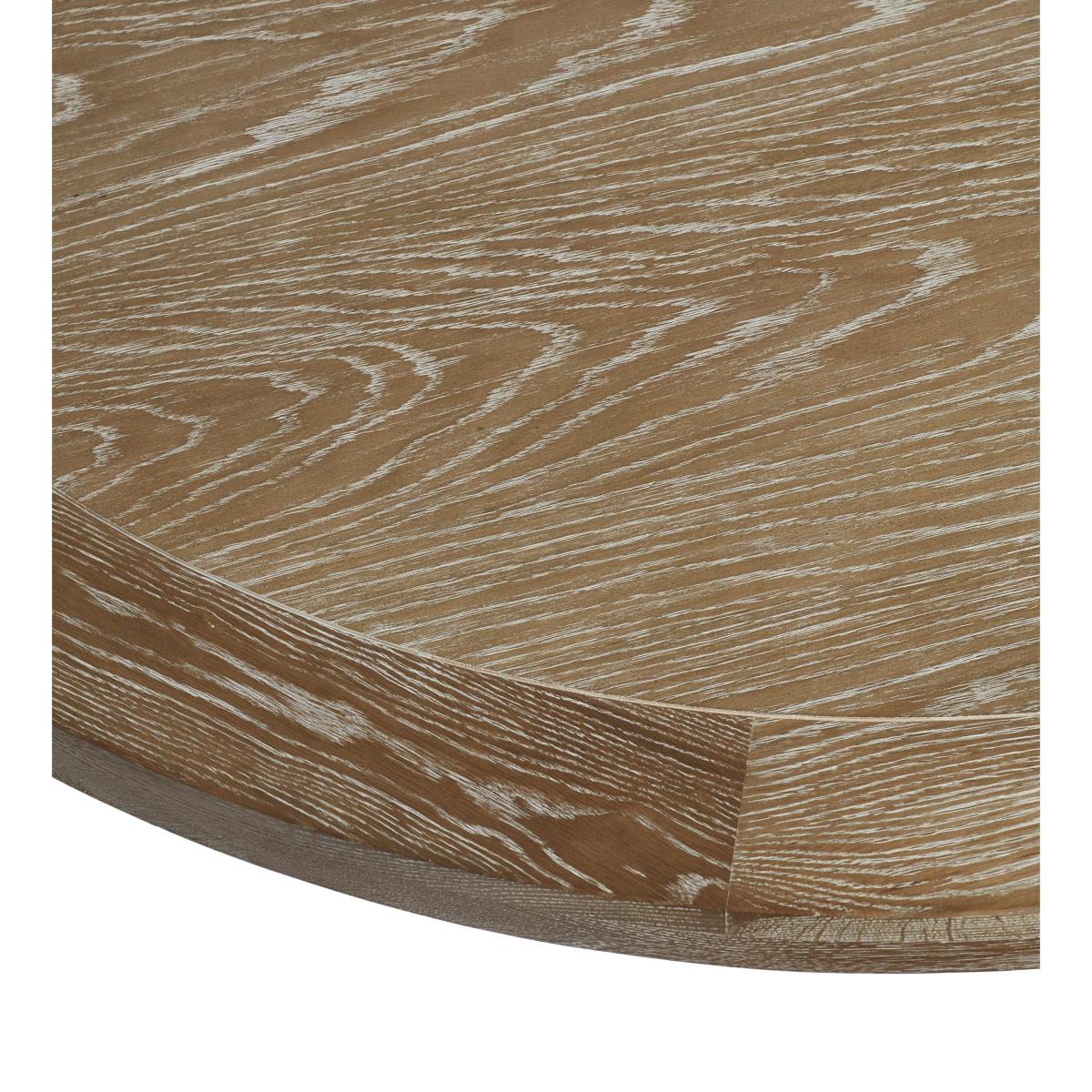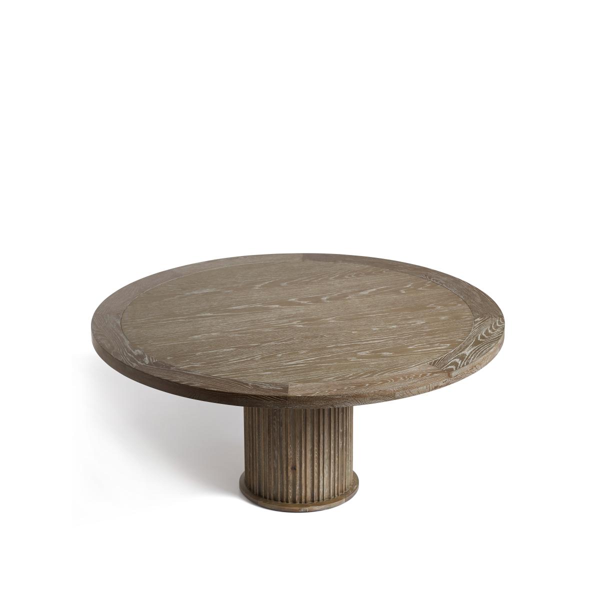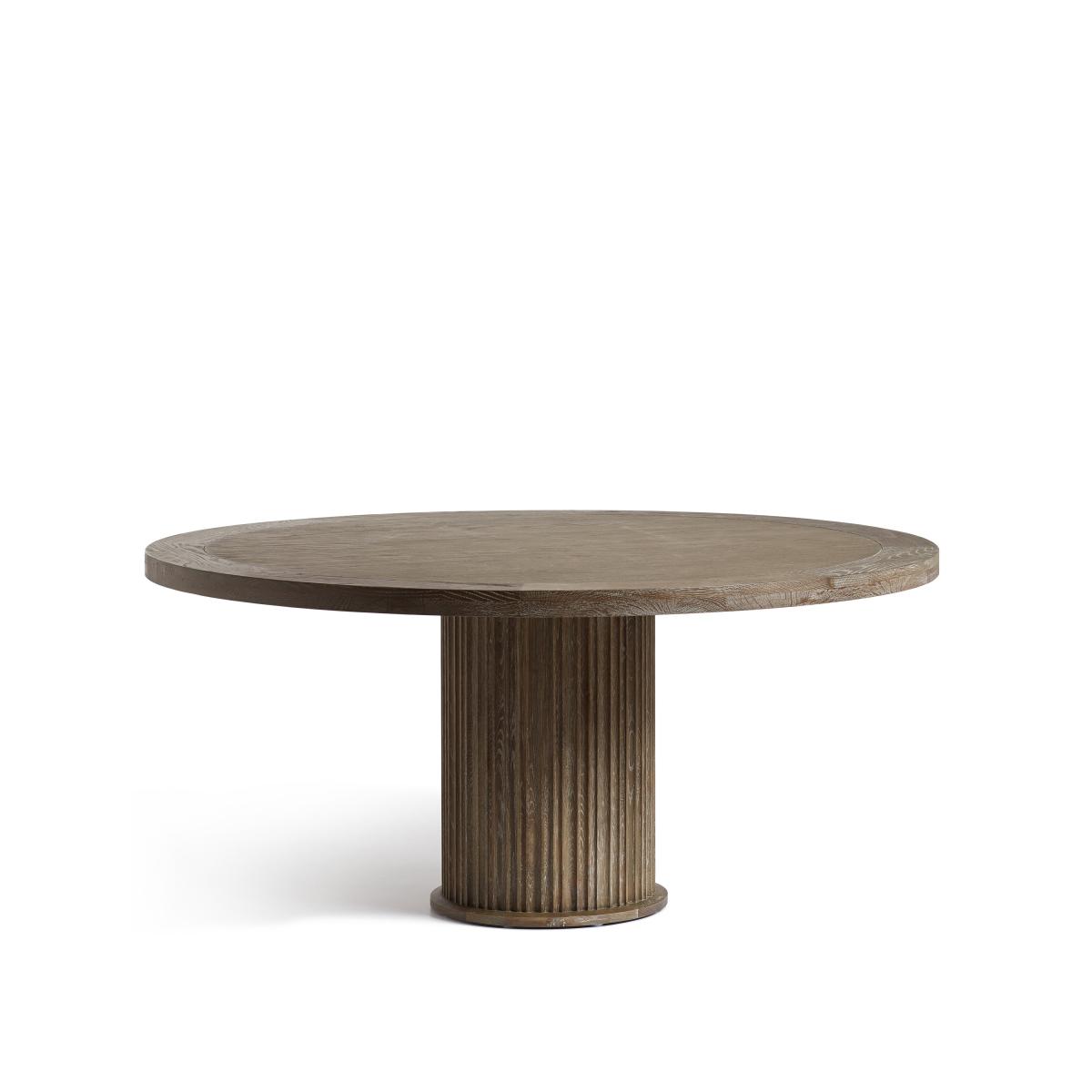 Our Marcus Dining Table features a smart, fluted column base. This is the larger of our two round versions, though it is also available in three rectangular variations. Round tables create a more intimate experience while the linear version is more traditional. All the tops feature an indentation that frames the edge, drawing attention to the character in the textured grain of the oak. This version comes in a warm Burnt Oak, but it is also available in a paler Weathered Oak finish.