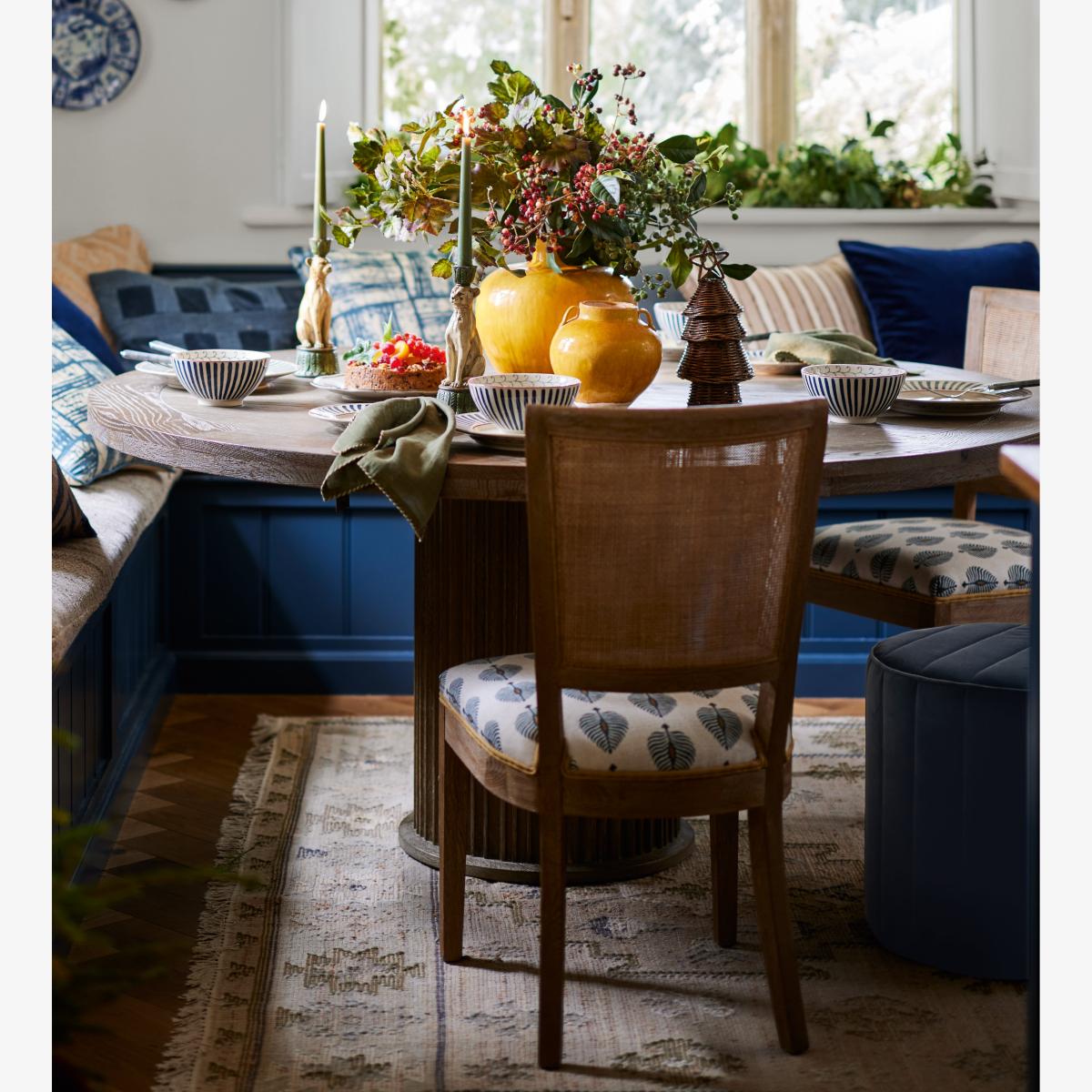 The OKA round dining table, with its burnt oak finish, offers a versatile and warm focal point for both traditional and contemporary interiors. I love it for its generous size, making it ideal for larger gatherings, and its natural wood tone that pairs well with a variety of colour palettes and styles. To style it effectively, consider layering with contrasting textures-such as a soft runner or placemats-and adding colourful or textured centrepieces to bring the space to life. It works particularly well in relaxed, family-focused dining rooms or open-plan kitchens, where its sturdy design and inviting appearance can be showcased alongside a mix of vintage and modern pieces. Practical tips include keeping tableware simple for a pared-back look, and mixing chairs to add visual interest and comfort.