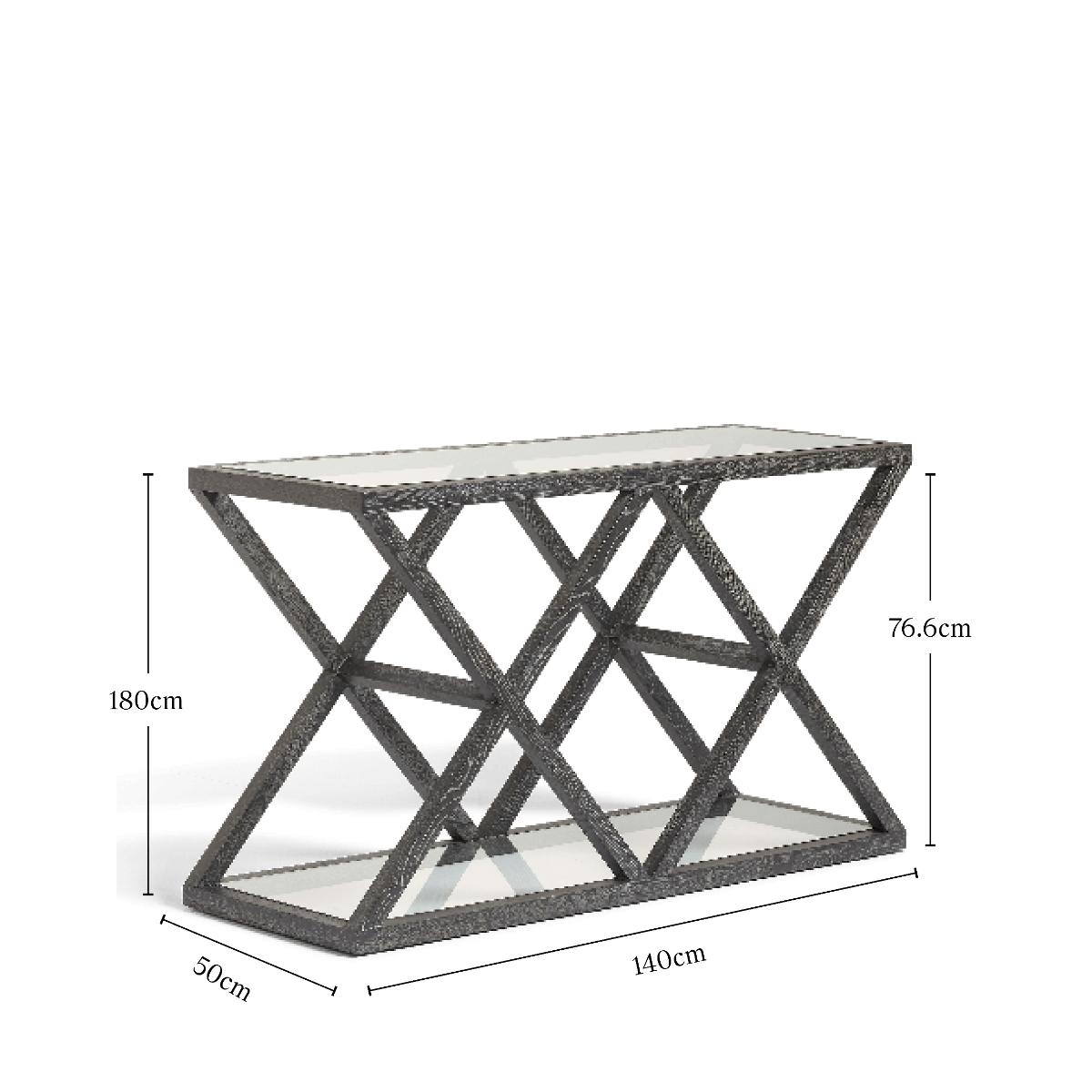 This console table is a fantastic piece for adding a touch of modern elegance to a variety of interiors. I love its clean lines and the contrast between the ebonised oak and the glass top, which makes it quite versatile-perfect in contemporary, minimalist, or even eclectic spaces. It works well placed in a hallway or behind a sofa, where it can function as both a practical surface and a decorative element. For styling, consider using this piece to display a selection of curated objects like vases, books, or artwork, allowing its architectural structure to shine. Pairing it with other dark-toned or textured accessories can enhance its sleek, sophisticated look, making it a standout yet functional feature in your home.