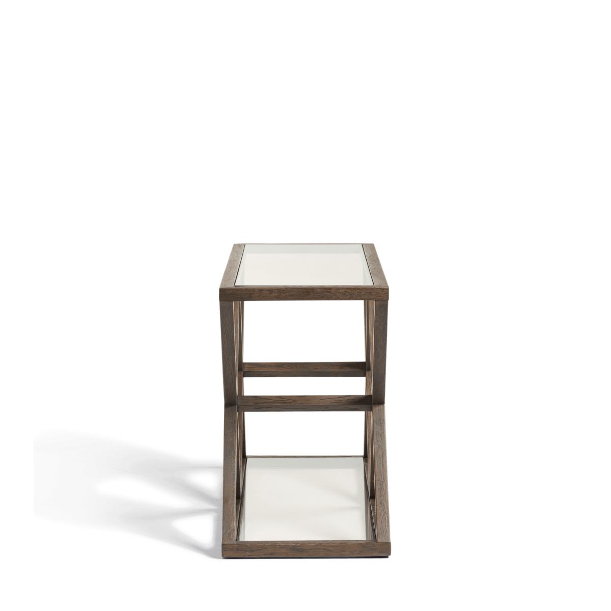 I love this piece for its clean, contemporary lines and versatile design. The espresso finish with a glass and oak combo makes it adaptable across a range of interiors, from modern minimalist to cosy traditional spaces. It's ideal for placing in a hallway or beside a sofa, where its sleek silhouette can double as a display surface or organisational hub. To style it effectively, consider adding a statement lamp, some decorative bowls, or framed photos on top, while the lower shelf offers space for books or plants. Its geometric construction adds visual interest without overwhelming the space, making it a practical yet stylish addition to interiors that aim for a subtle, sophisticated touch.