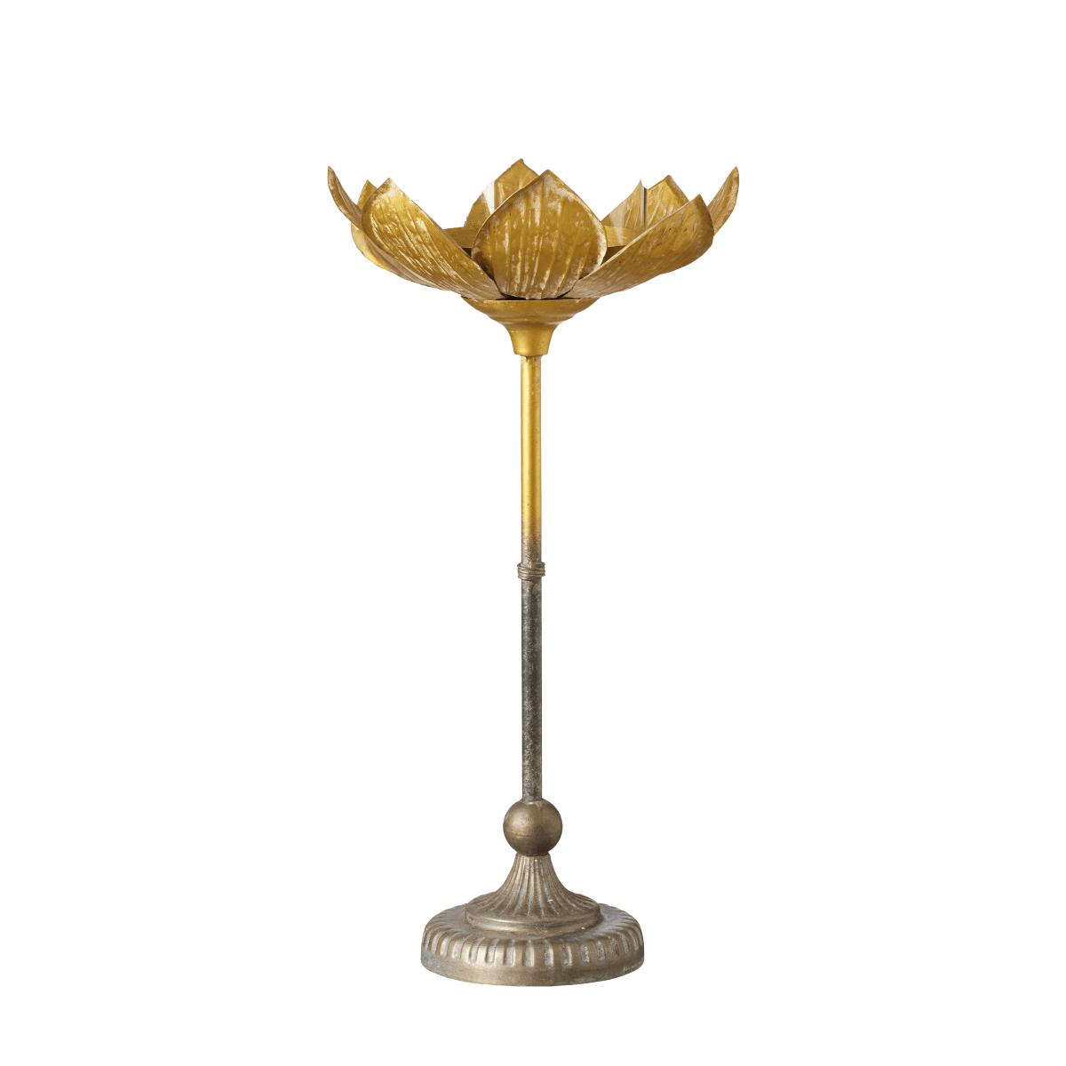 Bring a zen-like calm to your interiors with our Medium Lotus Candle Holder. Crafted from metal and finished to an antique gold ombre effect, this elegant candlestick fits a single candle within its open petals. Use a pair at either end of a console table or mix sizes to add height down the center of a dining table. Suitable for both real and LED candles.