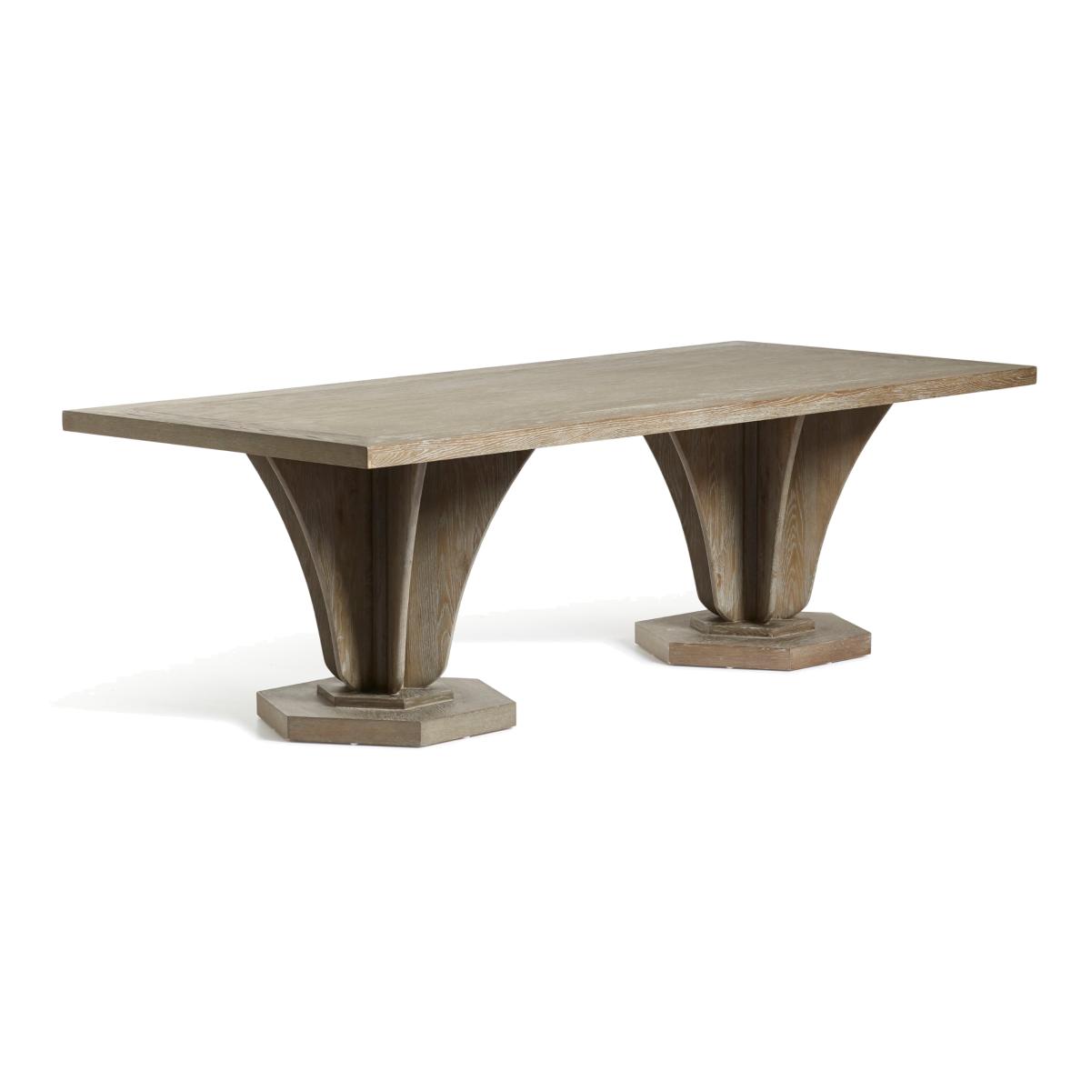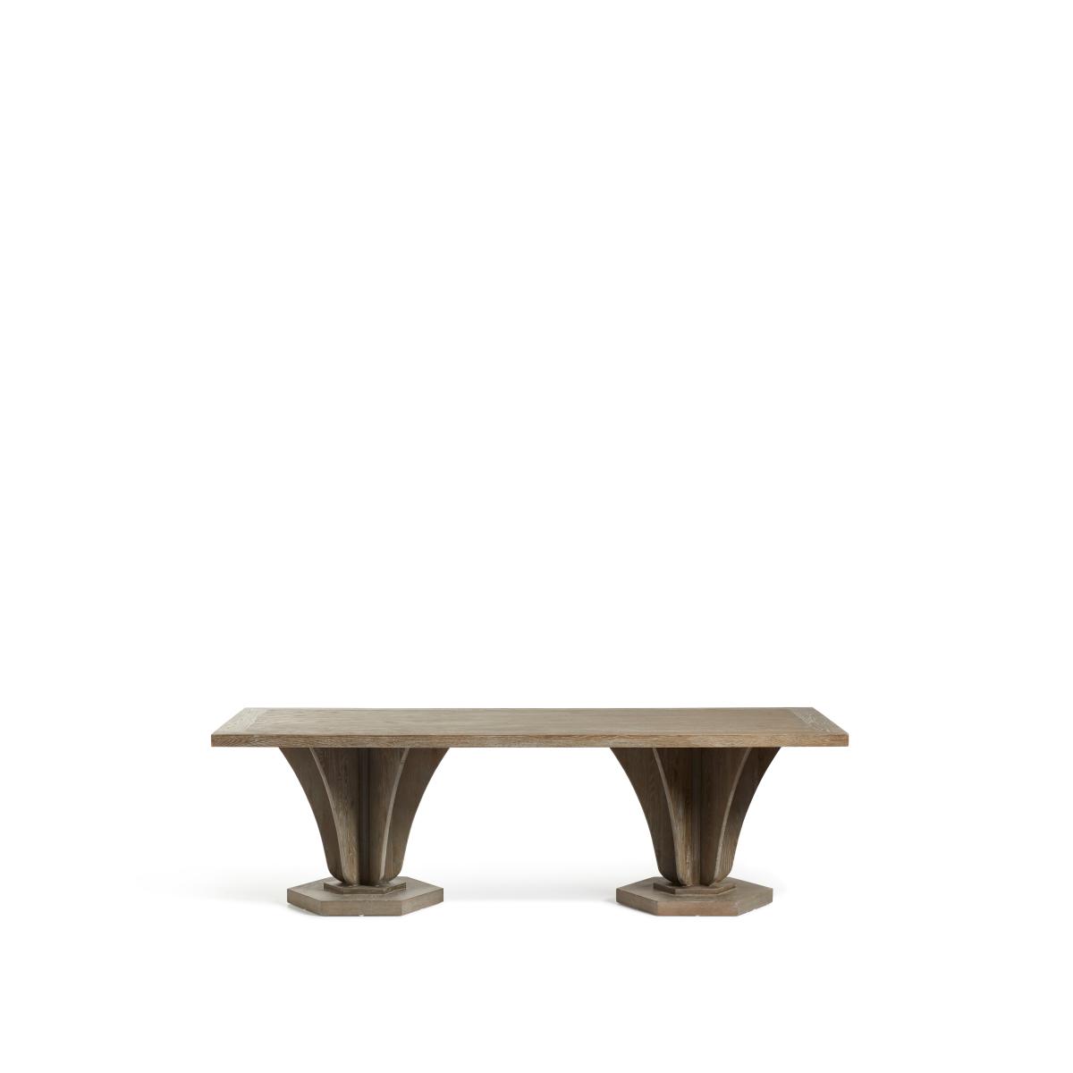 Our Allegro Dining Table features a base that flares upwards and outwards comparably to a gramophone, which lent it its musical name. This is the middle size of our three rectangular versions, though it is also available in two round variations. Round tables create a more intimate experience while the linear version is a more traditional choice. All the tops feature an indentation that frames the edge, drawing attention to the character in the textured grain of the oak. This version comes in a warm Burnt Oak, but it is also available in a paler Weathered Oak finish.