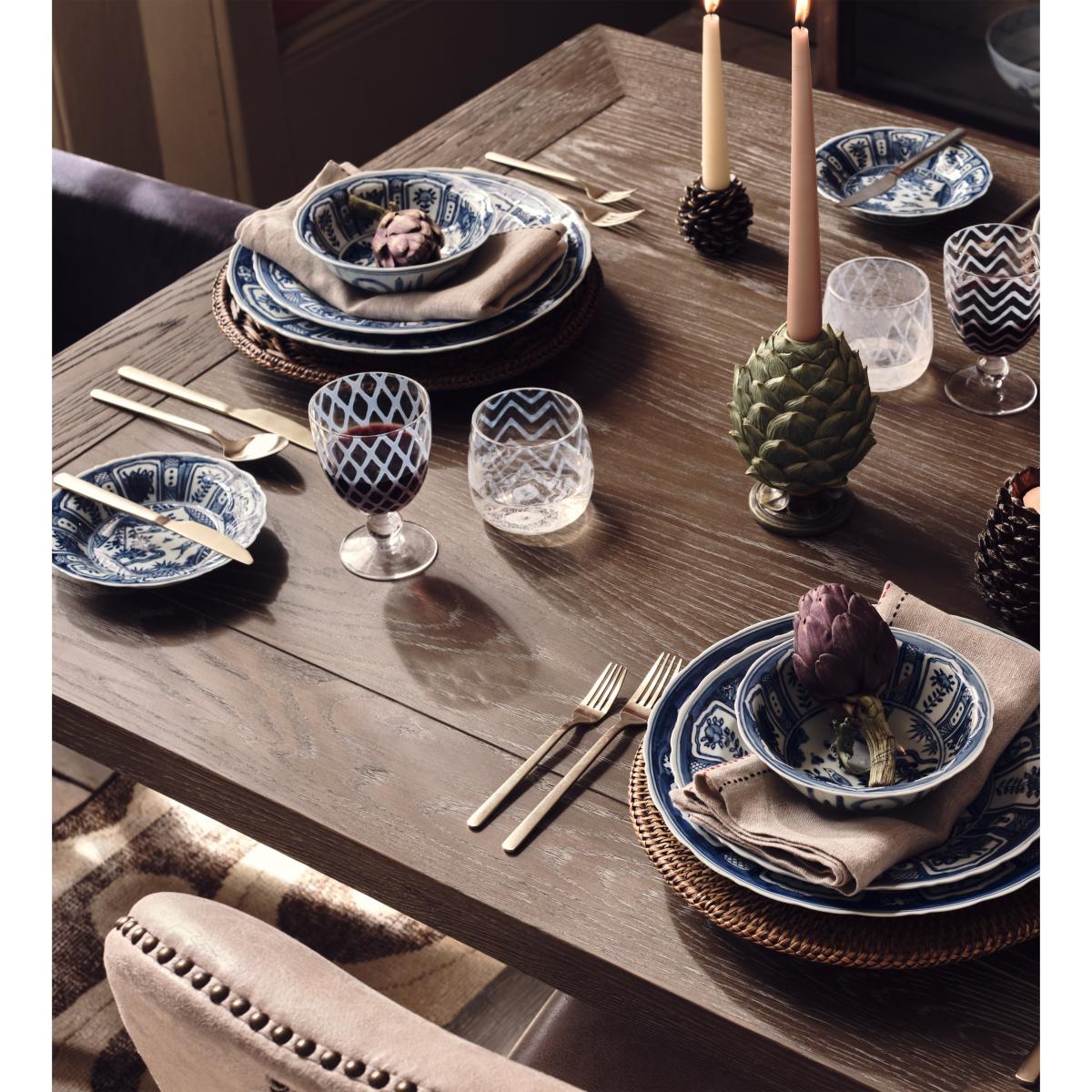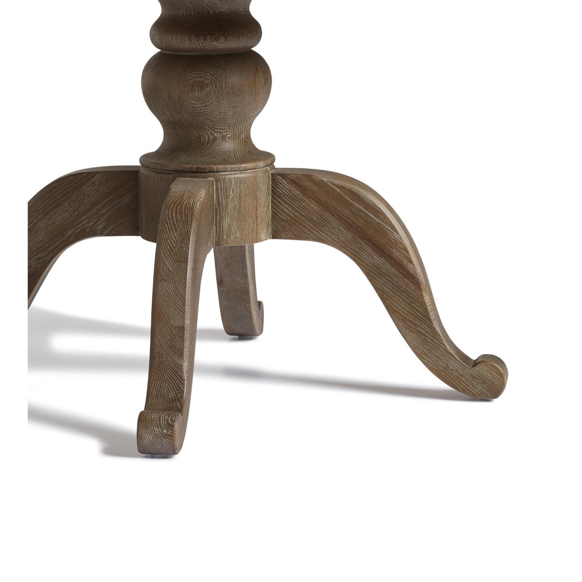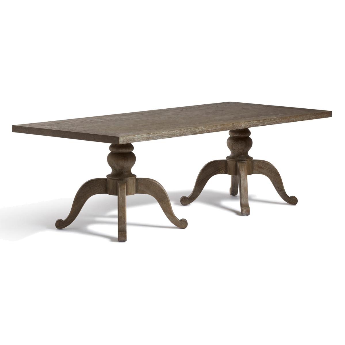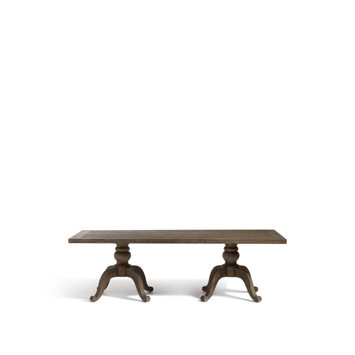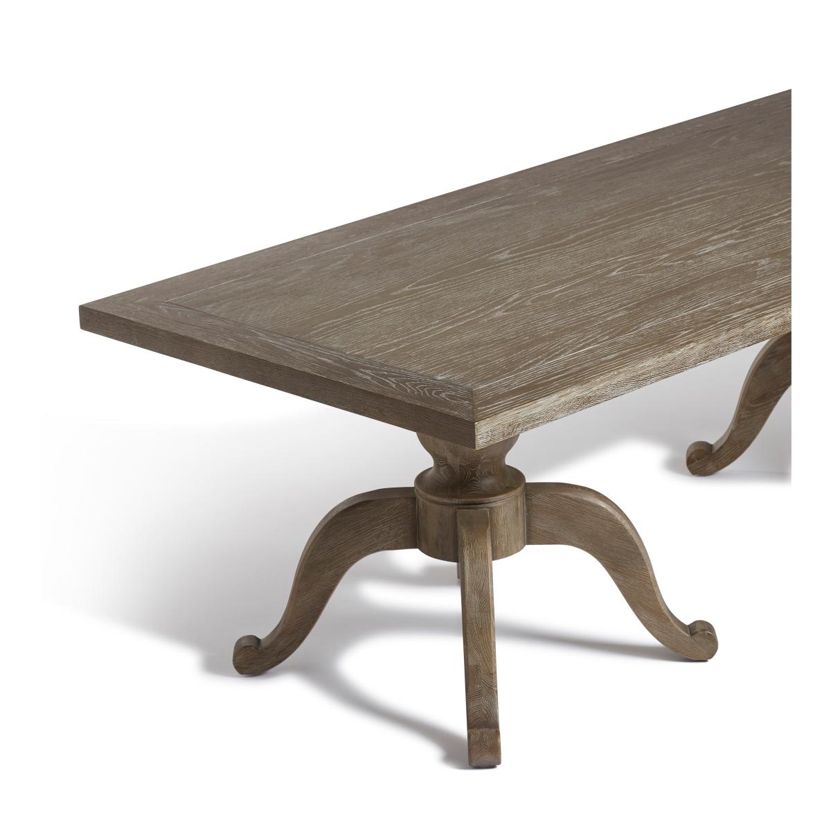 Our Arthur Dining Table features a signature curved pedestal base with tripod-style feet. This is the middle size of our three rectangular versions, though it is also available in two round variations. Round tables create a more intimate experience while the linear version is a more traditional choice. All the tops feature an indentation that frames the edge, drawing attention to the character in the textured grain of the oak. This version comes in a warm Burnt Oak, but it is also available in a paler Weathered Oak finish.