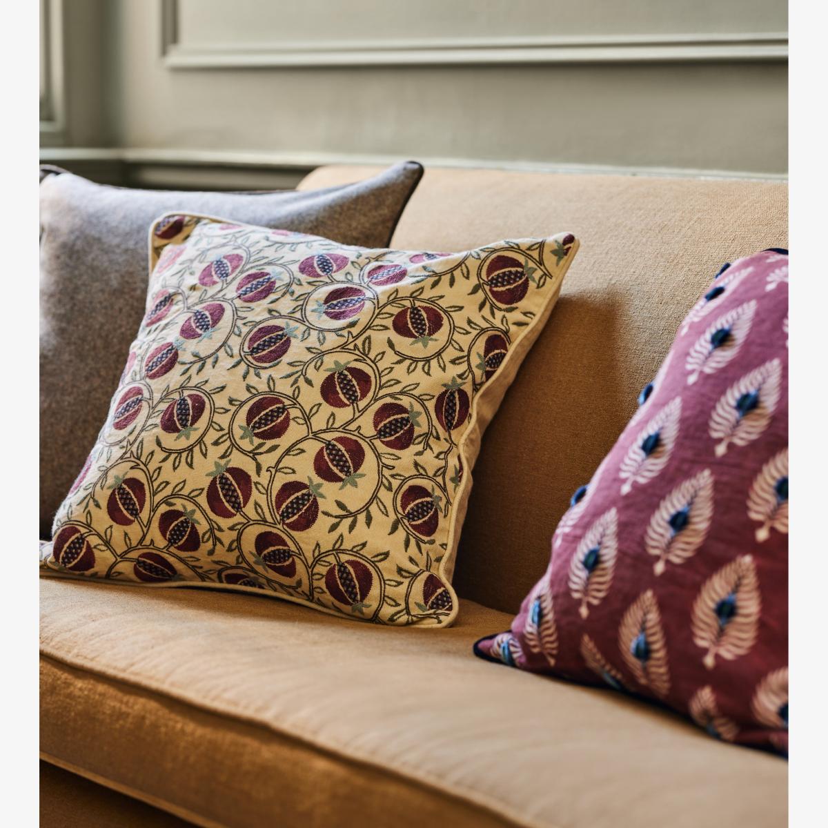 Inspired by traditional Mughal imagery with its depiction of pomegranates, our Melograno Cushion Cover will add character and colour to your interiors. The motif is embroidered on a single side in a blood orange-colourway on soft linen. A blank canvas that allows the pattern to be the star.