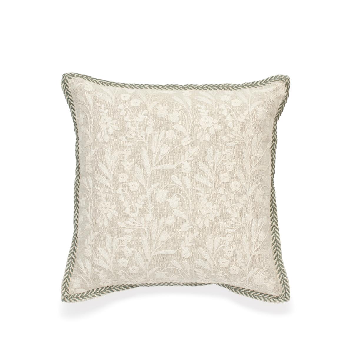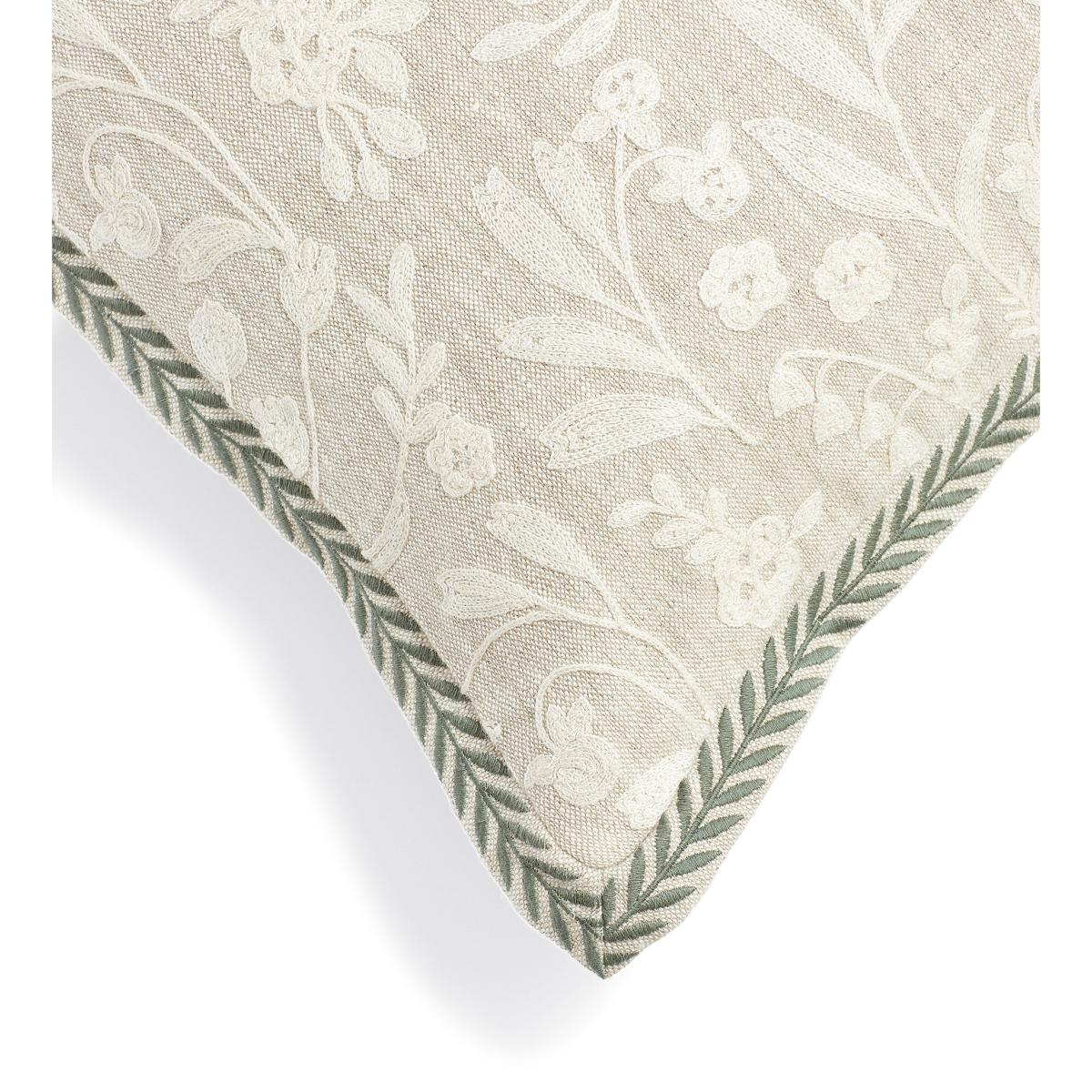 The Merian Cushion Cover features pretty white floral embroidery on its natural linen base. Its flange is finished with a leafy trim that frames the piece in botanical green.