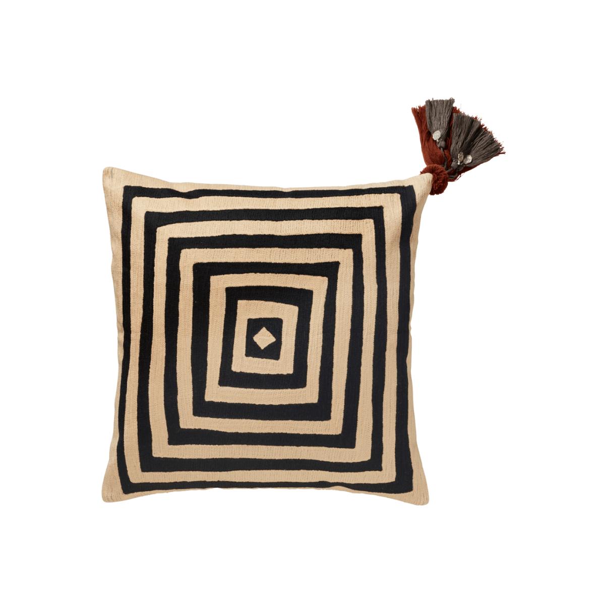 Fall under the spell of our Mesmer Cushion Cover, a handmade, 100% cotton design that's embroidered with a monochrome Op-Art print. The long burgundy and grey tassel with coin detailing – suspended from one of the corners – adds a unique, asymmetric flourish.