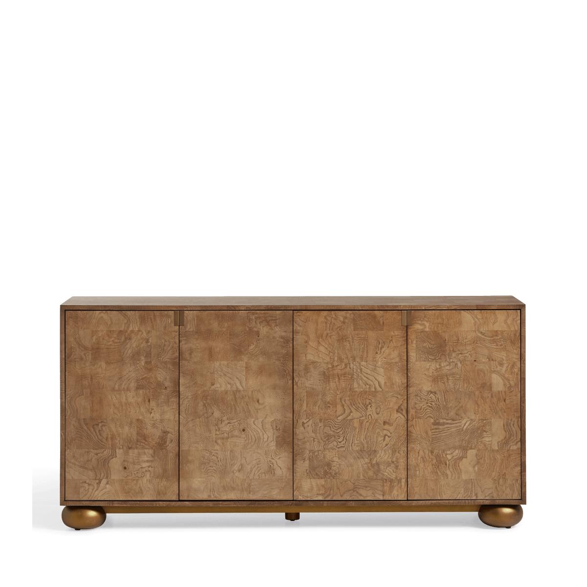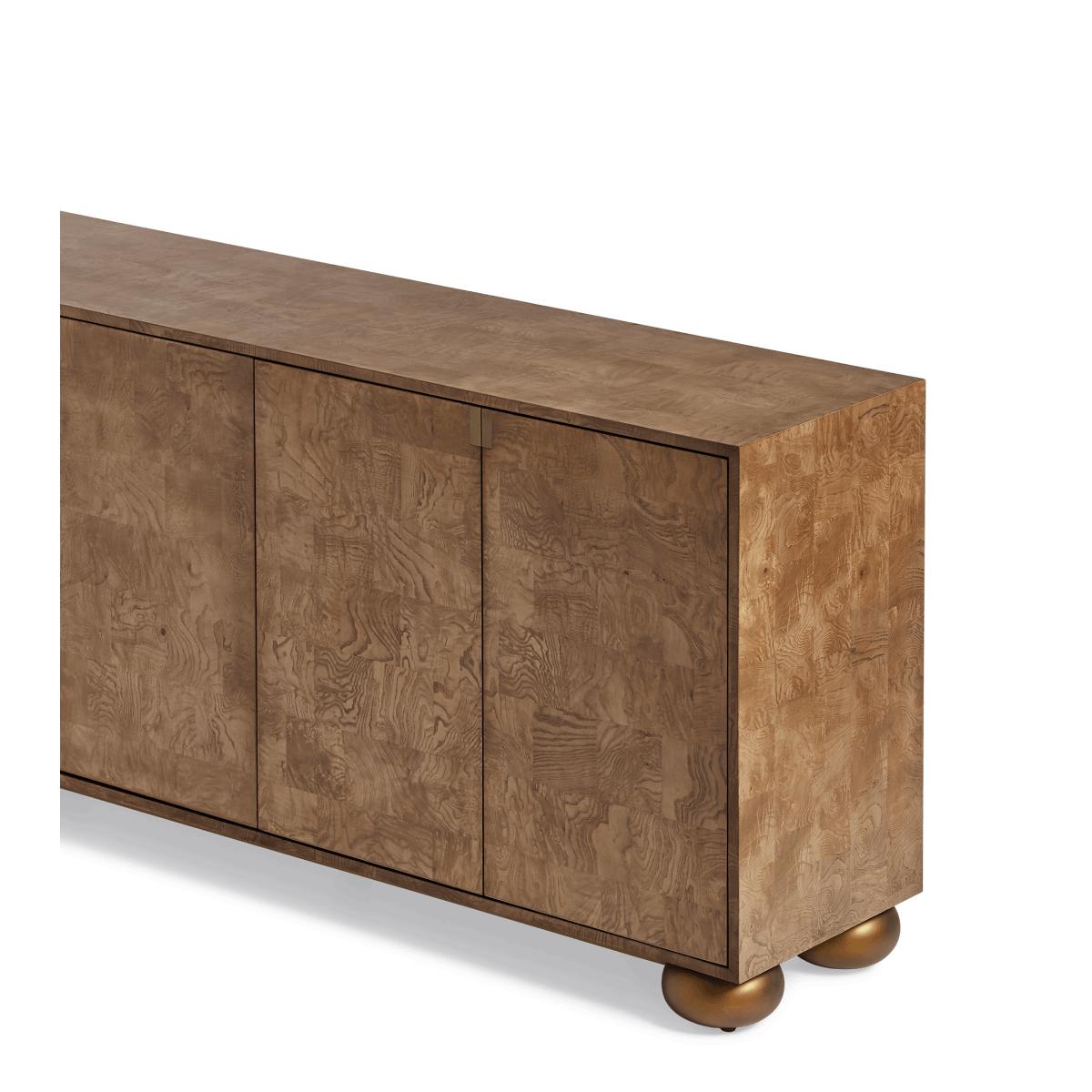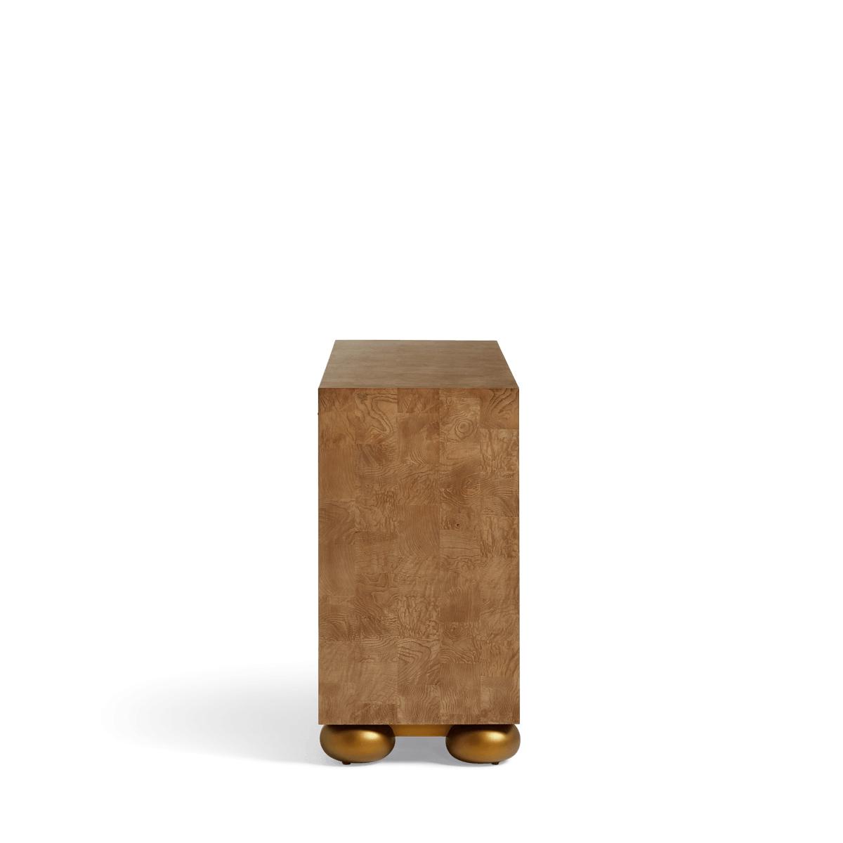 In Greek myth, everything Midas touched would turn to gold, therefore it seemed a fitting name for our Midas Range, with its touches of gold on the bun feet and metal plates at each corner. The beautiful and unusual grain of the wood is produced from highly sought-after burl wood – this is a cross section of the knots that form on trees, and so features a swirling pattern referred to as a ‘wild grain’, that requires highly skilled craftsmen in order to cut it without splitting the wood. Due to the material and artisanal techniques used for this sideboard, each piece will have individual characteristics that add to their charm.