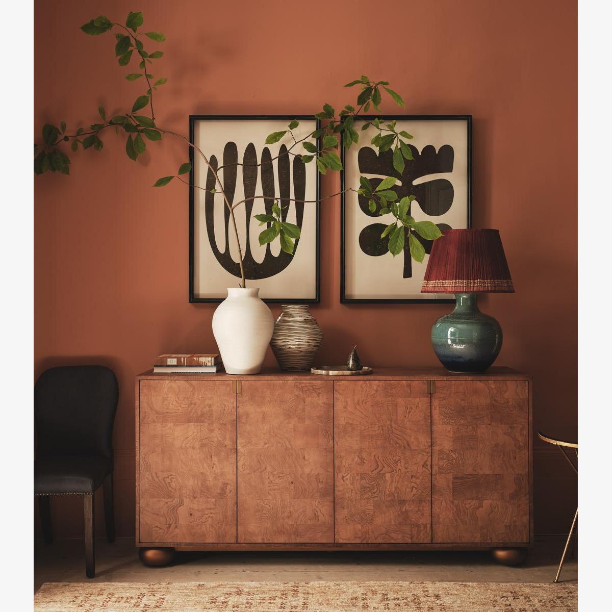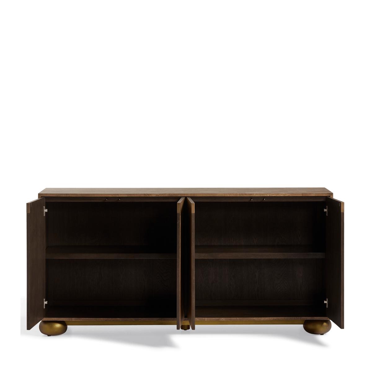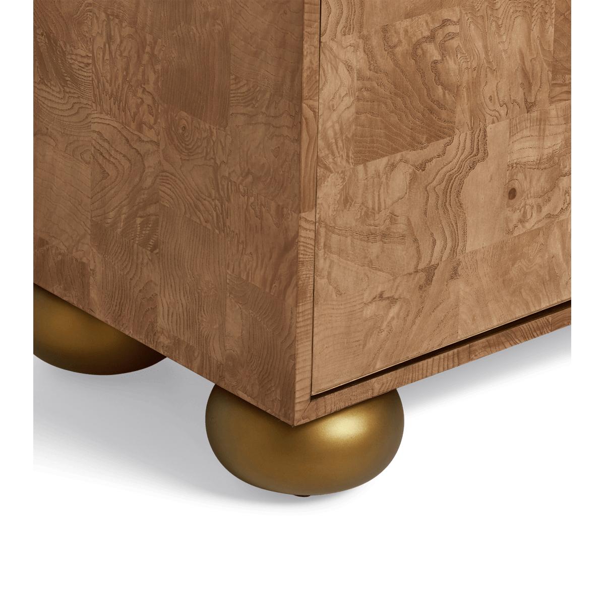 In Greek myth, everything Midas touched would turn to gold, therefore it seemed a fitting name for our Midas Range, with its touches of gold on the bun feet and metal plates at each corner. The beautiful and unusual grain of the wood is produced from highly sought-after burl wood – this is a cross section of the knots that form on trees, and so features a swirling pattern referred to as a ‘wild grain’, that requires highly skilled craftsmen in order to cut it without splitting the wood. Due to the material and artisanal techniques used for this sideboard, each piece will have individual characteristics that add to their charm.