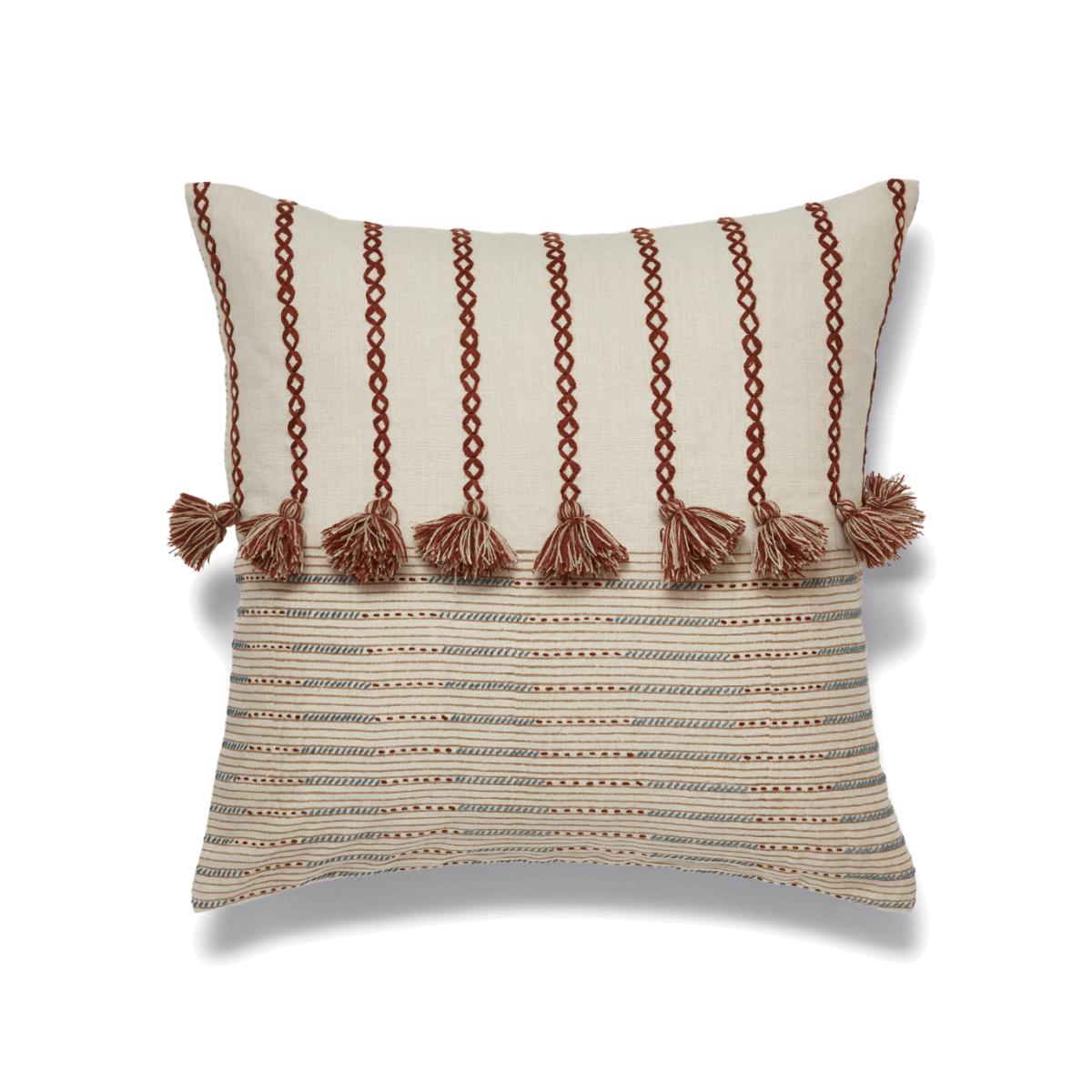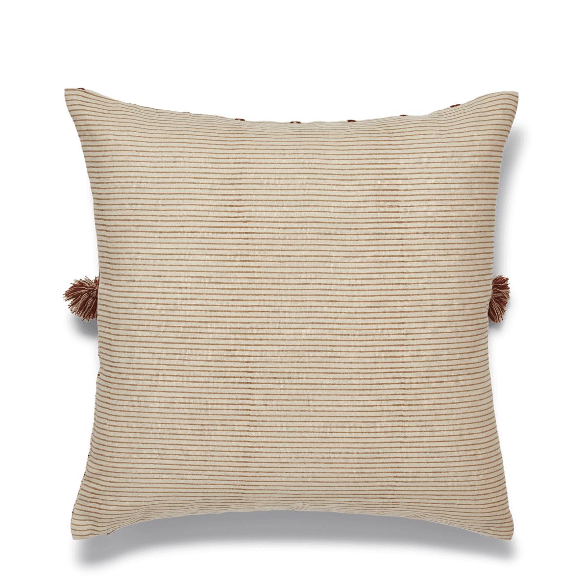 Embellishment always adds a touch of personality, and none more so than the adornments on the Morse Cushion Cover. The 100% linen cover is hand block printed; the beauty of this technique is that each print will differ ever so slightly, depending on the amount of pressure applied by the artisan. It features hand embroidery that ends in unique chunky knotted tassels for added texture and colour.