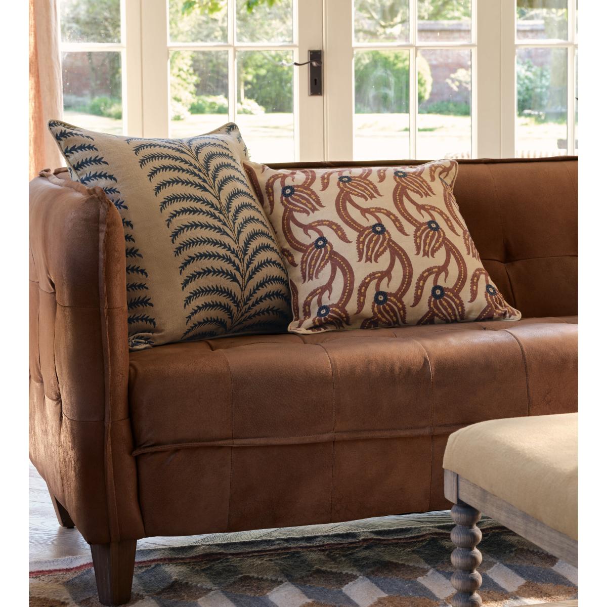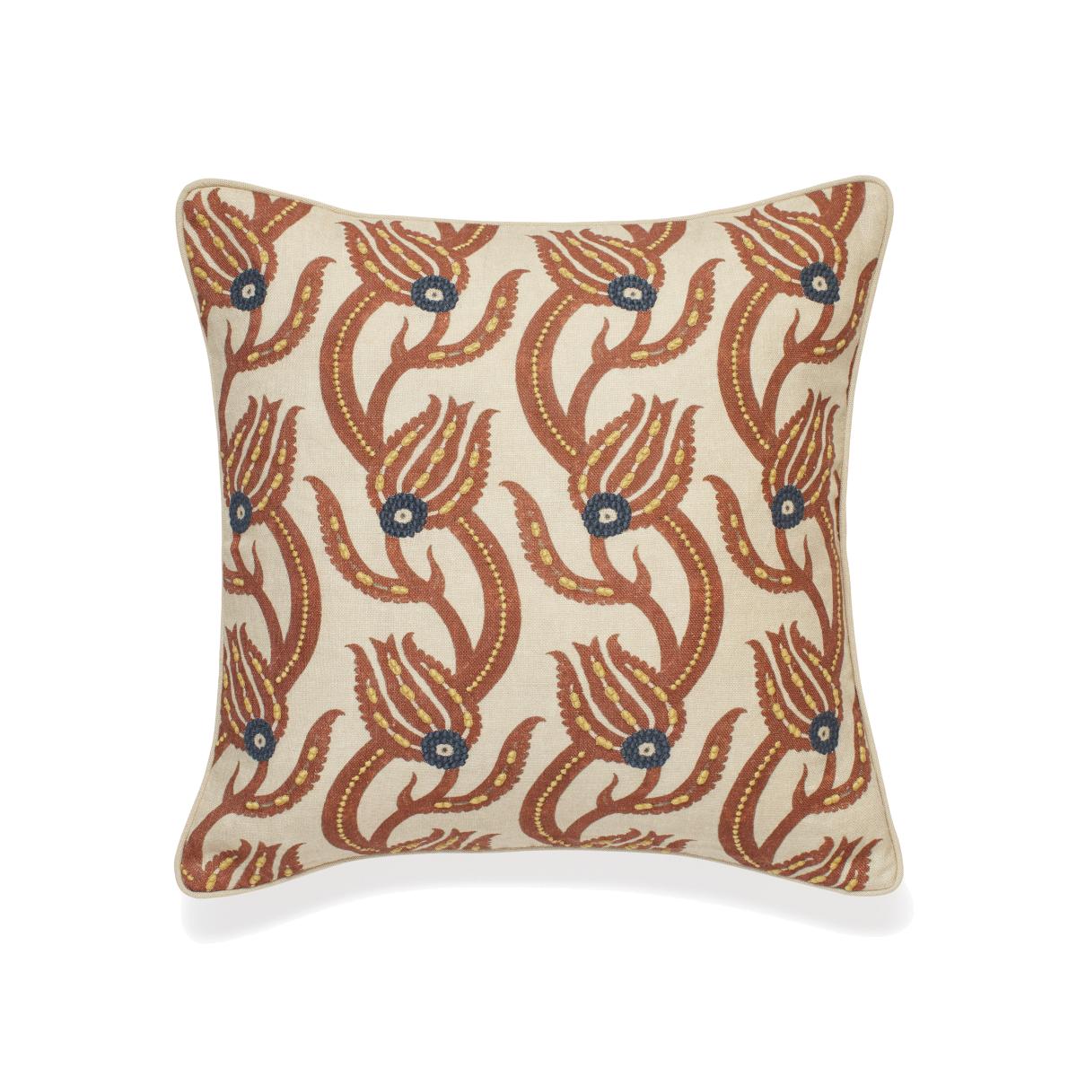 Our Muhibbi Cushion Cover has an Earthy Red abstract tulip pattern that is digitally printed onto its linen base. Its pattern is inspired by Ottoman art, the long slender petals of the floral form were often adorned on marble, ceramics and wall tiles, robes and rugs in the 18th century. Yellow and blue details are embroidered onto the pattern for added texture.