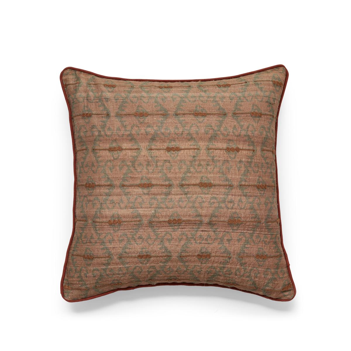 Our square Namuna Cushion Cover makes for a luxurious accent on a bed or a sofa. Its damask pattern is screen-printed onto raw tussar silk – cultivated from cocoons in the forests of India and one of the most sustainable kinds of silk there is – with embroidery detail on the bold motif. The reverse is kept plain in a dyed earthy red that complements the patterned side, while the piping around the edges completes the look.