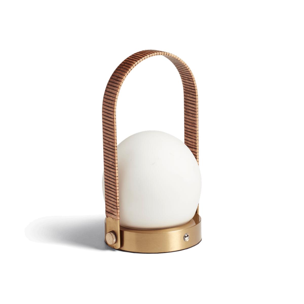 Add some ambience to your al fresco dinner parties with our Neoma Wireless Table Lamp. A frosted glass orb sits upon a brushed gold metal base, all of which can be lifted with a pivoting handle wrapped in waterproof synthetic rattan. Charge your lamp from a USBC port in its base to gain 7 hours of lighting time and change your brightness at the touch of a button.