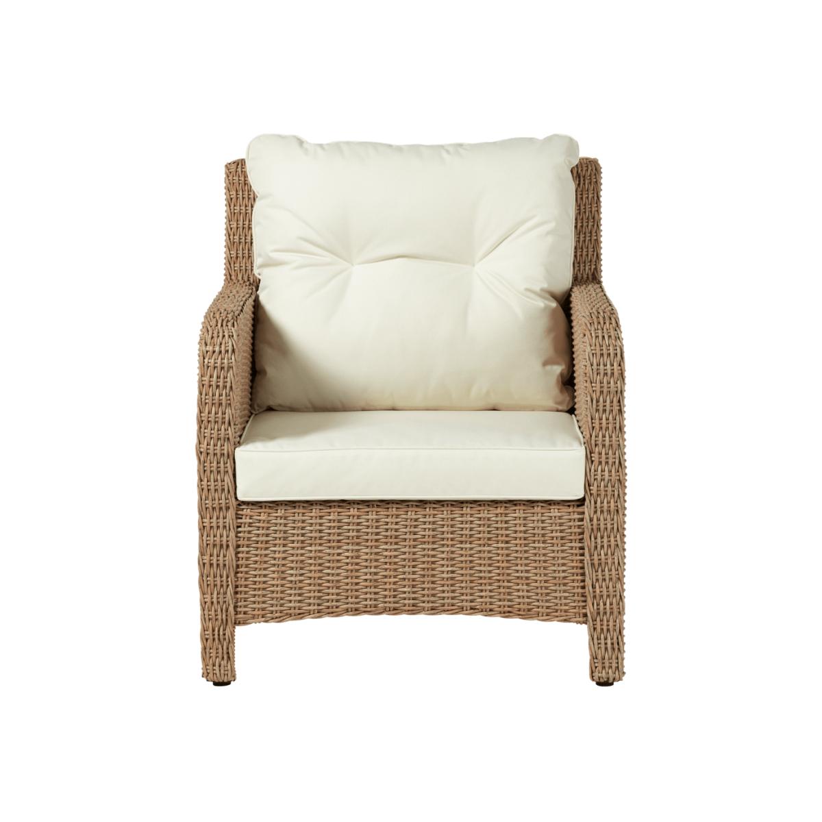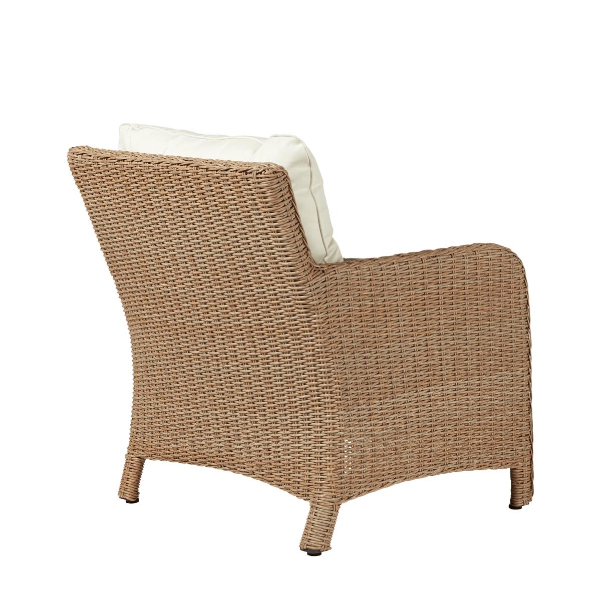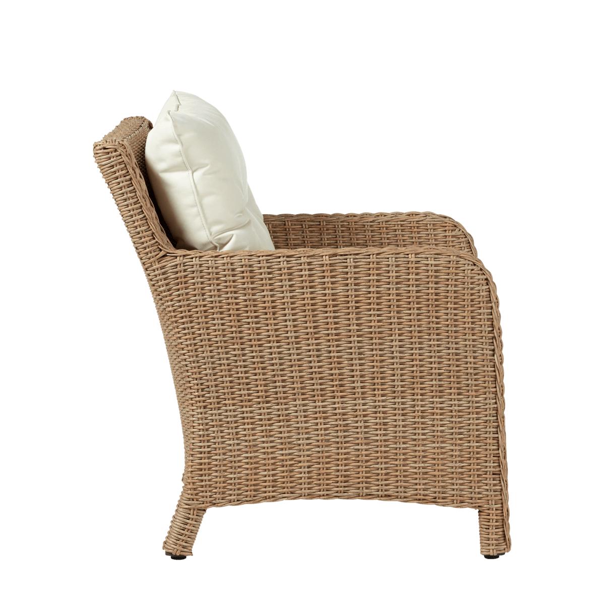 Handwoven in a traditional basket weave from our all-weather "rattan", the New Hampshire Armchair includes a deep, weather-resistant seat and back cushion for maximum comfort and practicality.