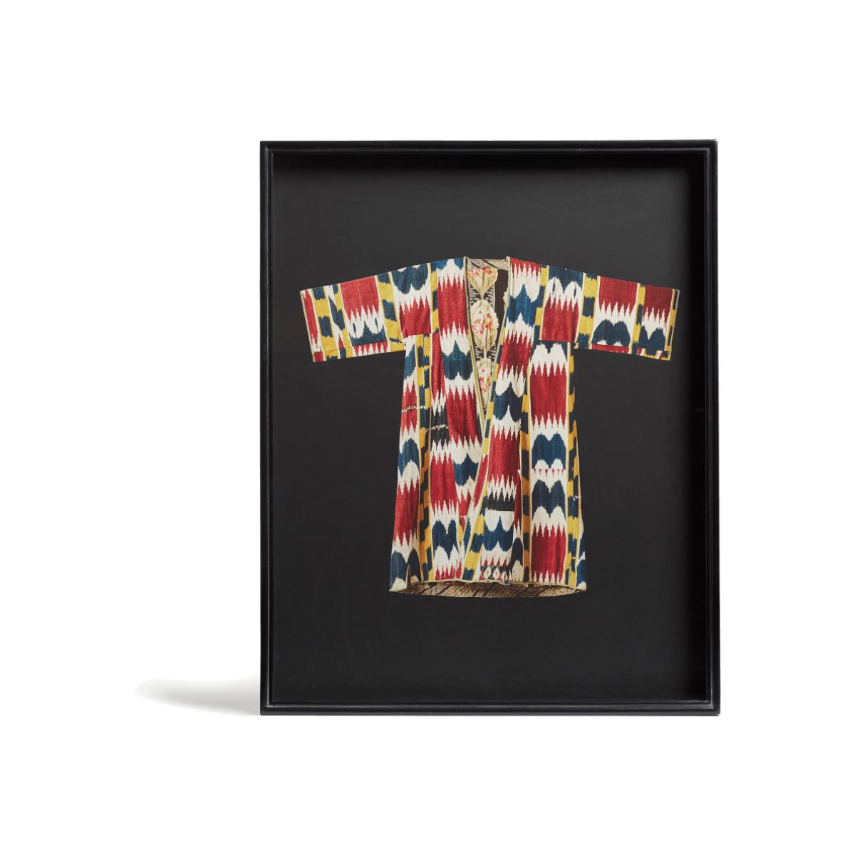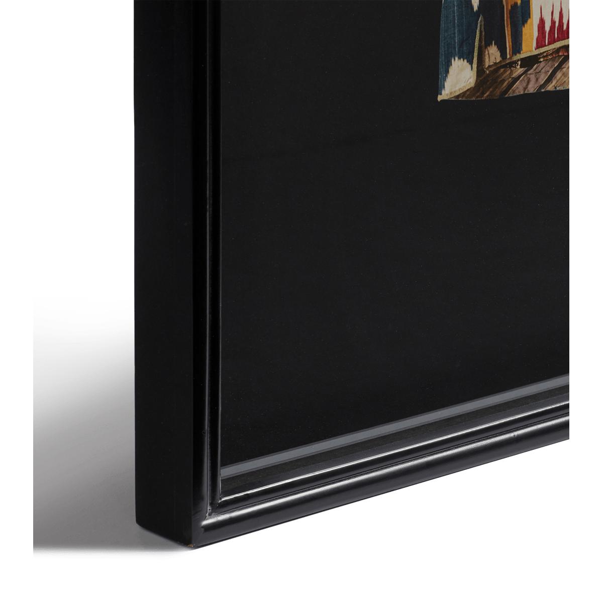 Our Oblak Robe Print is inspired by traditional Uzbek Ikat designs. This particular robe was found by our Co-Founder Sue Jones in a Turkish market; we’ve translated the form here by digitally printing it onto a dark background that makes the vibrant colours stand out. It’s framed with wood, painted black to further accentuate the design.