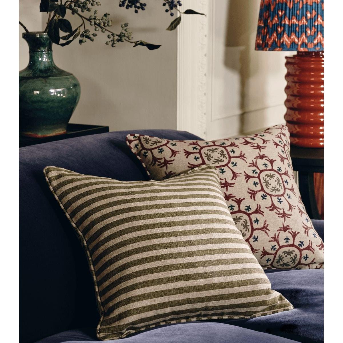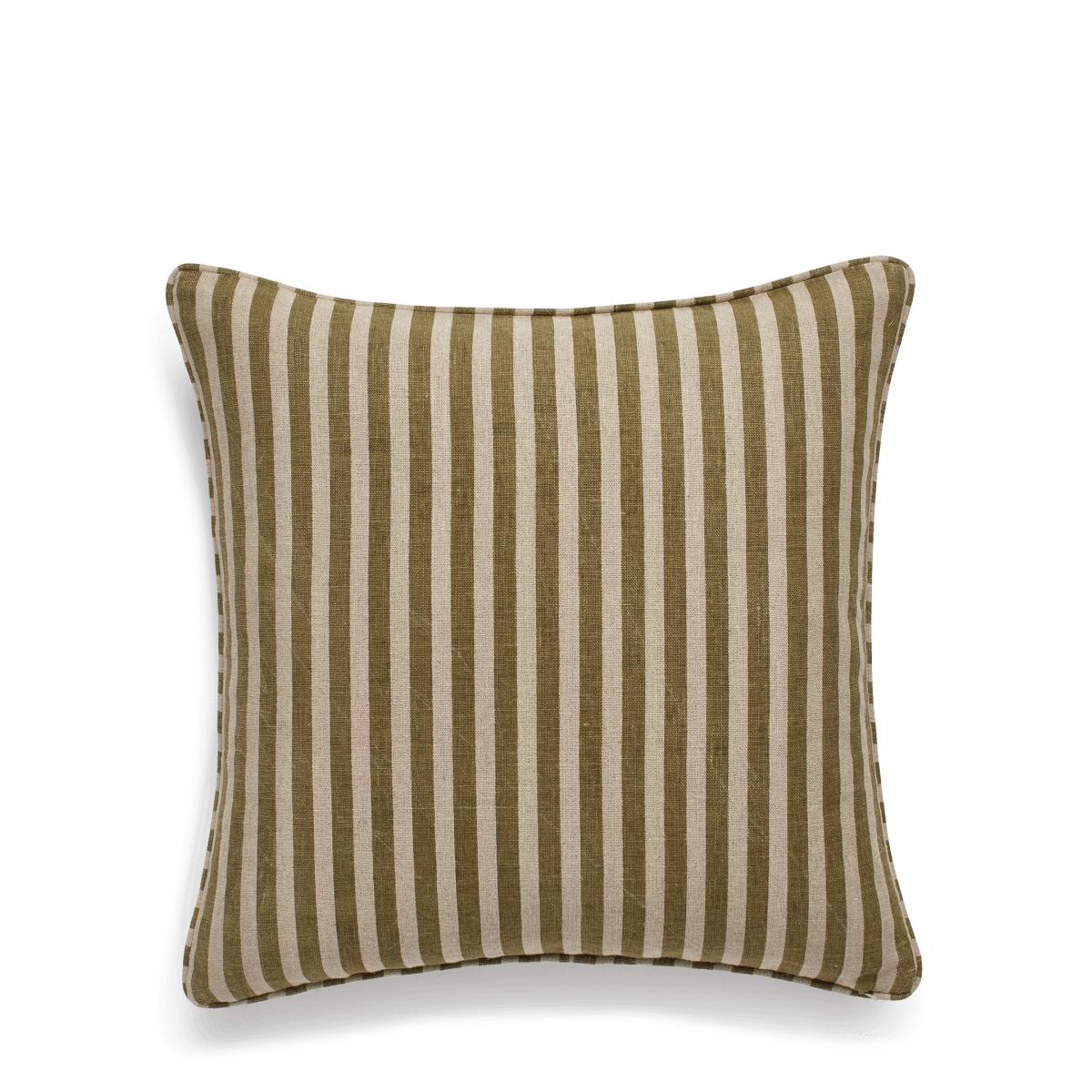 Switch up your scheme day to day with this cushion cover, featuring a hand screen-printed abstract design on the front and a classic stripe on the back. The fresh green stripe carries through onto the piping for added detail.
