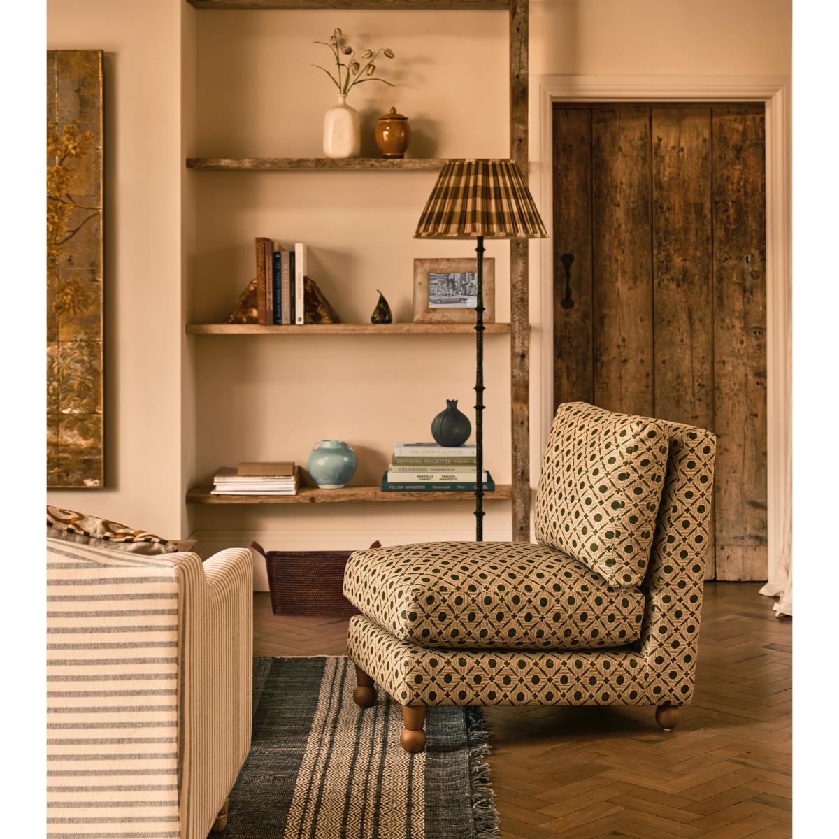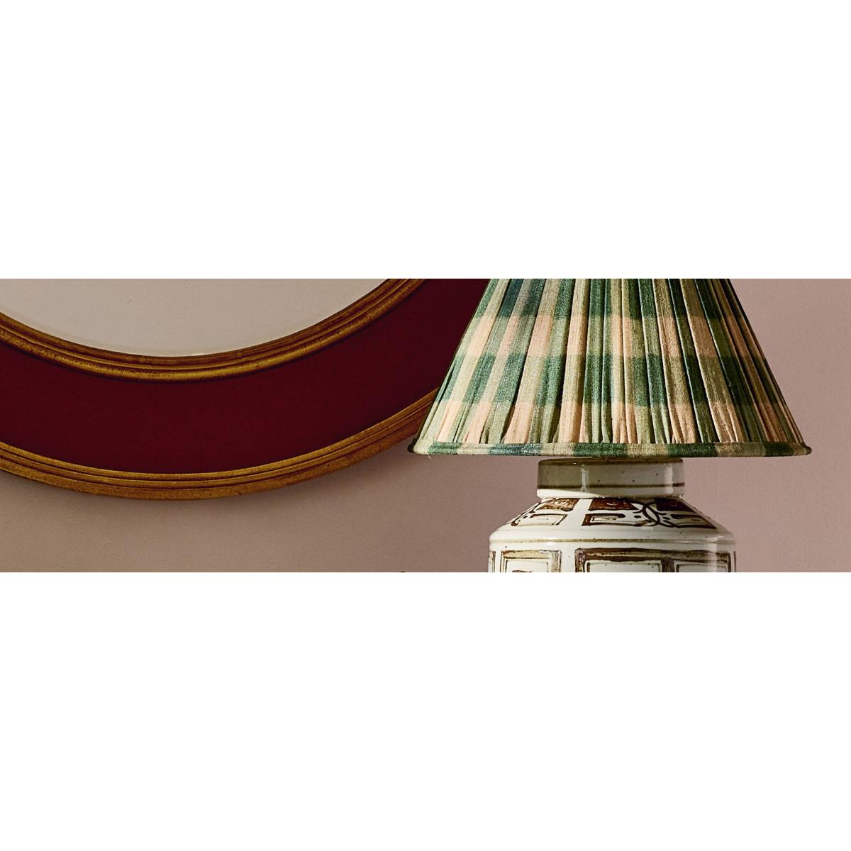Our handmade Orford Lampshade has a pretty waving stripe pattern running around its handwoven tussar silk base. The contemporary stripe design is hand block printed in a dusky red tone on the natural silk, then pleated around an iron frame for a more classic appearance. It's lined and finished with a border of the same striped silk. This is the larger of two sizes.
