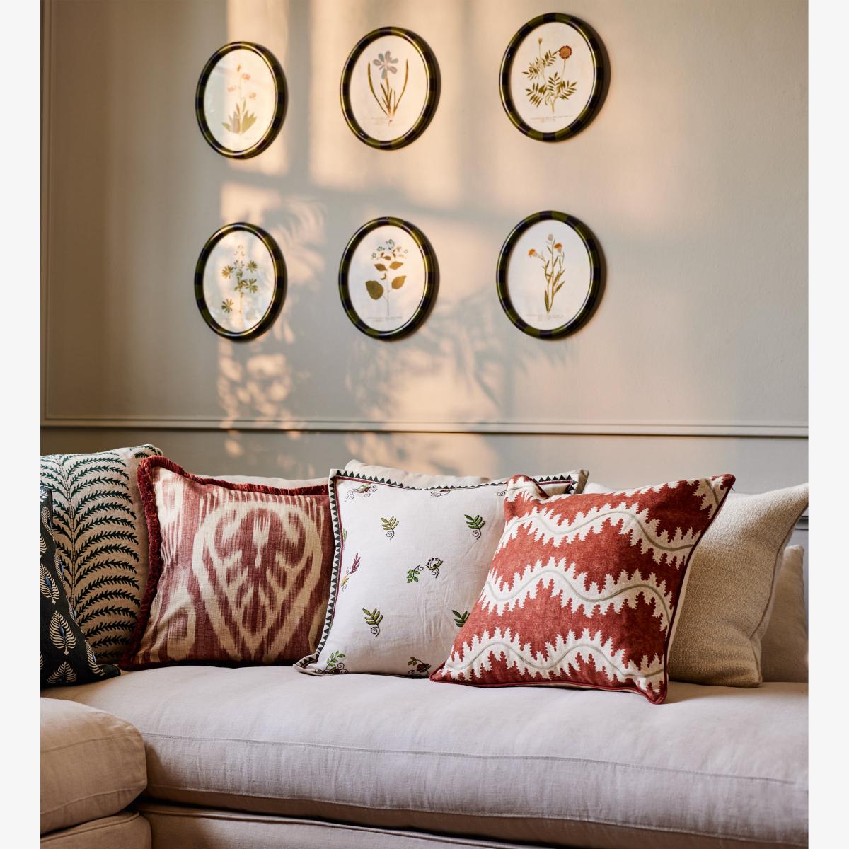 I love this Ottilie cushion cover for its clean, understated elegance, making it versatile for both classic and contemporary interiors. Its ivory tone offers a neutral base that pairs well with a range of colour schemes, especially when combined with richer, textured cushions like those in the image. It’s ideal for adding a touch of softness to neutral sofas or layering within a scheme that mixes patterns and textures. Practical styling tips include pairing it with contrasting or patterned cushions to create visual interest or using it as a staple in a monochrome or minimalist setting for a subtle, sophisticated look. It’s a great choice for bringing a calm, neutral element to both living rooms and bedrooms.