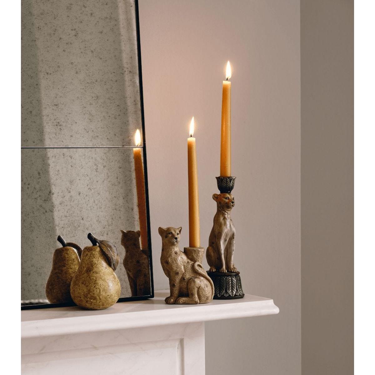 These leopard candle holders are a playful yet sophisticated addition to interiors that blend eclectic or bohemian styles with a touch of luxury. I love how the animal motif adds character and a slightly exotic vibe, making them perfect for mantels, side tables, or open shelving. They're versatile enough to work in contemporary settings when paired with minimalist accessories, or in more layered rooms where they can stand out as statement pieces. Practical styling tips include grouping them with other natural textures like woven baskets or wooden accents to elevate their earthy charm. Since they’re resin, they’re durable and easy to move around, which allows flexibility in changing your styling as needed.
