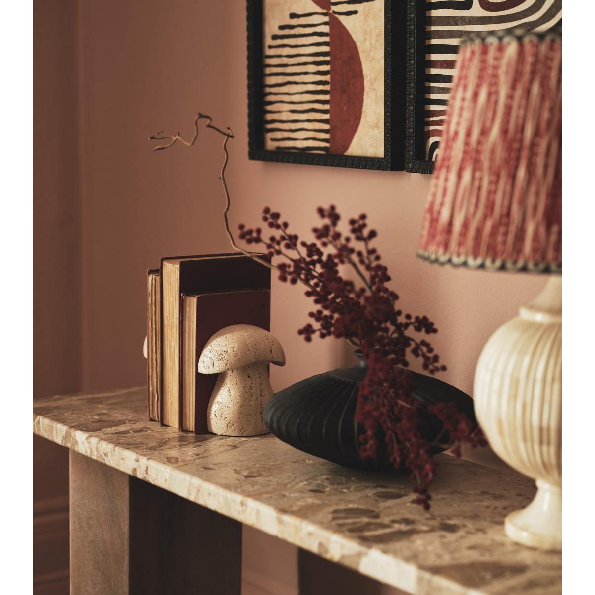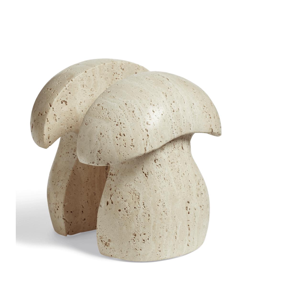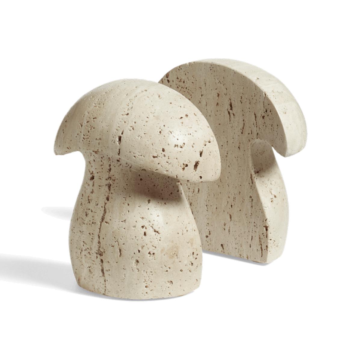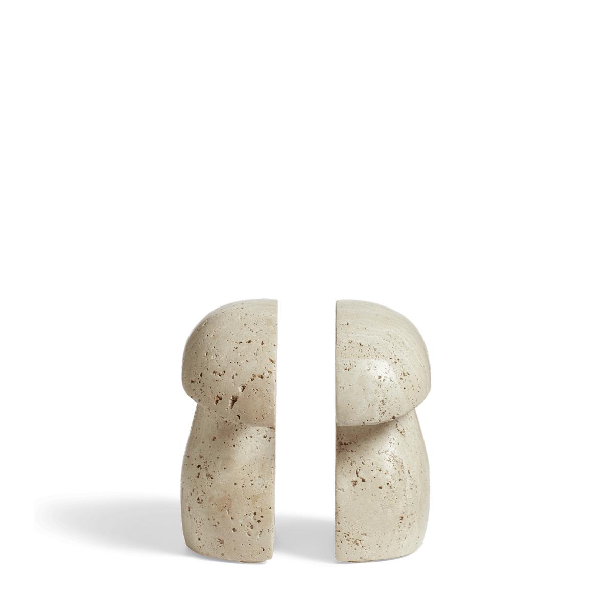 These bookends are hand carved to look like two halves of a whole mushroom. They are crafted from travertine; a type of limestone that features characterful marks and patterns that result from its organic formation in hot springs and limestone caves as well as from the imprints of plants within its surface. This natural material results in the Muscarias having individual characteristics and colouring from piece to piece that add to their charm and personality. These subtle differences are part of the material's allure.