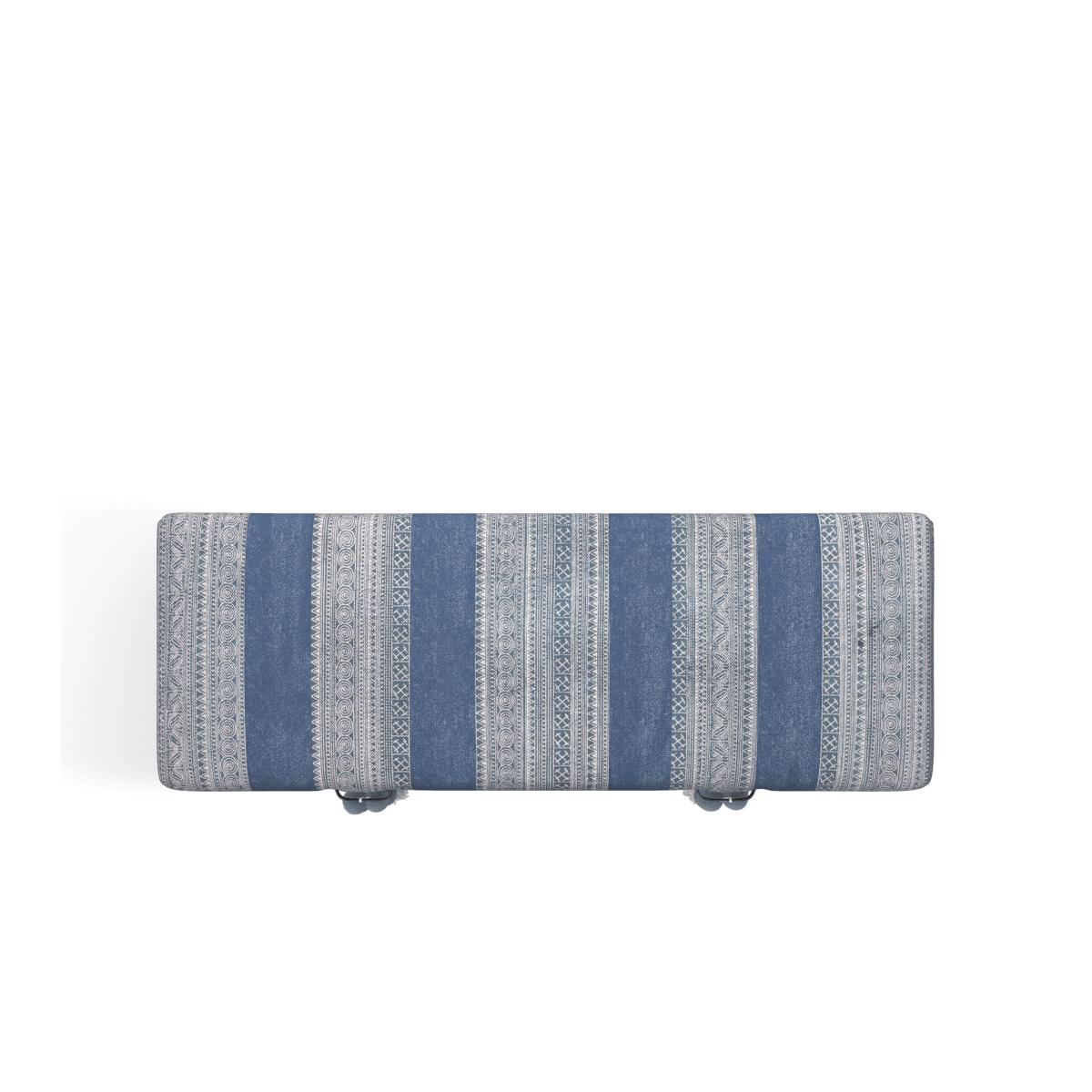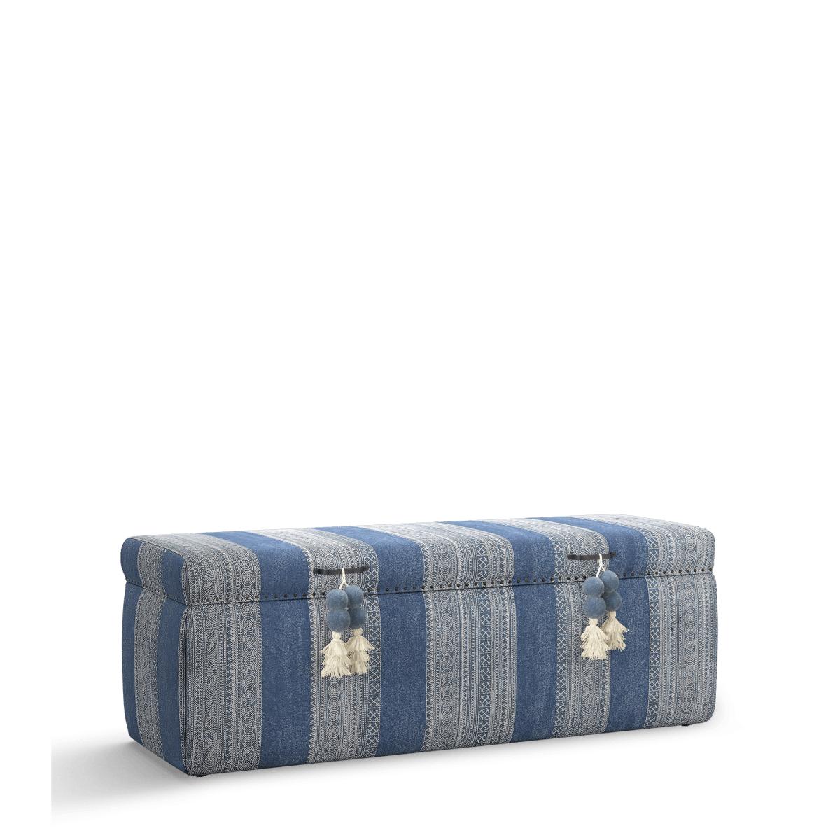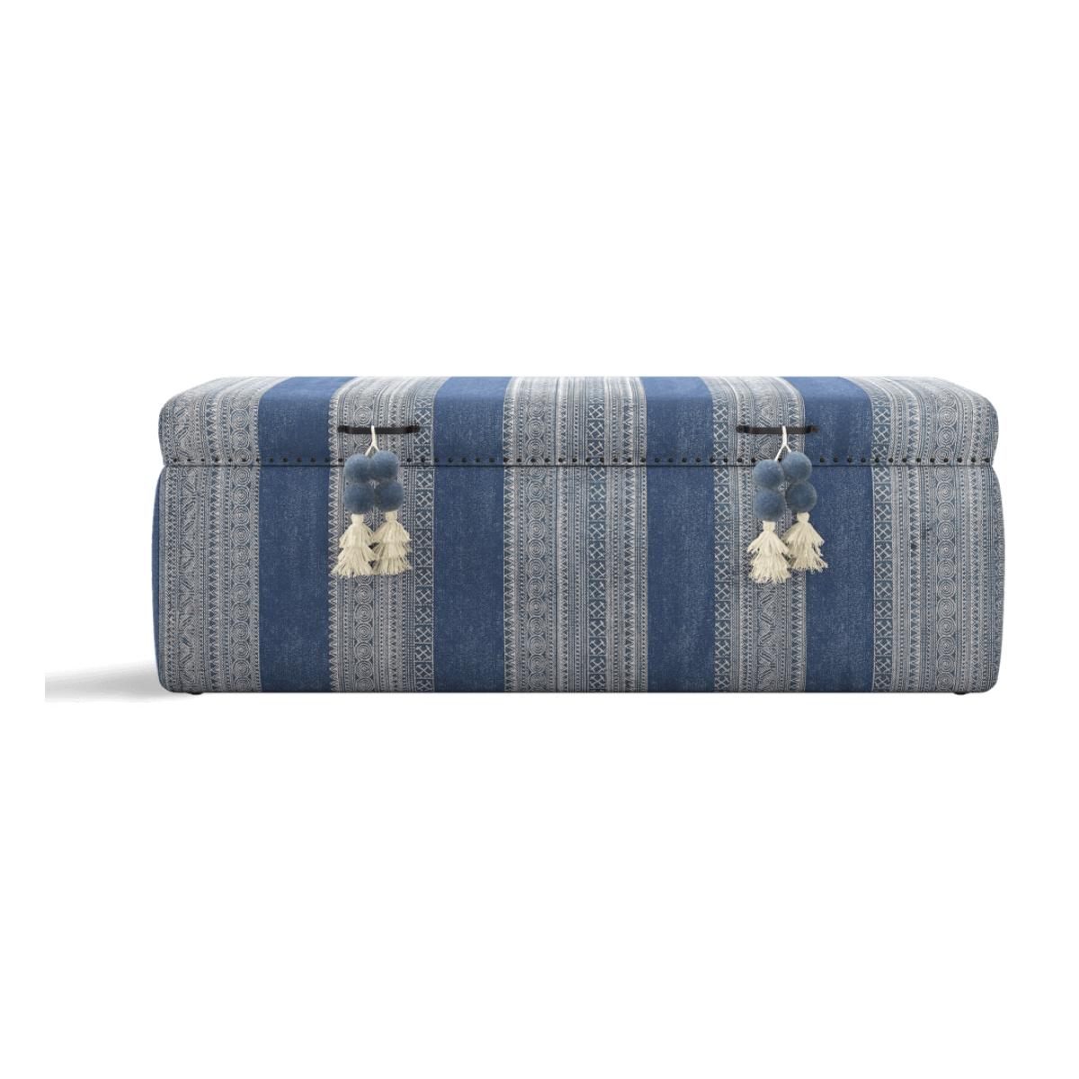 The latest design in our collection upholstered ottomans, Palayam might look familiar – in fact, the pattern made its OKA debut on one of our rugs before being translated into this new form. Blending the best of classic and decorative patterns, chunky blue stripes and fine geometric motifs sit side by side in this modern textile, which is sreen-printed by hand onto a cotton dhurrie before being washed for a faded appearance. Each individual piece is then used to clad a mango-wood frame, and finished with brass studs and handles. As a finishing touch, tassels bring a sense of fun. The ottoman’s heavy lid is supported by four slow-close sprung metal hinges, for an extra-smooth finish.