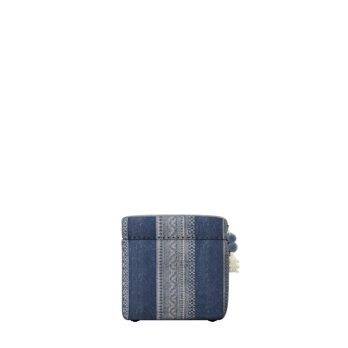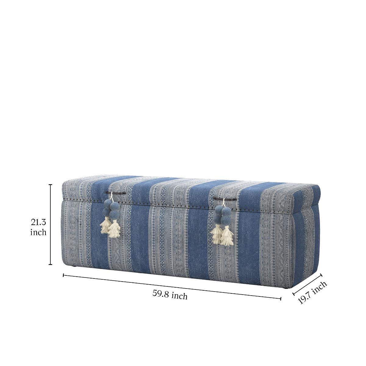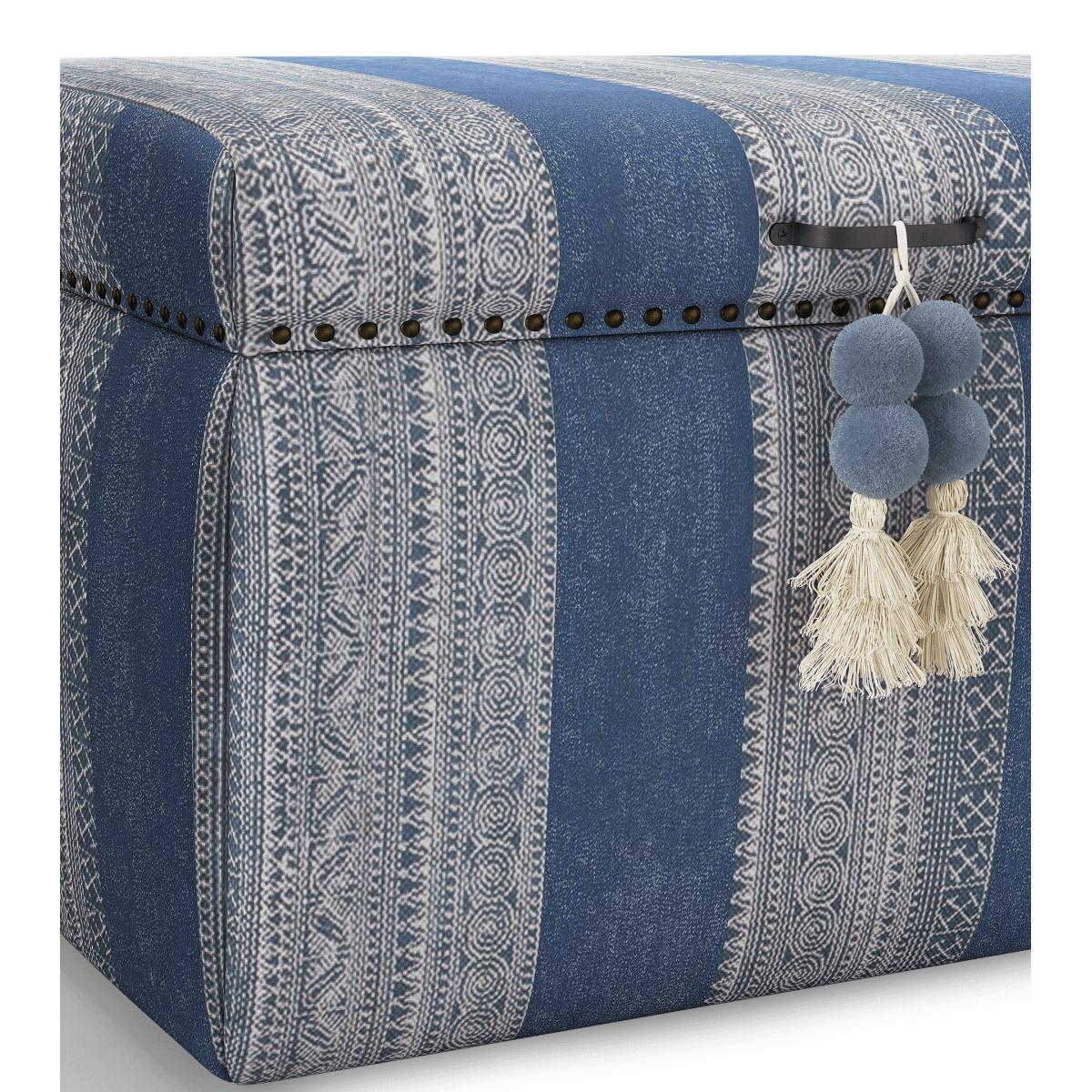 The latest design in our collection upholstered ottomans, Palayam might look familiar – in fact, the pattern made its OKA debut on one of our rugs before being translated into this new form. Blending the best of classic and decorative patterns, chunky blue stripes and fine geometric motifs sit side by side in this modern textile, which is sreen-printed by hand onto a cotton dhurrie before being washed for a faded appearance. Each individual piece is then used to clad a mango-wood frame, and finished with brass studs and handles. As a finishing touch, tassels bring a sense of fun. The ottoman’s heavy lid is supported by four slow-close sprung metal hinges, for an extra-smooth finish.