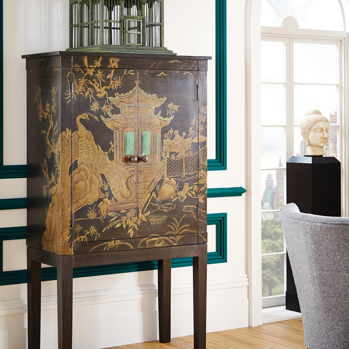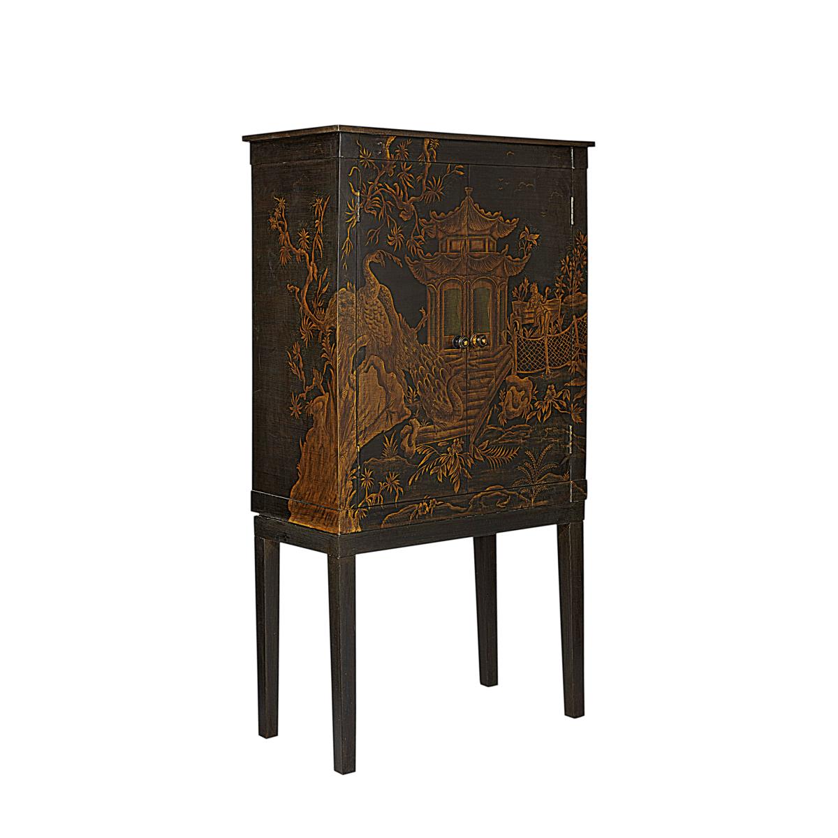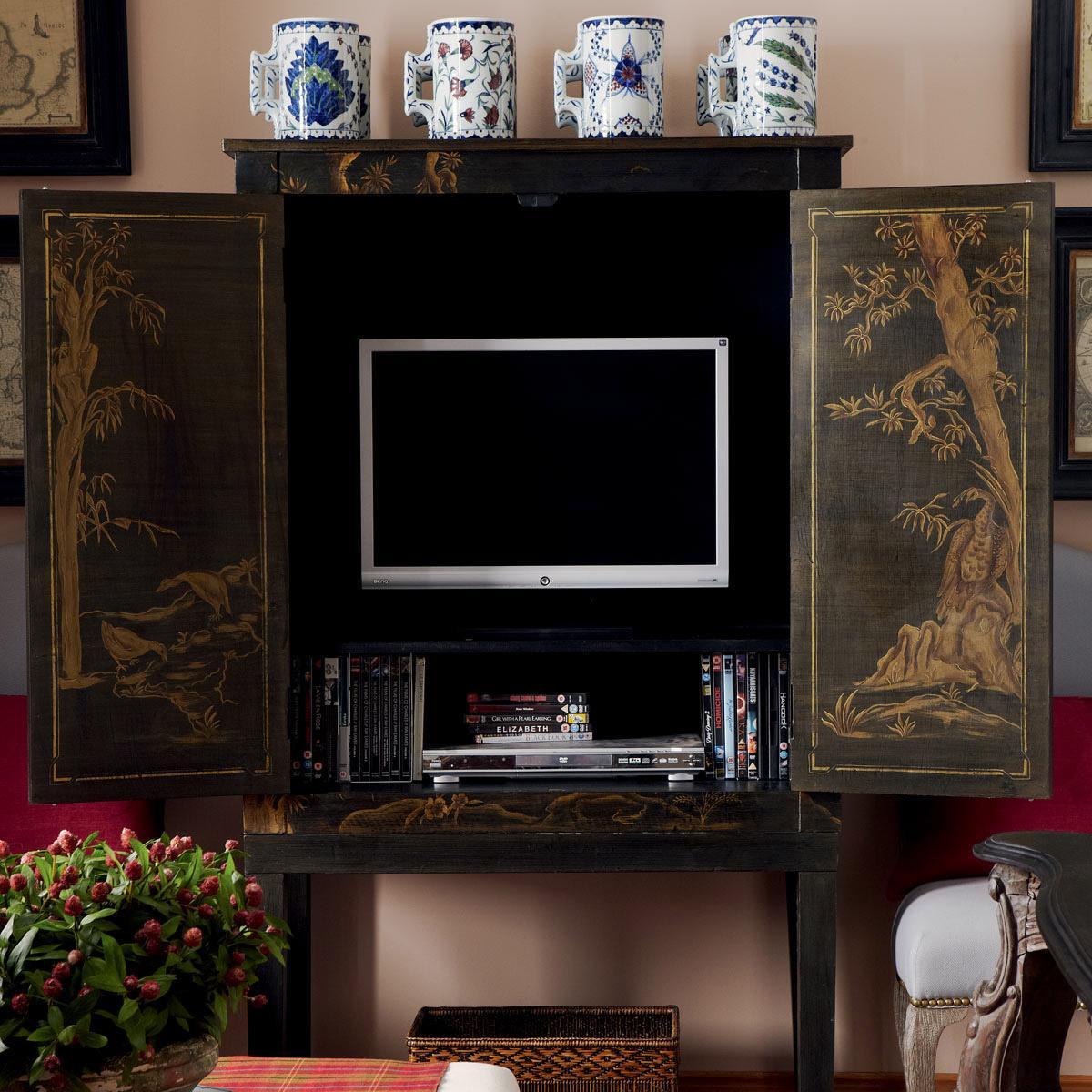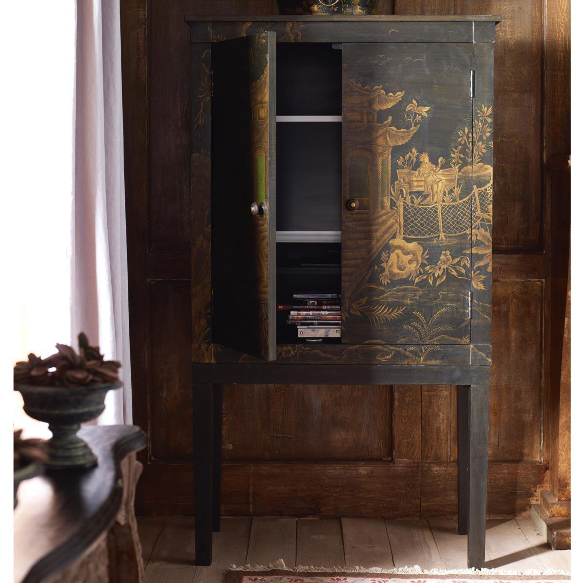This chinoiserie-style cabinet provides the perfect solution to the perennial problem of where to hide the TV and electrical equipment in an otherwise seamlessly designed room. With a decorative design that extends around three sides of the cabinet, and also inside the doors (so it looks just as good when open), this is a piece that is destined to become a family heirloom. Handmade and hand painted, the unit has an internal, low shelf (20cm high), and specially made cable holes at the back to keep wires neatly tucked out of sight.
