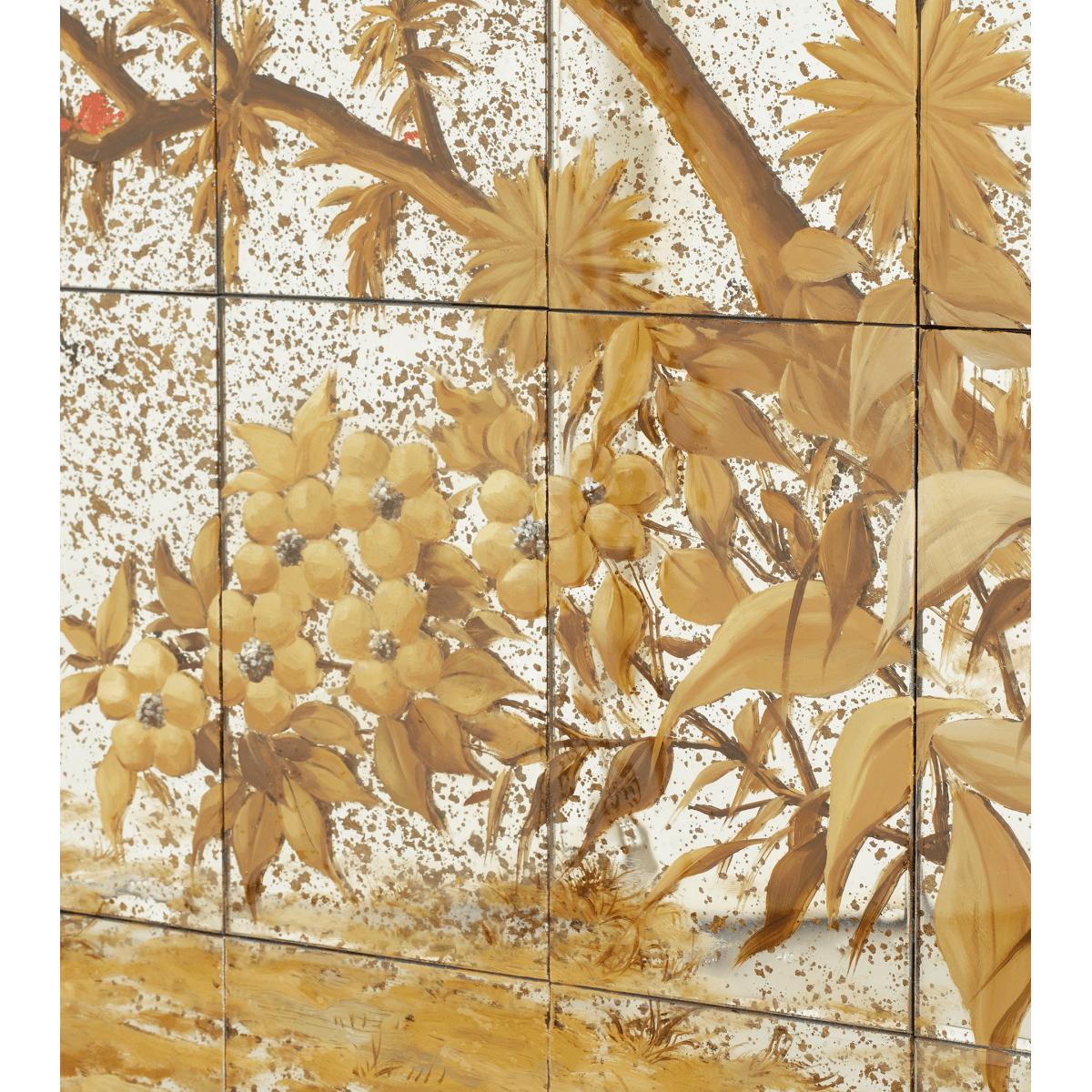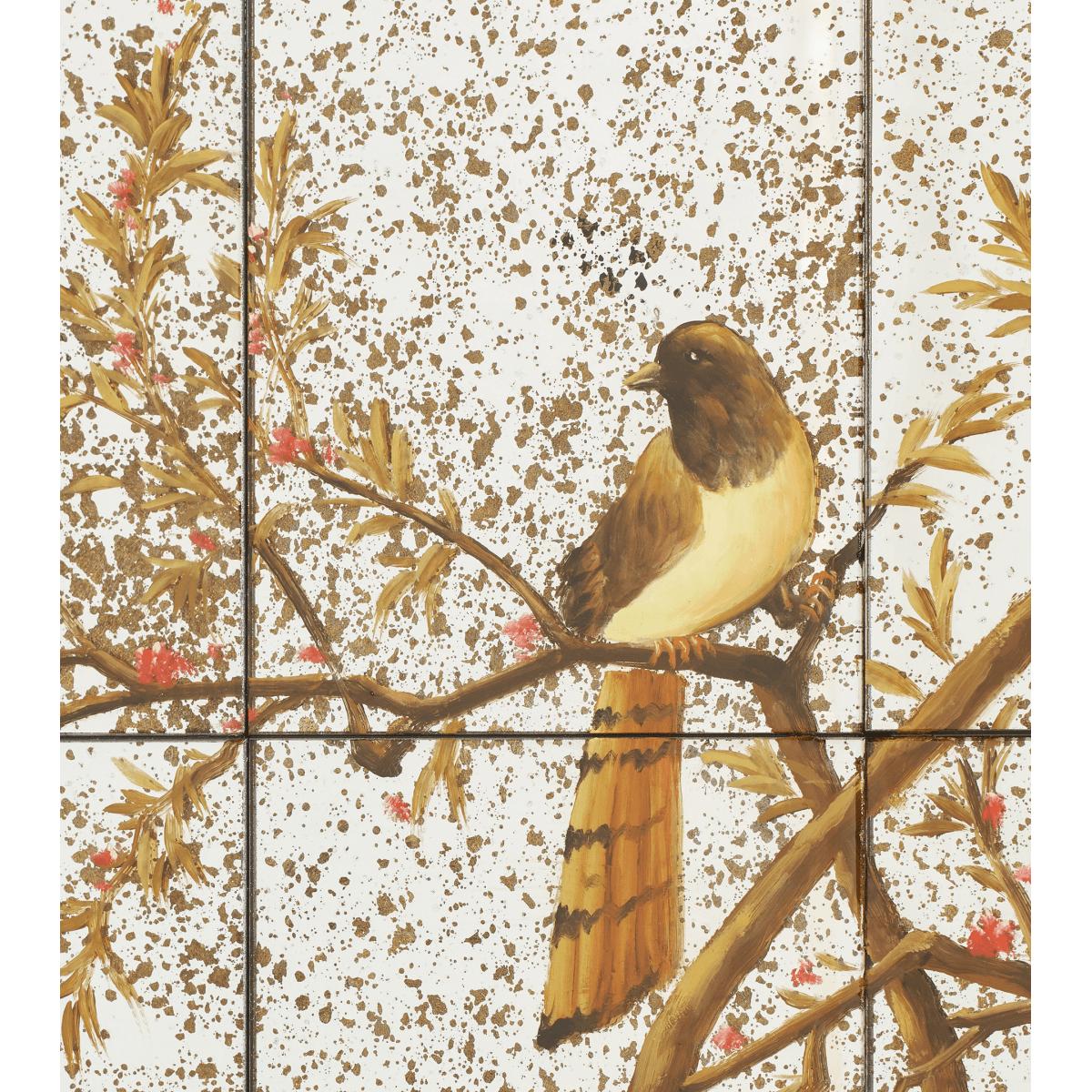 Phaethon means "shining" or "radiant" in Greek, and this Mirrored Wall Art certainly shines with its reflective antique mirrored panels. The mirror itself is handmade and then hand-painted with oil paints to showcase a scene full of foilage and birds in golden and red tones. The frame is gold-foiled which picks up on the hues in the painting.