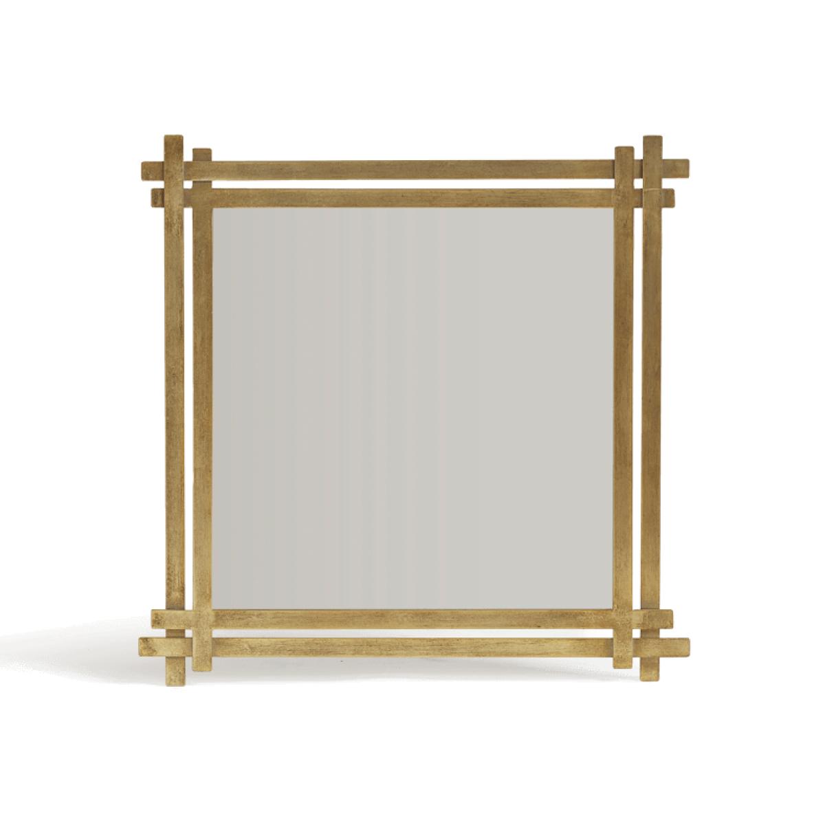 The Picaria mirror was inspired by a Chinese character: 回 (hui), which was inscribed on ancient Chinese bronzeware to ensure that warriors would return safely and live long, happy lives. The interlinking details on the corners add interest, and the metal is hand painted in a matte gold finish.