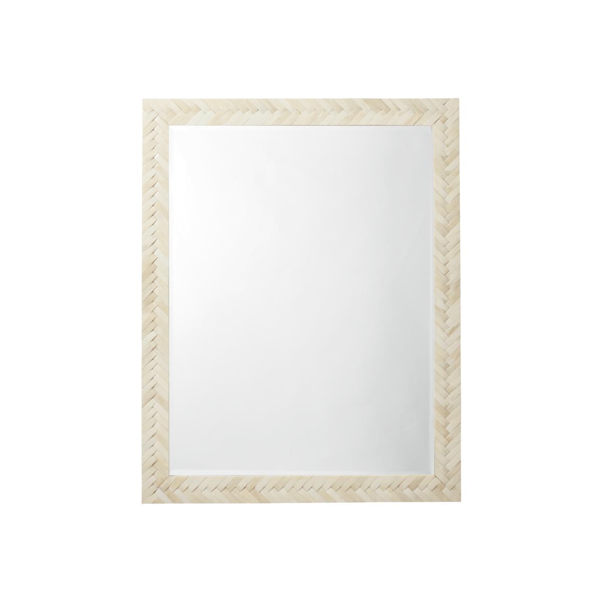 A minimal wooden mirror veneered with small, off-white, rectangular sections of bone. The border appears plaited but the segments are carefully cut and individually applied to the wooden frame.