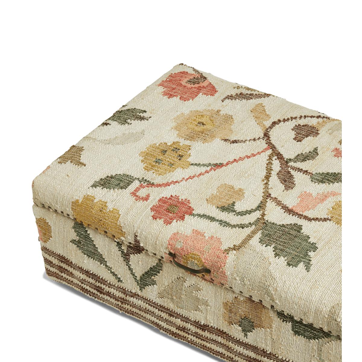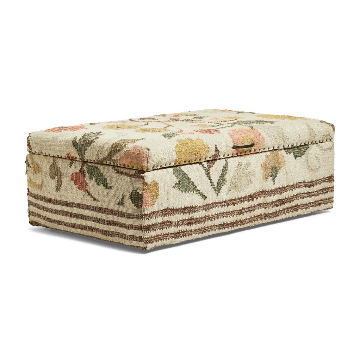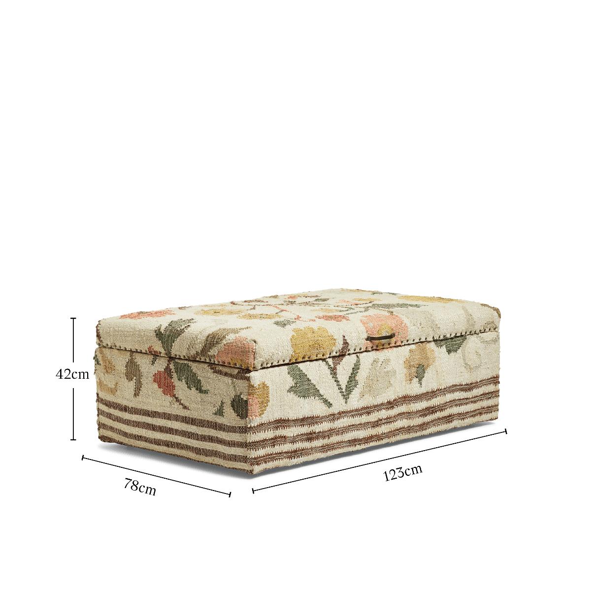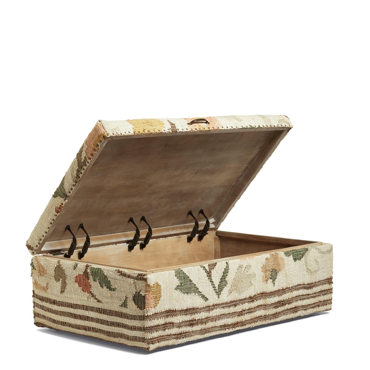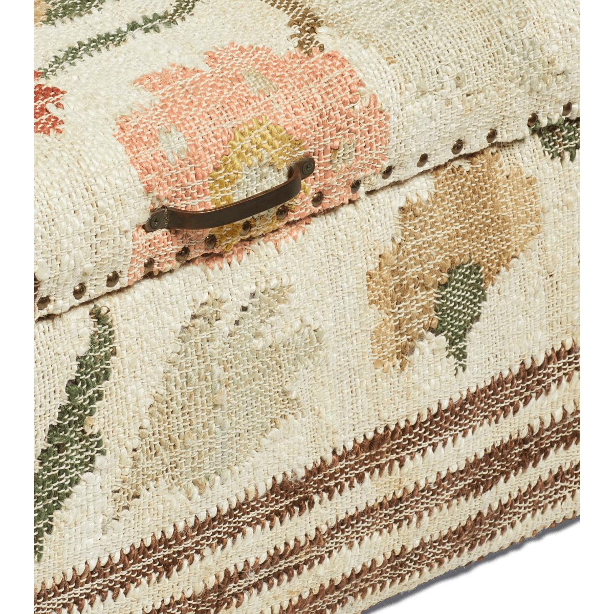 We borrowed the name Pomona from the Roman wood nymph and goddess of fruitful abundance, on account of this ottoman’s blossoming floral pattern. The mango wood frame is upholstered in a handwoven jute rug featuring large-scaled blooms in muted colours with a striped border. Its lid can be opened to find ample storage space and will support itself when lifted.