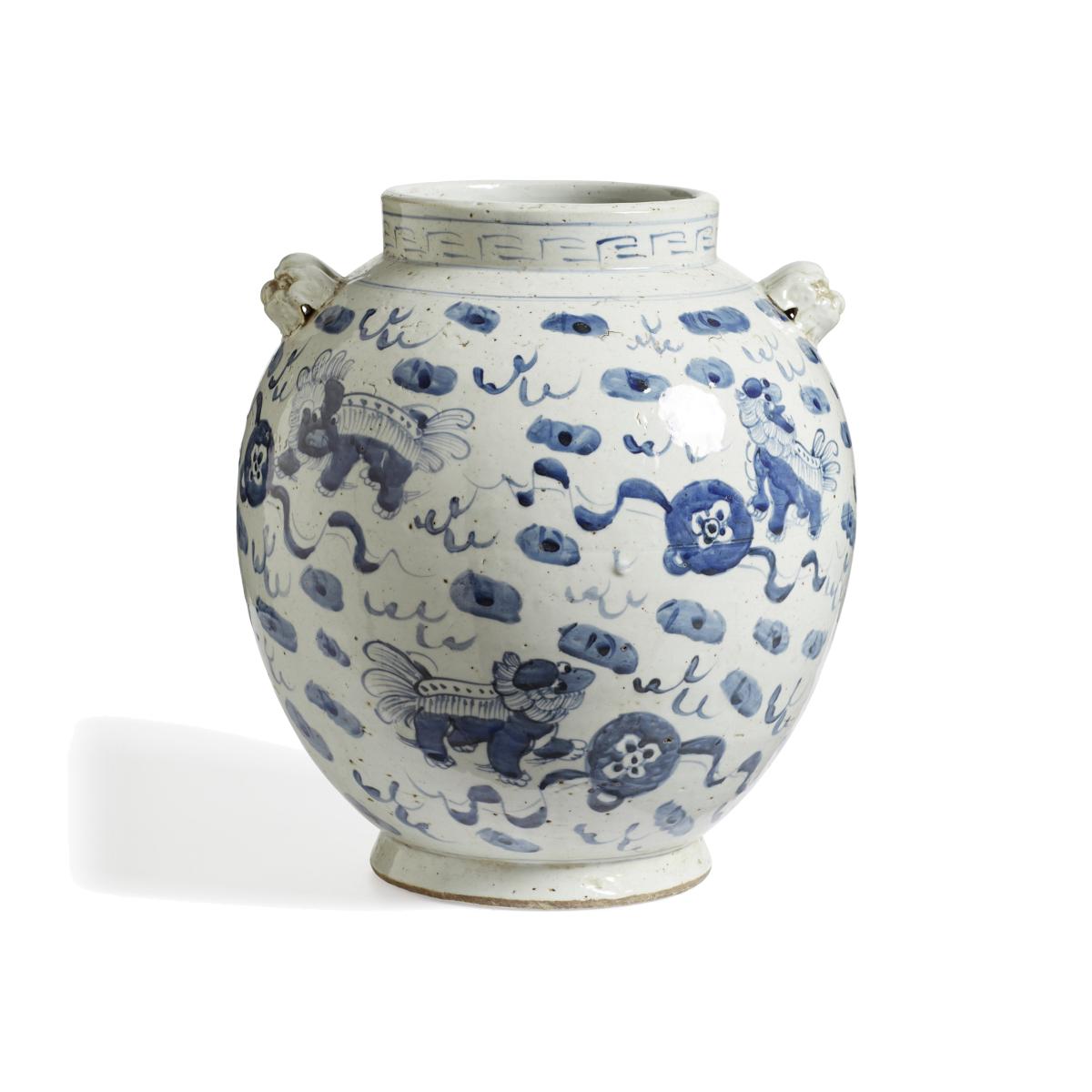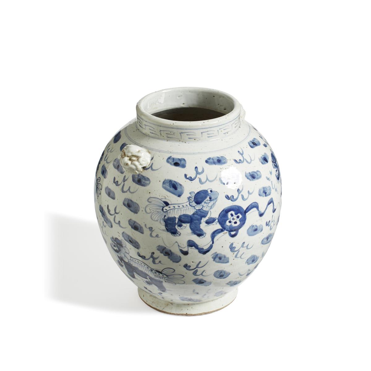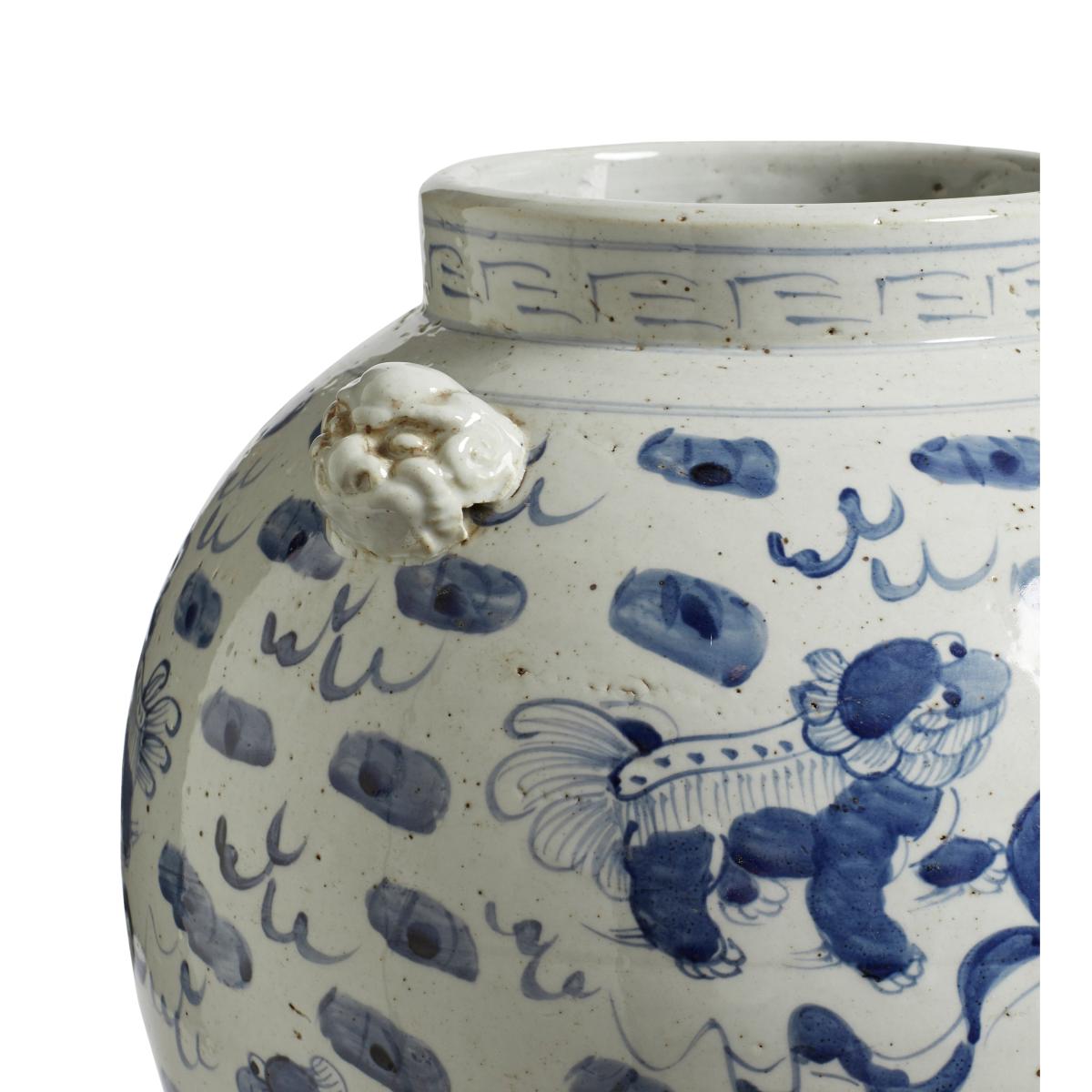 This large handmade Vase takes inspiration from classic ancient Chinese pottery. The piece is handmade from clay, fired and polished for high shine by a small group of expert craftspeople in Jingdezhen, a city known for its rich history in traditional porcelain. Its antique-style design is hand painted with delicate blue dragons and clouds and decorative dragon-head handles that are also antiqued by hand. The piece if perfect for a bouquet of freshly picked flowers or an arrangement of faux stems for all-year-round style.