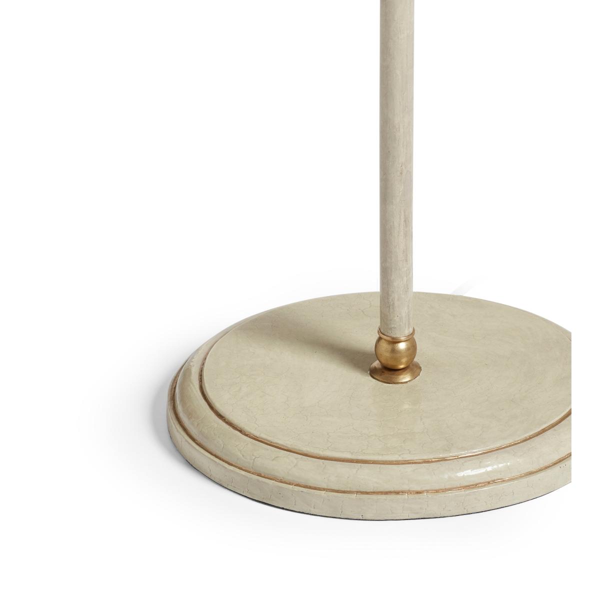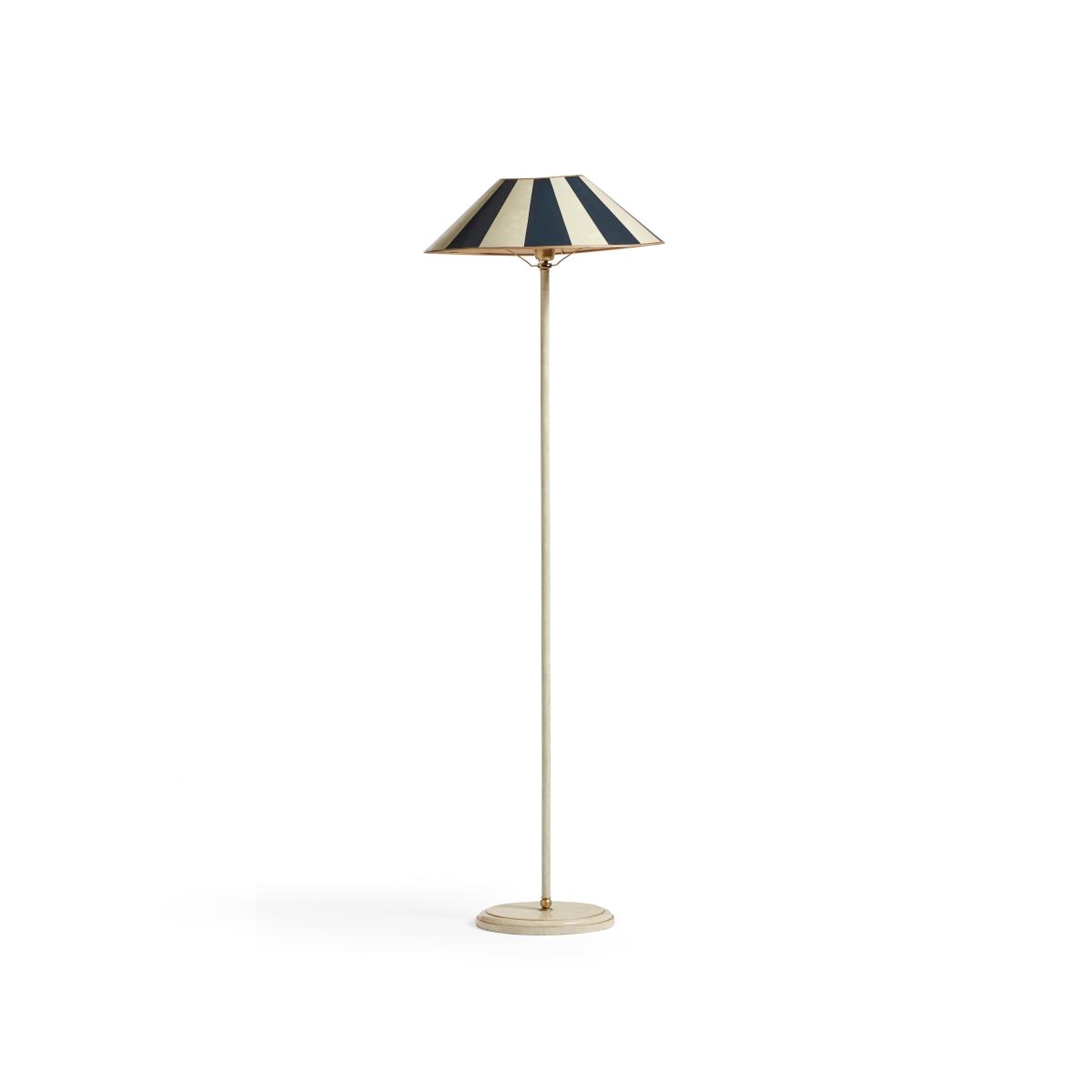 Our Purdy Floor Lamp complements the other pieces in the collection and features the same distinctive metal shade featuring hand-painted blue and vellum stripes that take their inspiration from big-top circus tents.