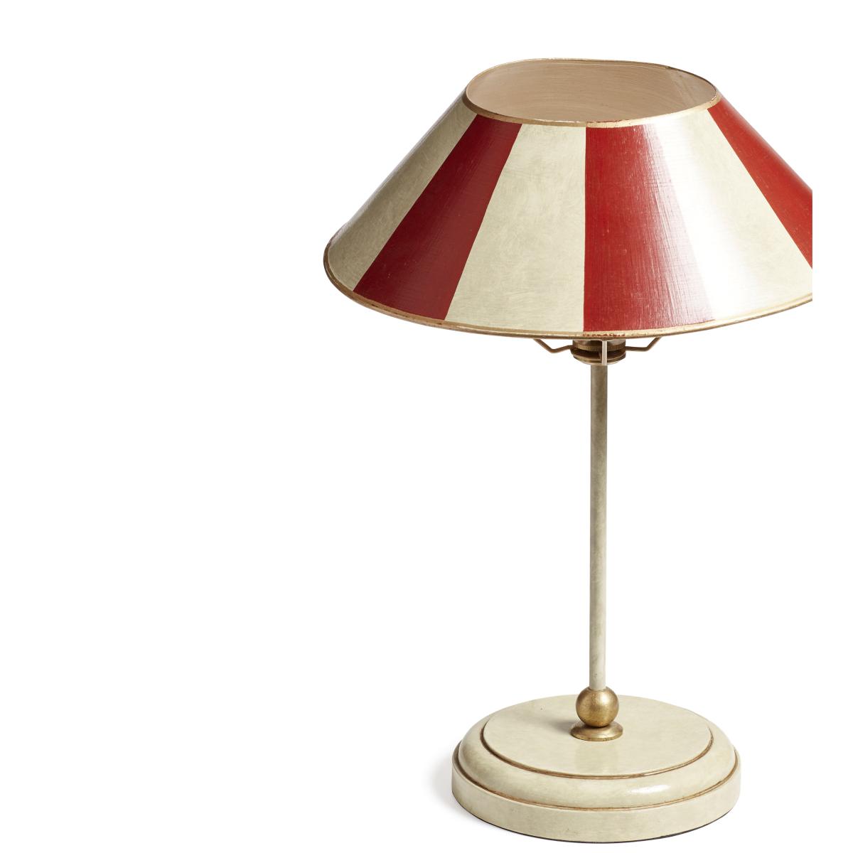 The Purdy Table Lamp is a take on vintage-style lighting. Purdy takes a round approach with its metal shade that is entirely hand formed and welded, hand-painted red-and-vellum stripes reminiscent of big top circus tents. The style is complemented by brushed antique brass-toned edges and hardware. The nature of the layered painting and drying technique means that the craftspeoplecan only make these lamps at a certain time of year, and so limited numbers will be released into our catalogue at a time, making each piece extra special. Due to the artisanal process and natural elements that have an effect on the making of this piece, each one will have individual characteristics that add to their charm.