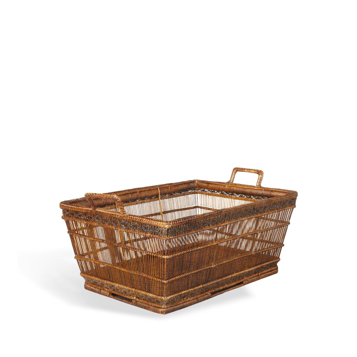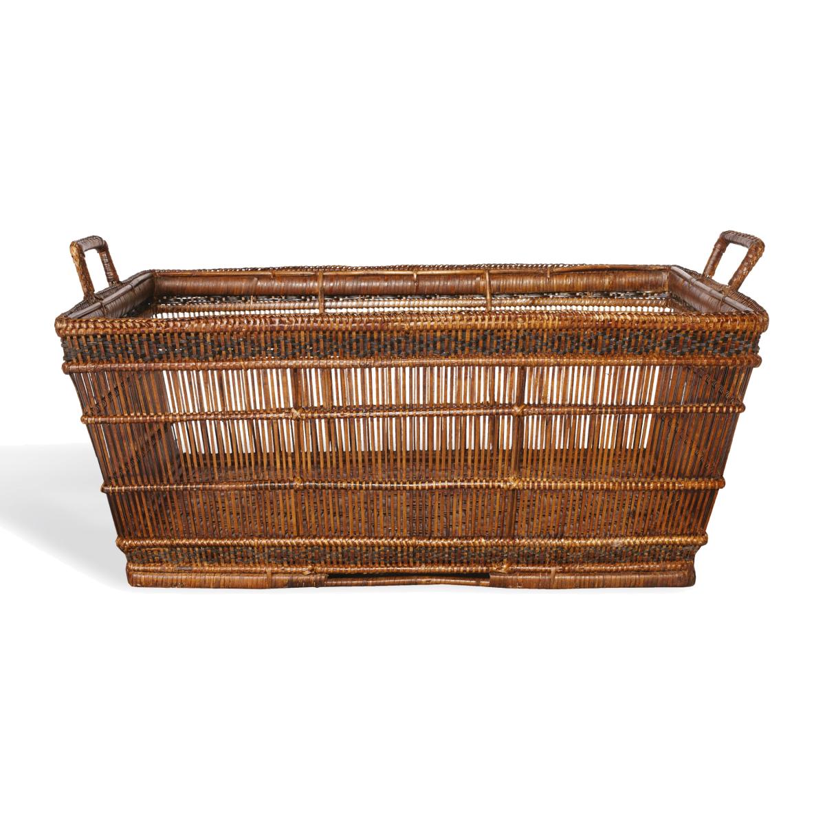 A beautiful hand-woven and finely detailed rattan basket that is attractive enough to work in a bathroom holding spare towels, in a sitting room holding newspapers, or tucked under a console table to provide additional storage. A lovely piece that is both decorative and practical.