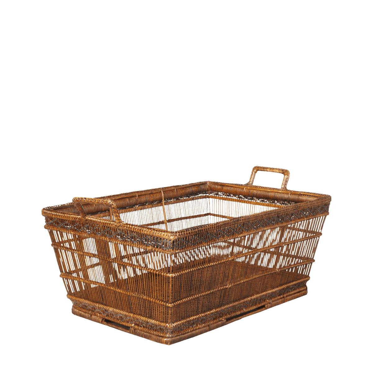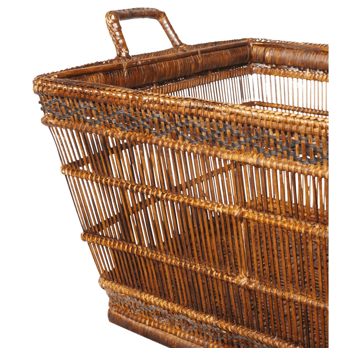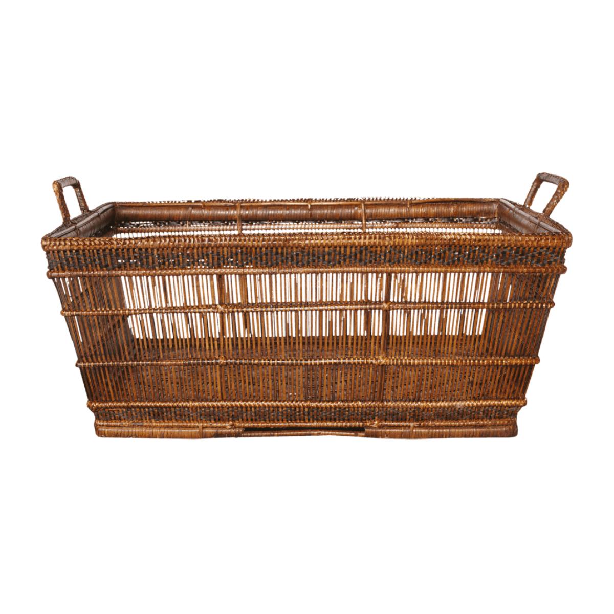 A beautiful hand-woven and finely detailed rattan basket that is attractive enough to work in a bathroom holding spare towels, in a sitting room holding newspapers, or tucked under a console table to provide additional storage. A lovely piece that is both decorative and practical.