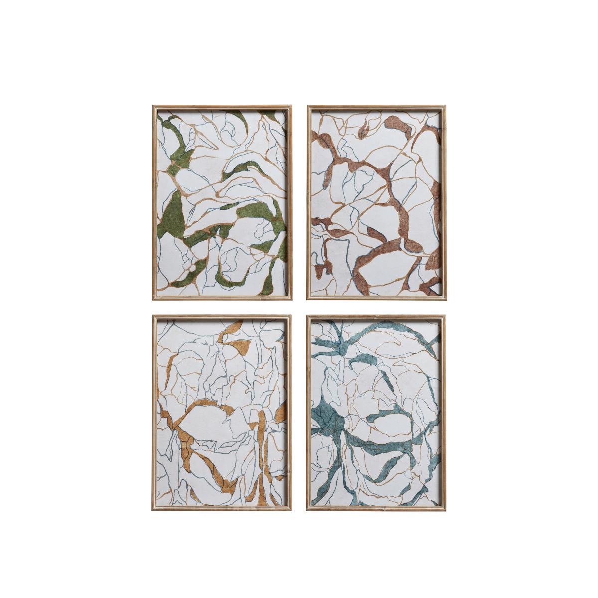 Our Ravina prints are abstract works of art that focus on line and contour. The meandering lines create spaces that are filled with warm, muted colours in a contemporary mosaic style that could blend into many different styles of interior. They work well as a set or, placed separately to draw the eye around the room. Framed in hand-distressed natural fir wood frames. Sold as a set of four.