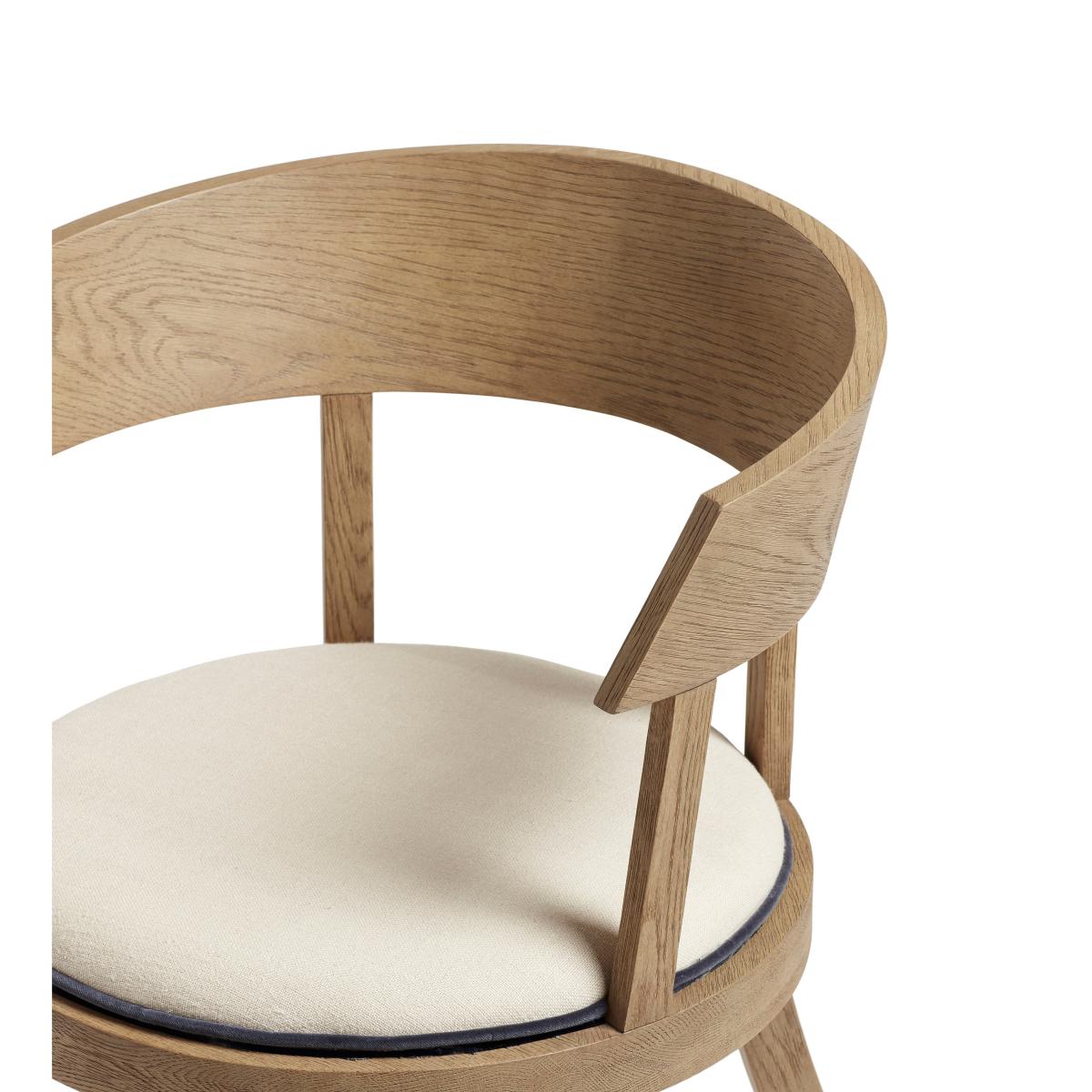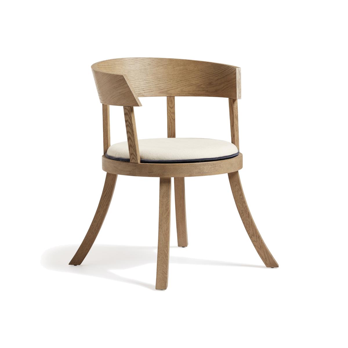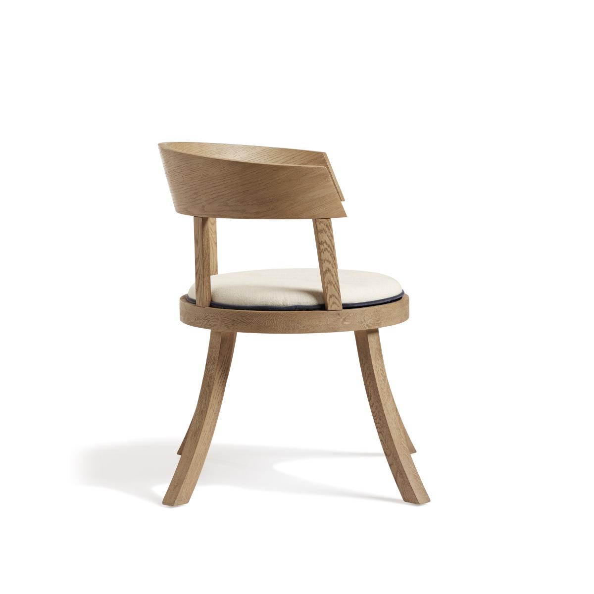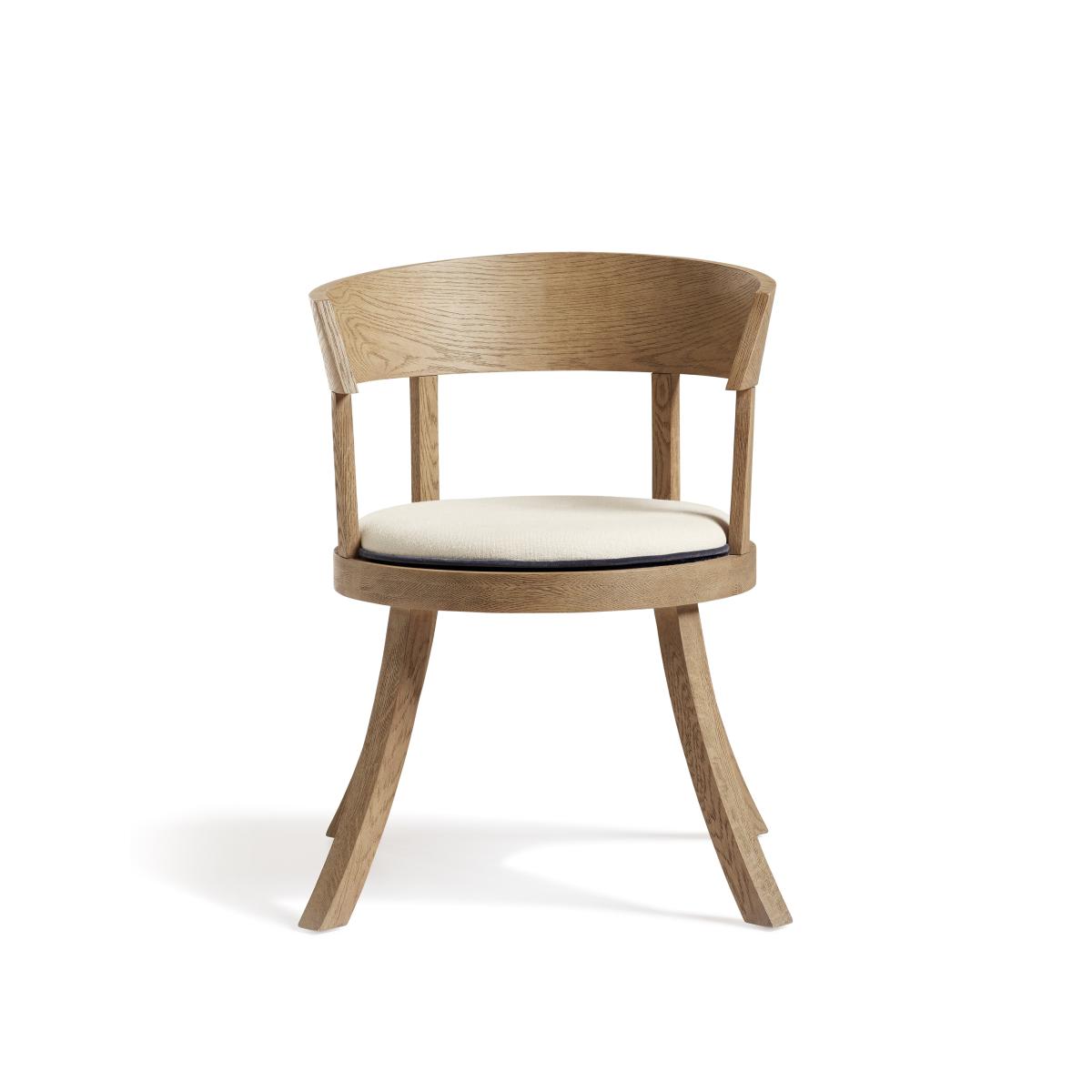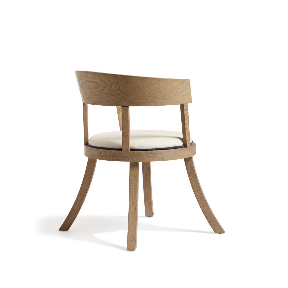 Rhodri has buckets of personality in his circular form. Its expressive solid oak legs not only provide support but mirror the curves of its generous frame. The removeable seat pad is upholstered in natural linen with sapphire velvet piping.