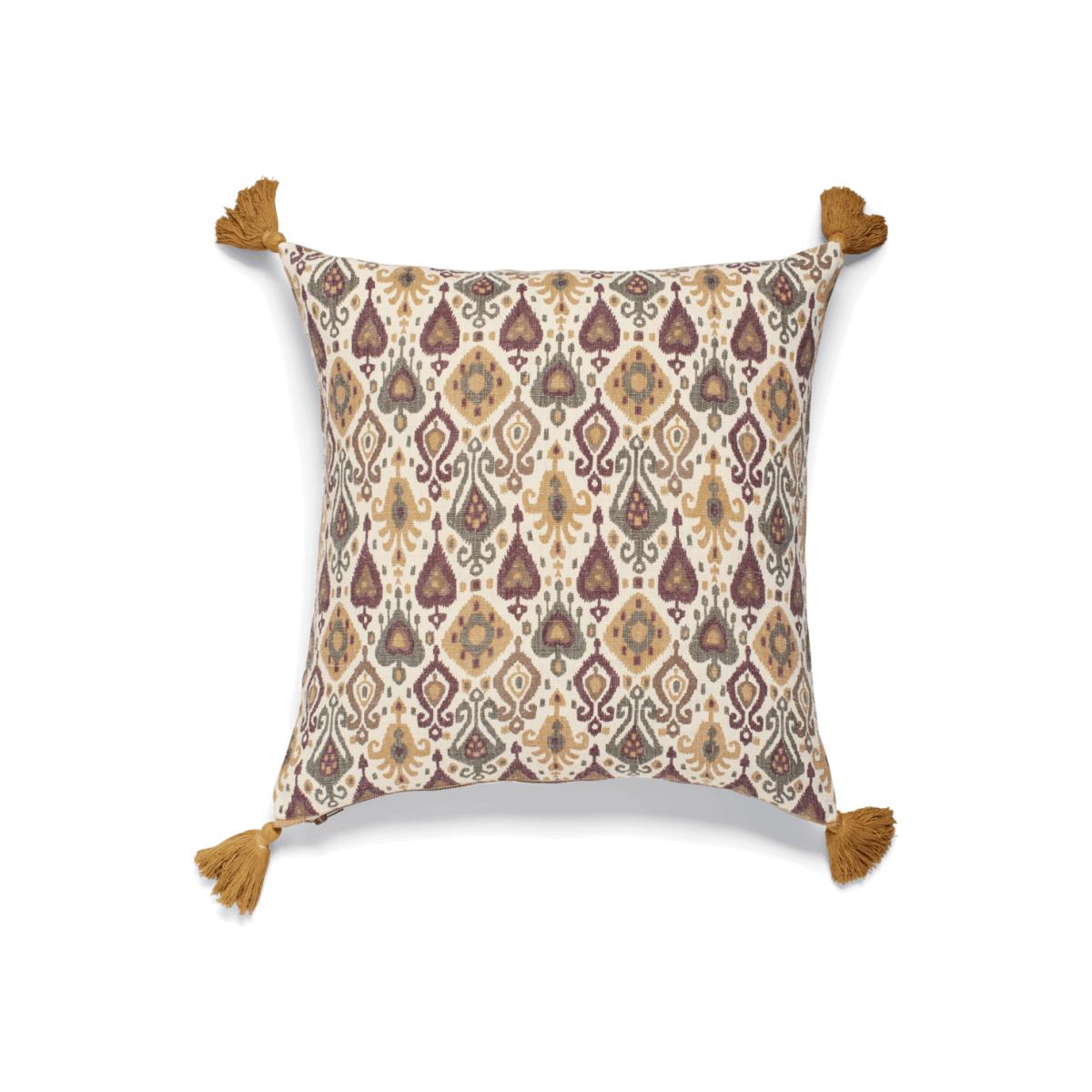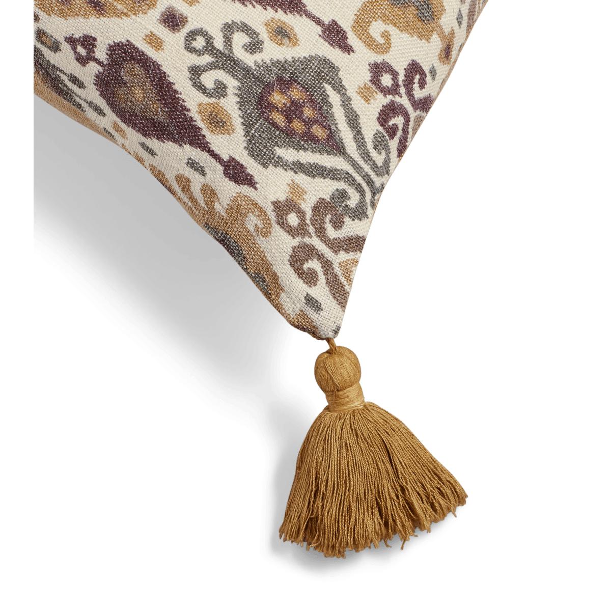 The Rima Cushion Cover offers wonderfully muted tones of gold, burgundy and green on a natural background. The tassled corners add a sense of fun to the more tradtional pattern. This cushion looks great layered with block colours and larger prints. Due to the screen printed linen and stone washing technique used artisan crafters, each cushion cover is unique.