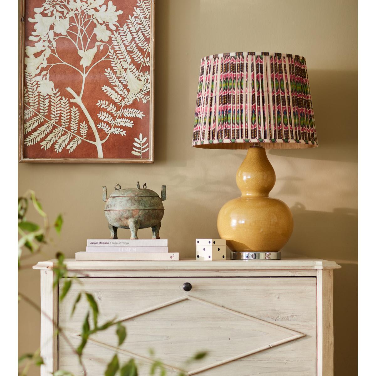 I love the OKA Rinca silk pleated lampshade for its vibrant, eye-catching pattern and elegant texture. Its 45cm size makes it versatile enough for both table and floor lamps, adding a touch of sophistication to various interiors. It's particularly well-suited to eclectic, bohemian, or tropical-inspired spaces thanks to its rich colours and intricate design, but it can also bring a burst of personality to more neutral schemes. For styling tips, pair it with warm brass or matte black bases to let the shade be the focal point, and consider complementing it with accessories in similar colours or patterns to create a cohesive look. Its luxe silk finish lends a slightly opulent feel, so it works especially well in living rooms, bedrooms, or reading nooks where a touch of elegance is appreciated.