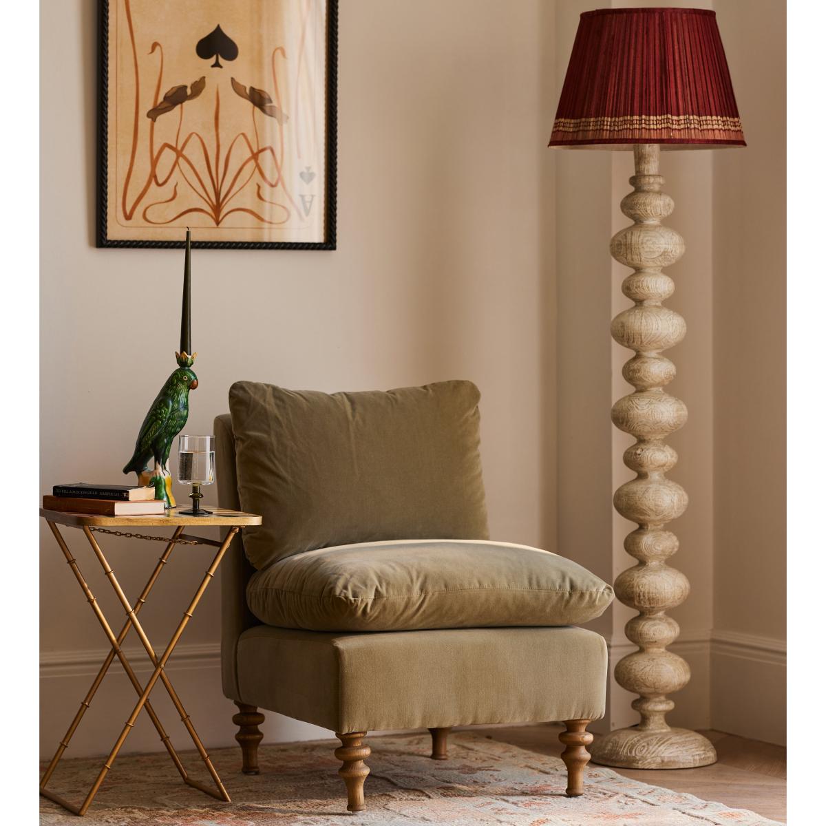 I love this slipper chair for its relaxed yet refined aesthetic, making it a versatile addition to both classic and contemporary interiors. Its soft Lichen velvet upholstery adds a touch of subtle colour and texture, perfect for creating a cosy corner or complementing a layered colour scheme. It works well in living rooms, bedrooms, or even a stylish reading nook. Practical styling tips include pairing it with a small side table and a statement lamp for functionality, or adding a coordinated cushion for extra comfort. Its slightly squat profile and inviting cushion make it ideal as an accent piece that doesn’t overpower, while the turned wooden legs add a traditional touch that grounds the look.