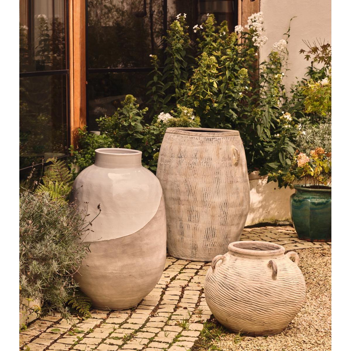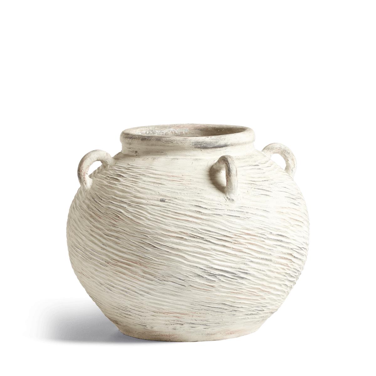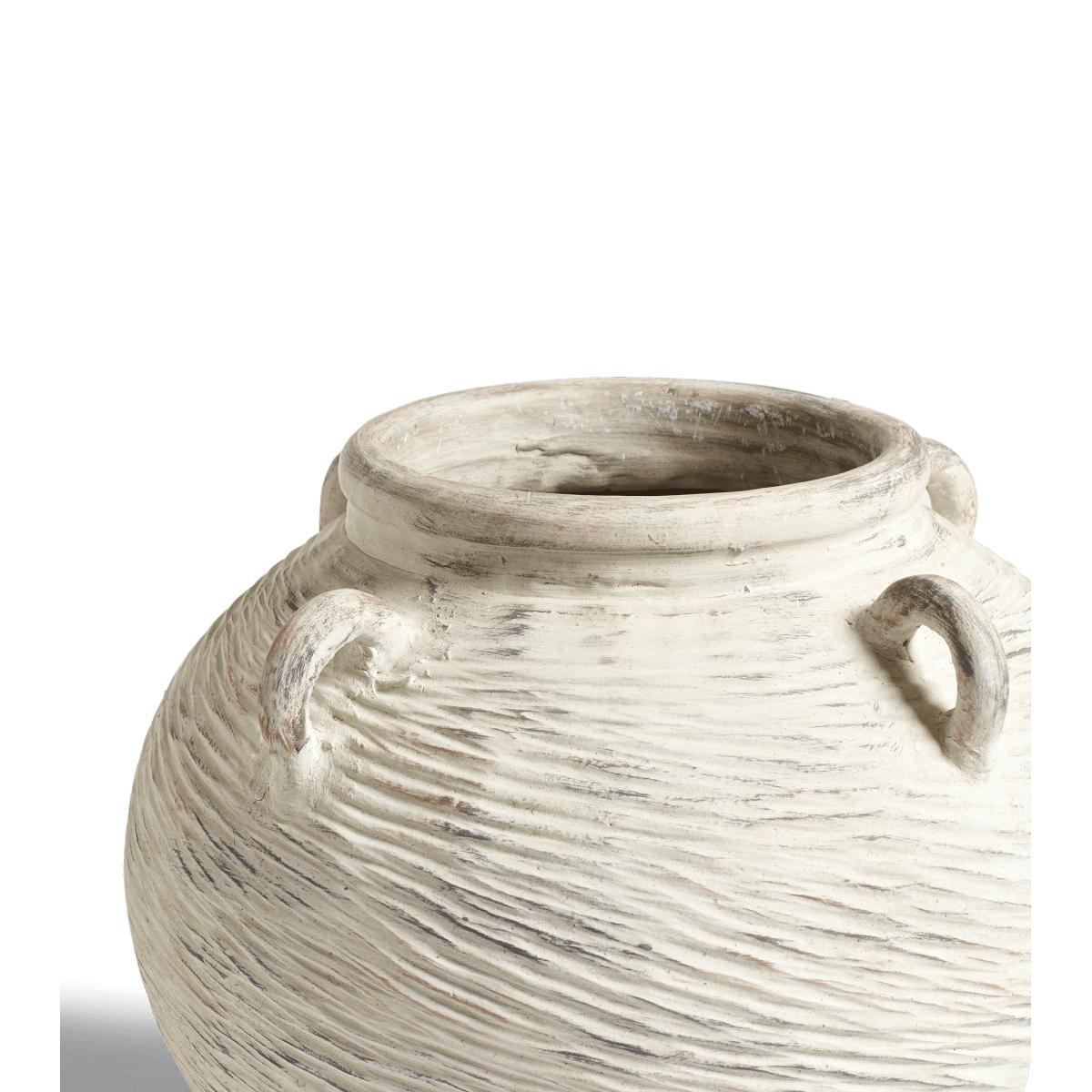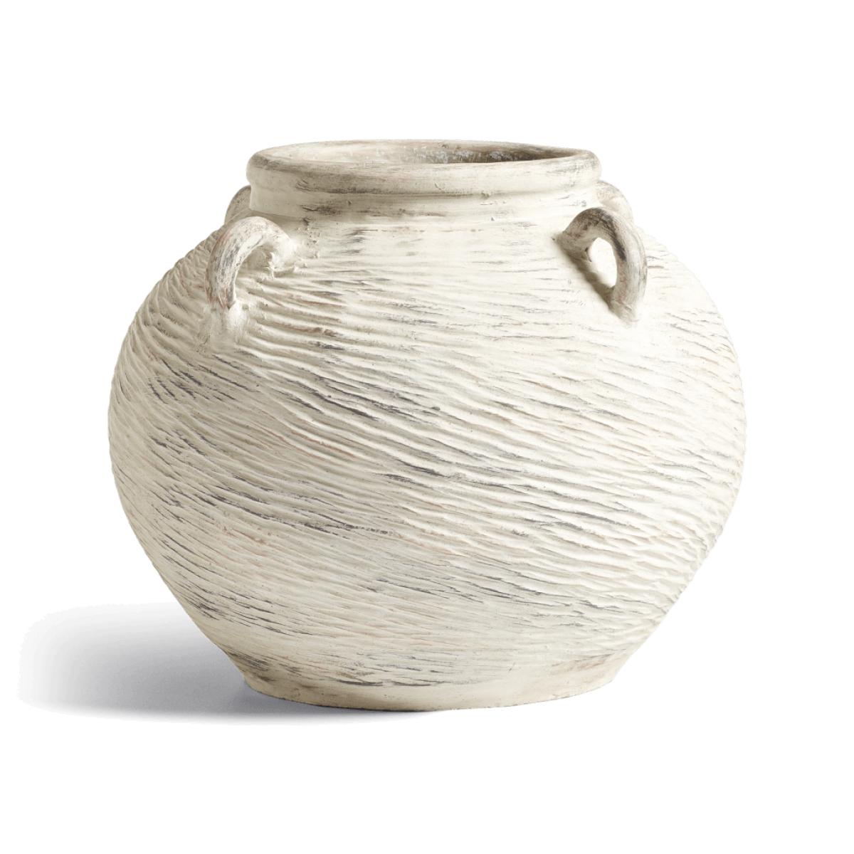 Our Round Chasca Planter has a definite Romanesque feel to it. Where Greek pottery was often painted, Roman pottery could be distinguished mainly by having pattern carved into its surface, and the curvaceous form of our Chasca is no different, its coarse surface etched with pleasingly uneven, sweeping indentations. The planter is finished in brushed white with four handles sitting on its shoulders.