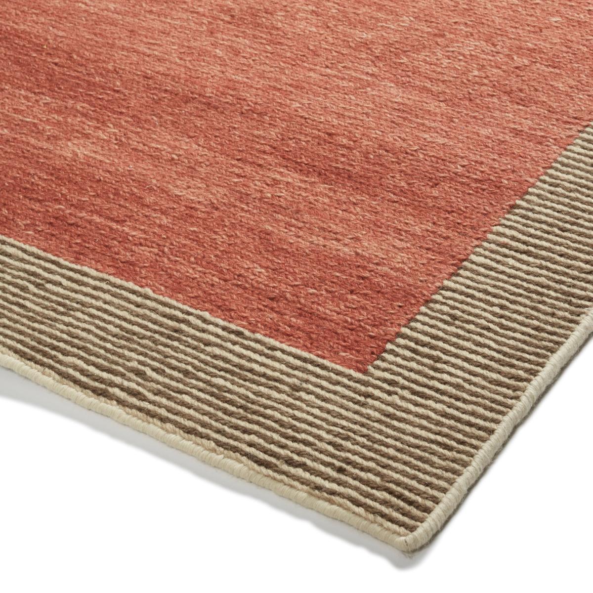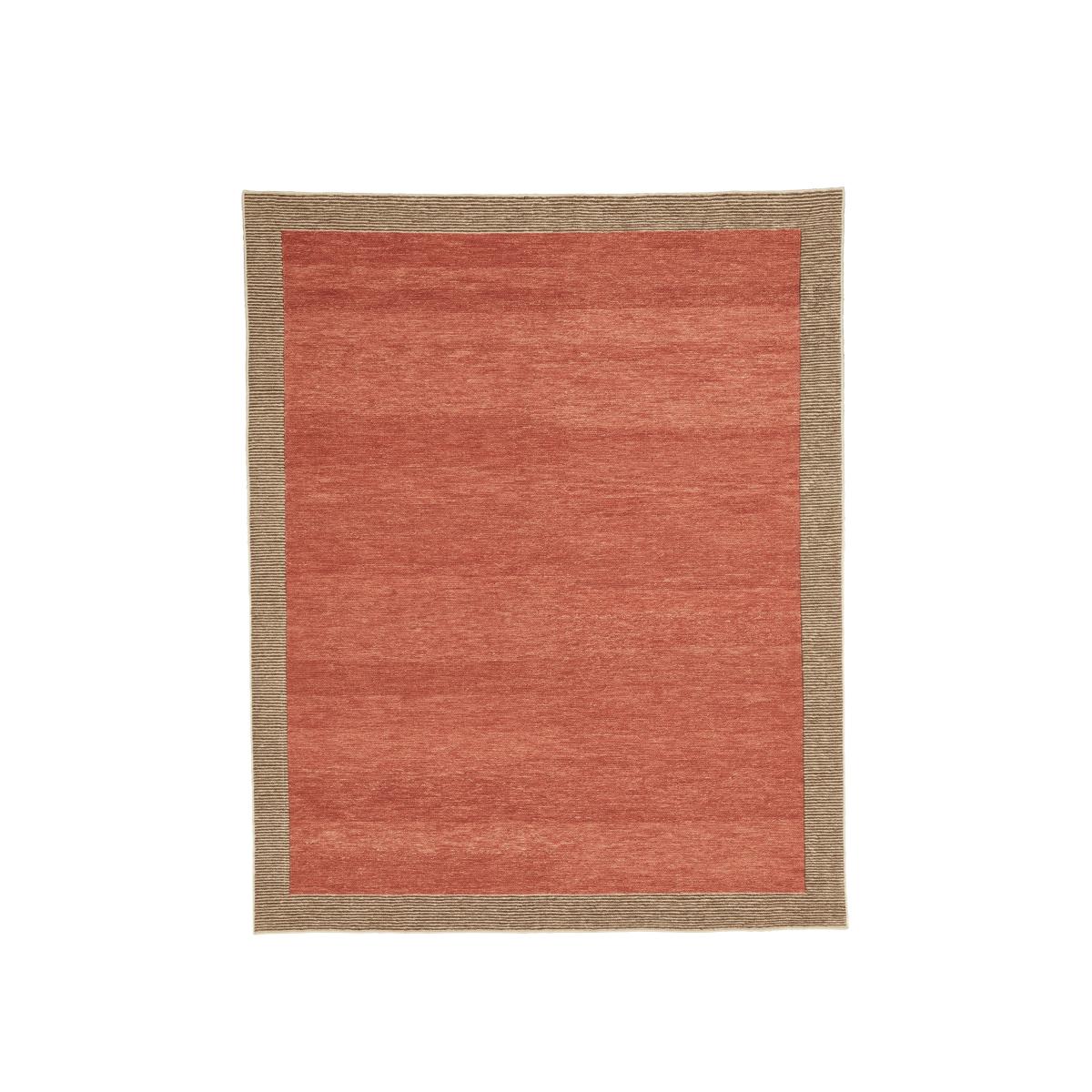 Named for its scarlet hue, our Rubia Rug is handwoven with a soumak tapestry technique. This is a flat weave involving tightly wrapping weft (horizontal) threads around the warp (vertical) threads for an incredibly strong and thick finish. The rug is washed for an antique effect and bobbles formed in the weaving process are individually sheared for a smoother finish. This artisanal process will result in each piece having individual characteristics that add to its charm. Its Dark Taupe border beautifully frames the red-orange centre.